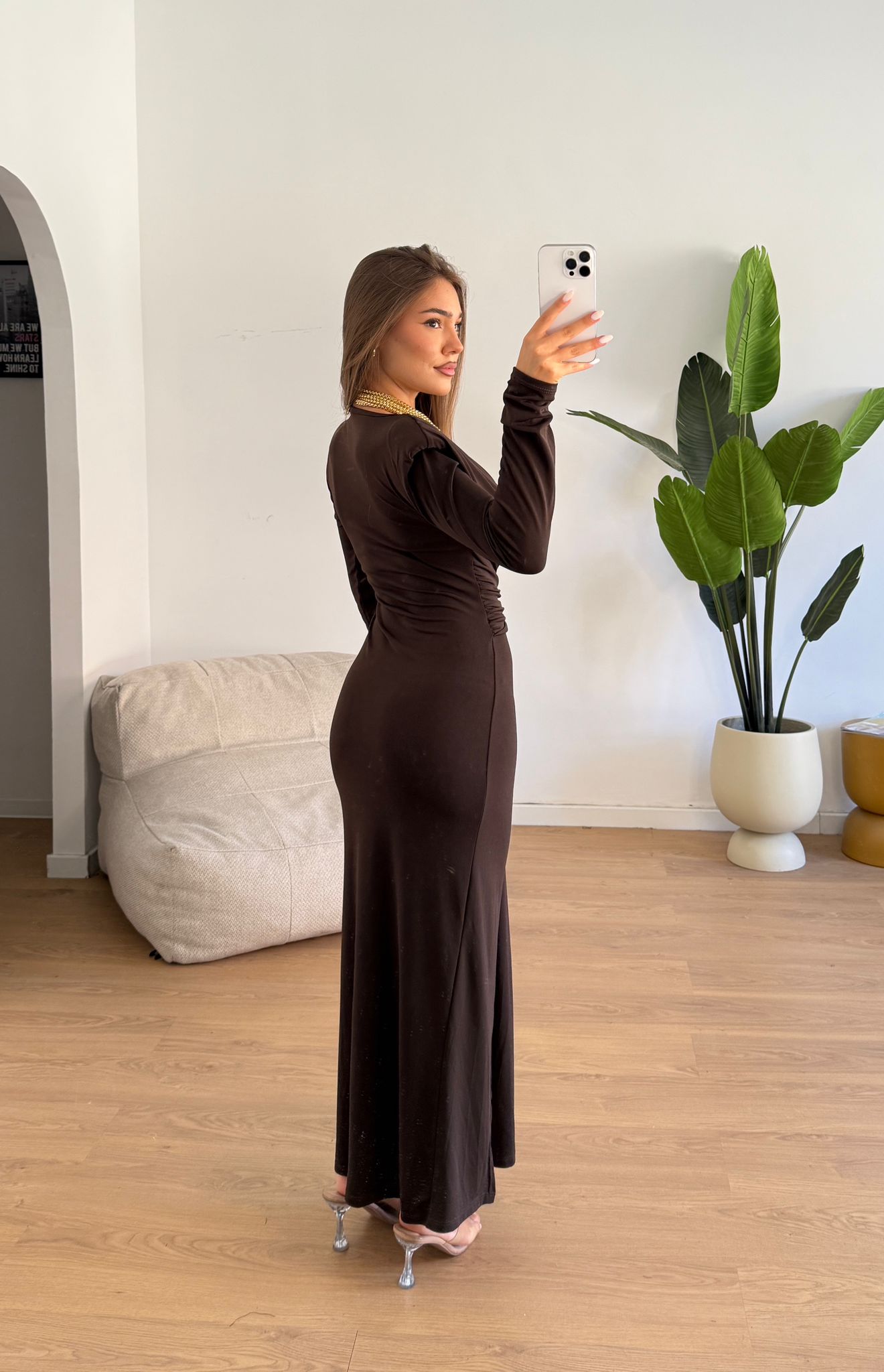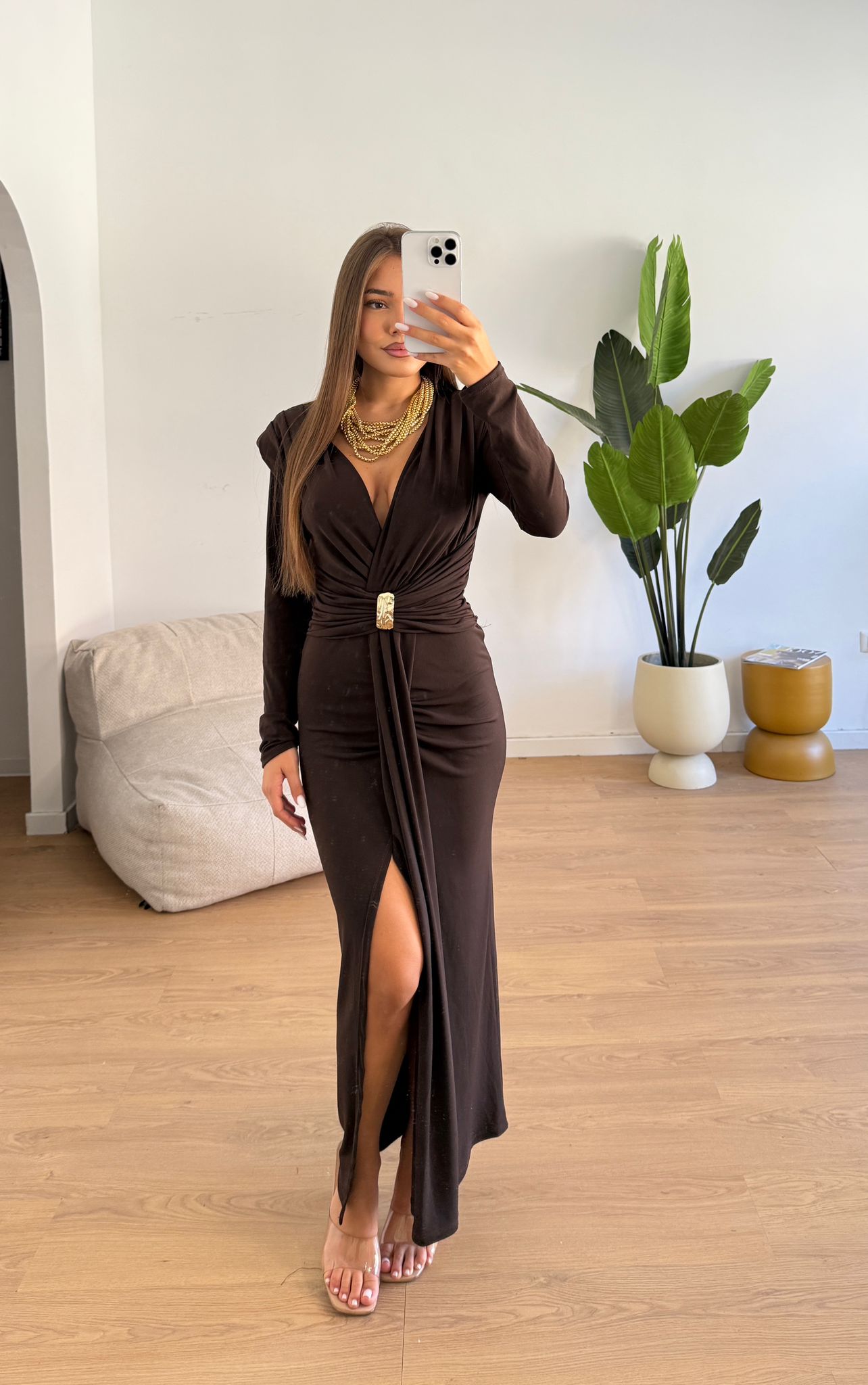 Abito da donna con spalline imbottite, scollo a V e spacco sul davanti. Tessuto elasticizzato, veste bene fino ad una 44.