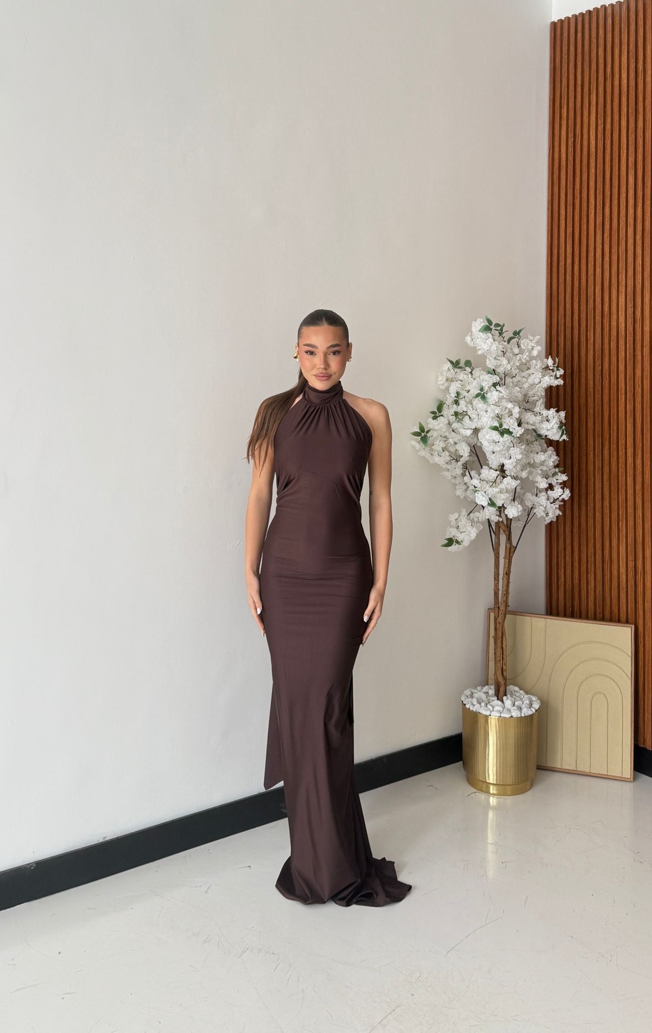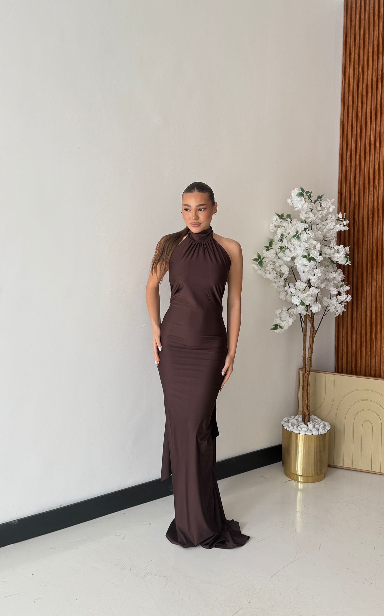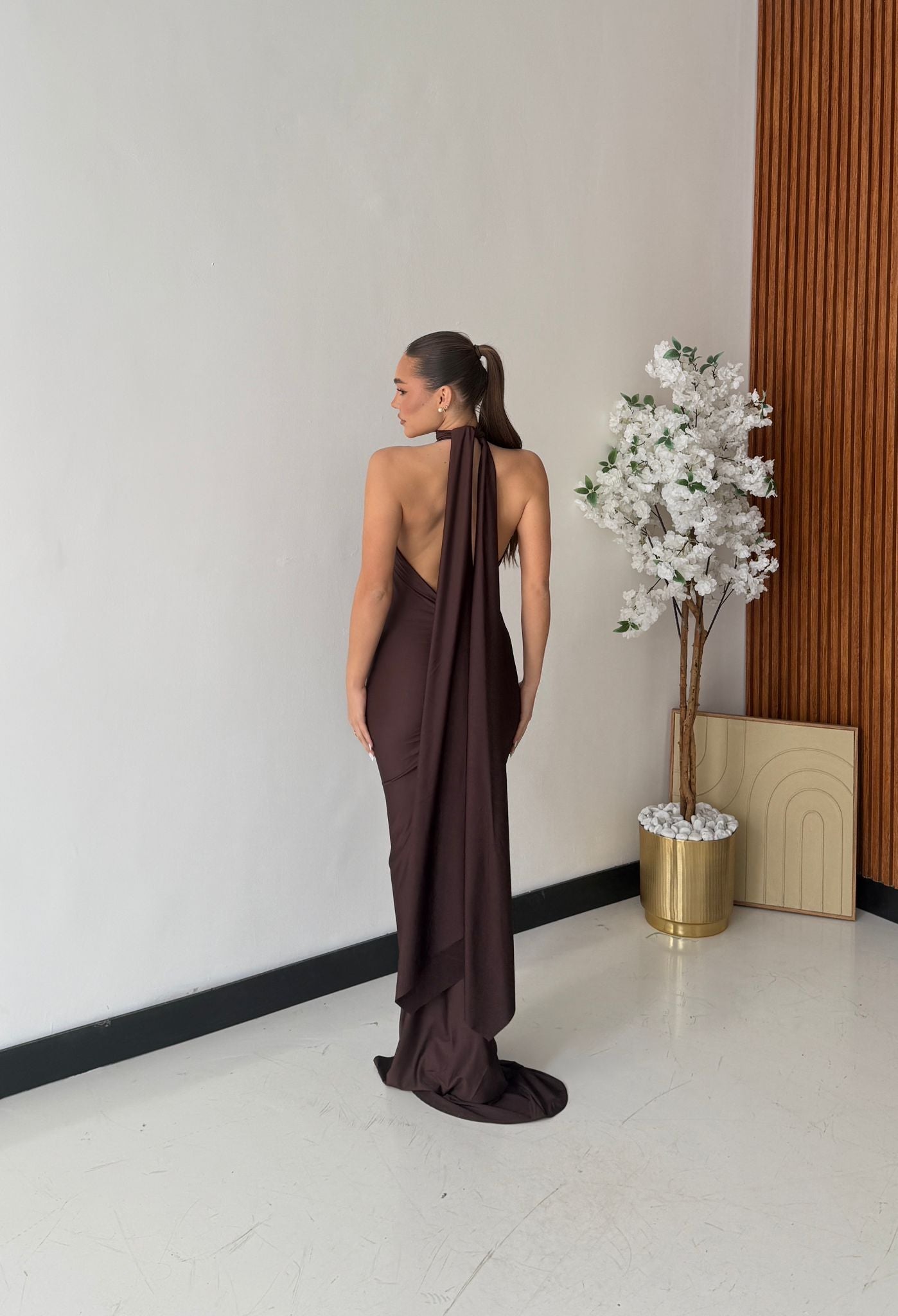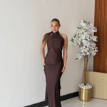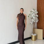 Abito in lycra, effetto satin con scollo profondo sul retro, chiusura sul retro del collo con laccio regolabile e drappeggio sul retro. Taglia unica, tessuto elasticizzato, veste bene fino ad una taglia M piena. La modella è alta 1,65 e pesa 52/53kg.