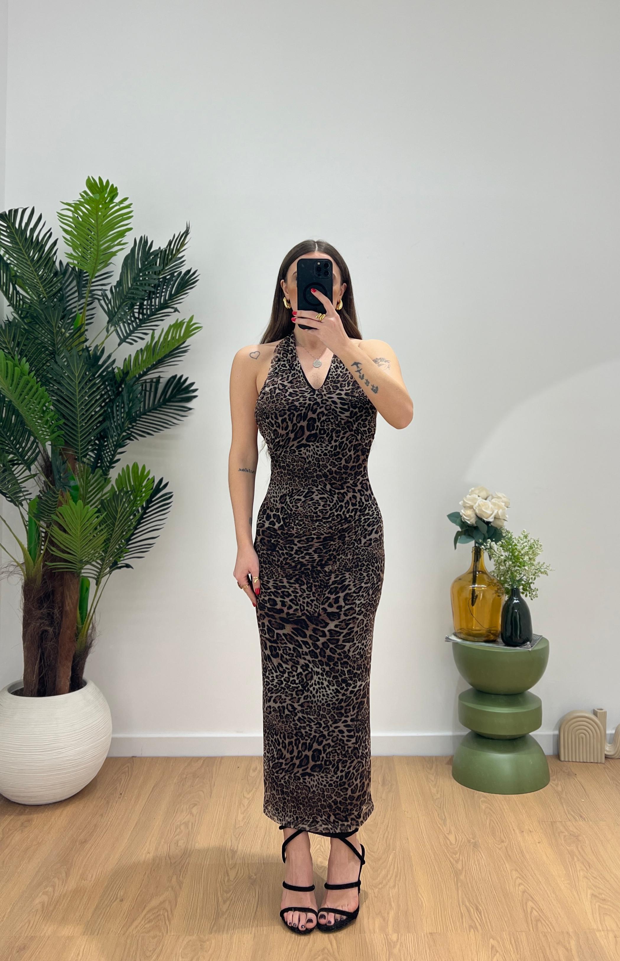 Abito da donna fantasia animalier,tessuto elasticizzato con fodera interna, non traspare e con schiena scoperta. Vestibilita fino ad una M/L