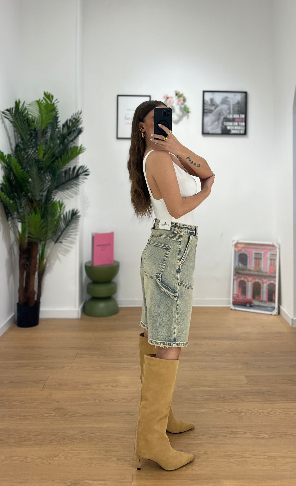 Bermuda da donna in denim effetto slavato tessuto elasticizzato ma veste regolarmente la propria taglia e giusy indossa taglia XS
