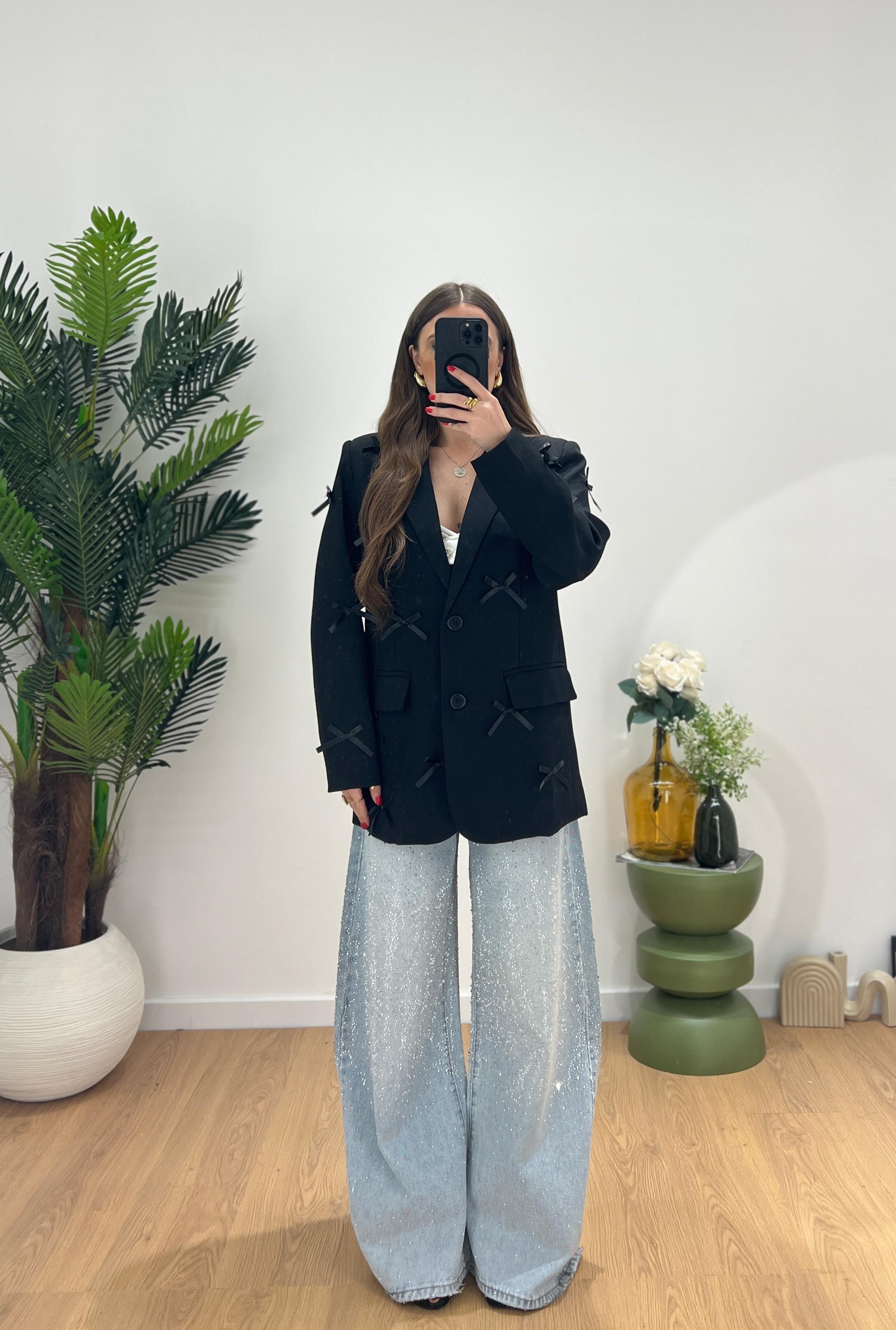 Blazer da donna top quality foderata internamente e con spalline imbottite e applicazione fiocchi non rimovibili. Veste regolarmente la propria taglia e Giusy indossa taglia S