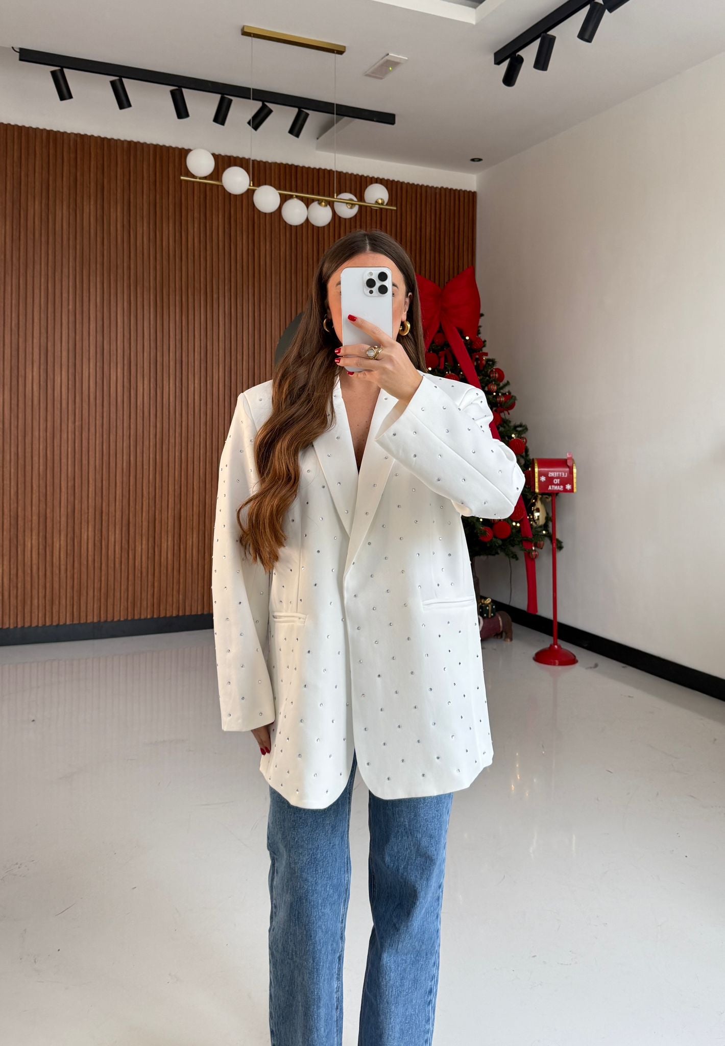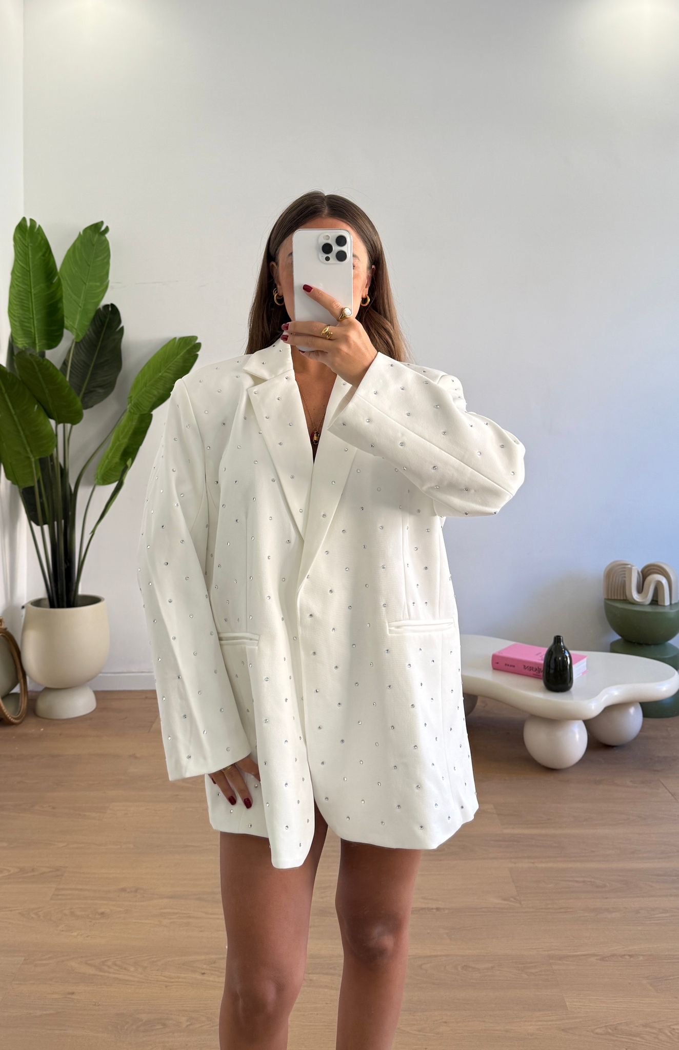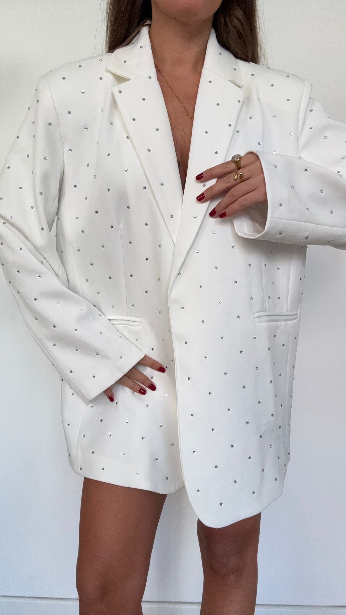 Blazer da donna con spalline imbottite, foderato internamente con applicazione strass, vestibilita over ma veste regolarmente la propria taglia e la modella indossa taglia S/M