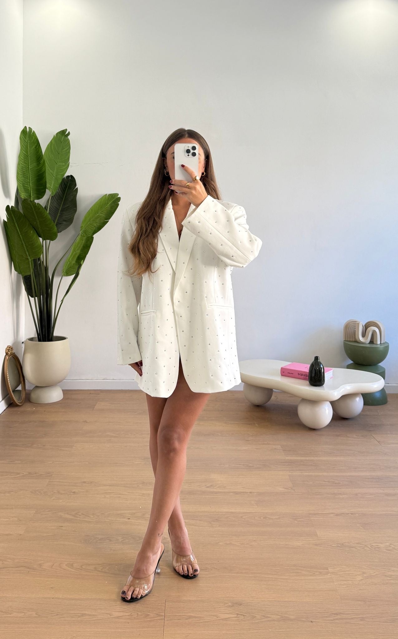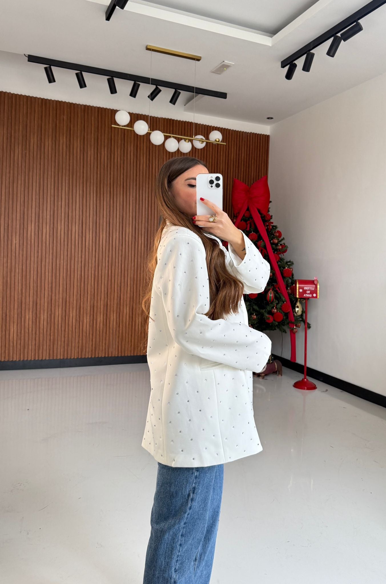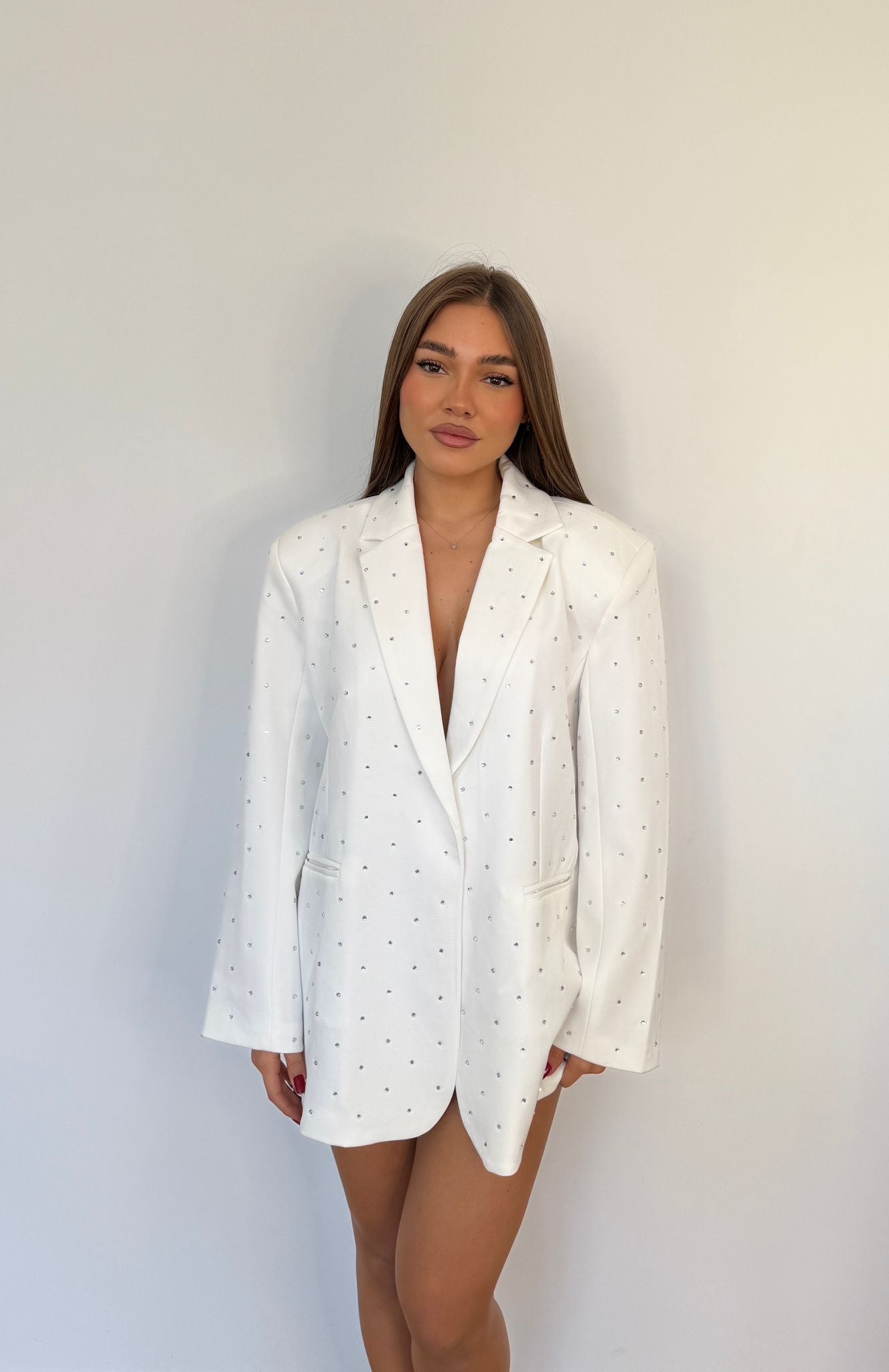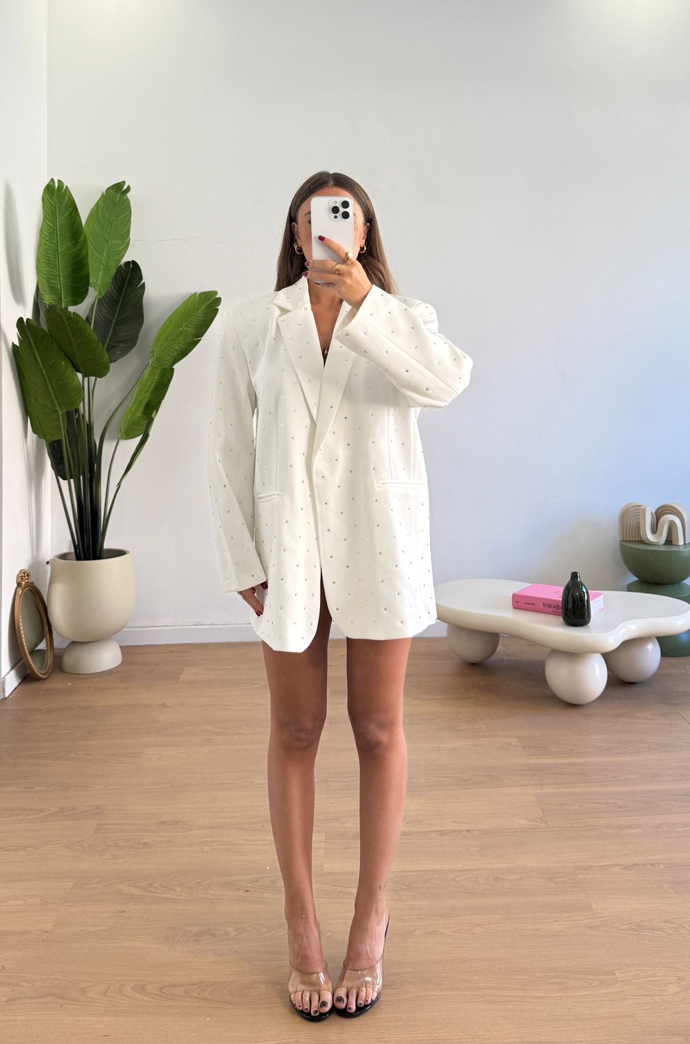 Blazer da donna con spalline imbottite, foderato internamente con applicazione strass, vestibilita over ma veste regolarmente la propria taglia e la modella indossa taglia S/M