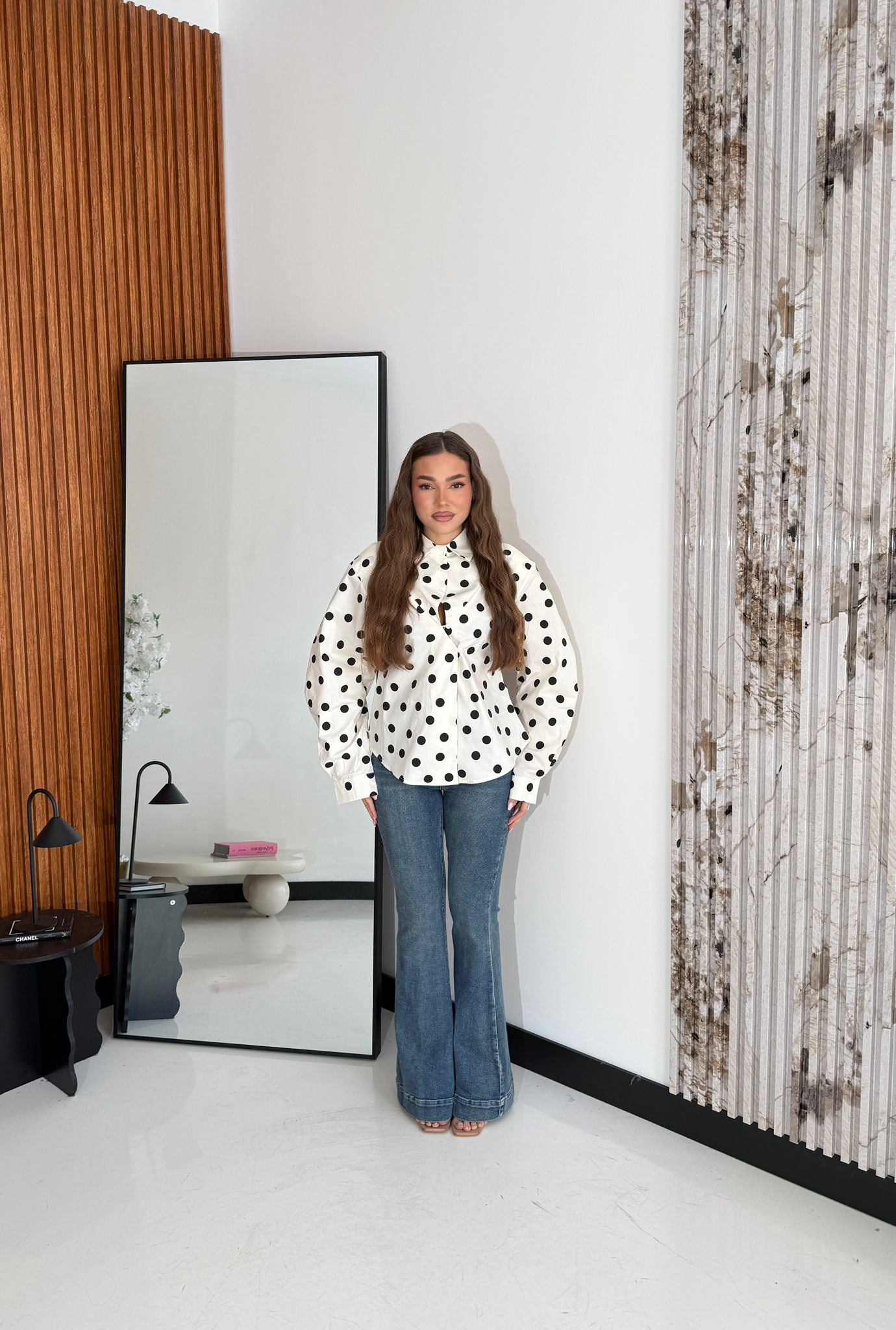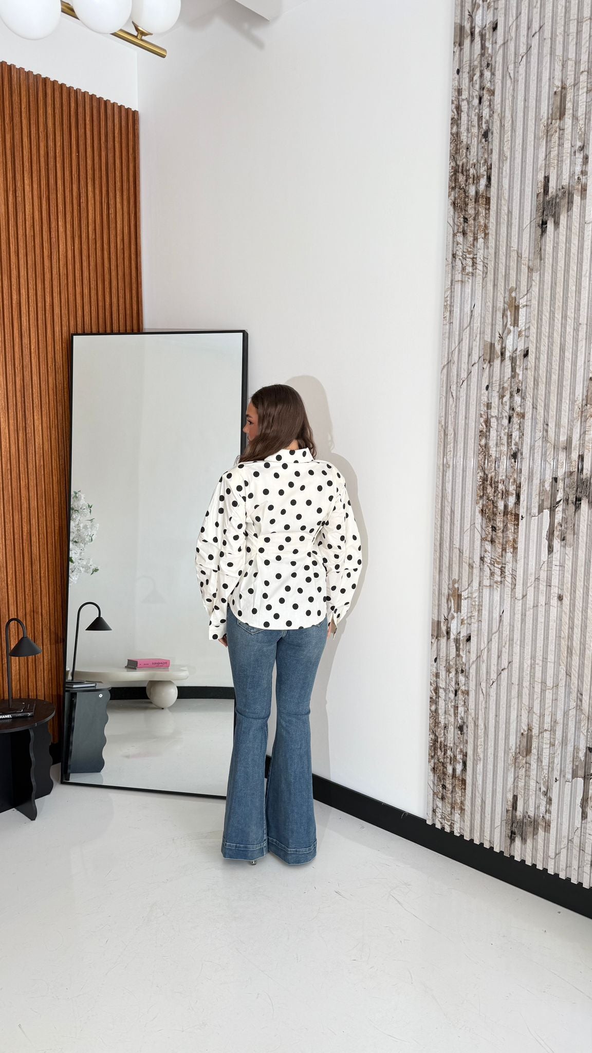 Camicia da donna a pois, tessuto non elasticizzato, con spalline imbottite, manica a sbuffo e chiusura asimmetrica a bottoncini sul davanti. Veste regolarmente la propria taglia, la modella indossa taglia S/M ed è alta 1,65 e pesa 52/53kg.