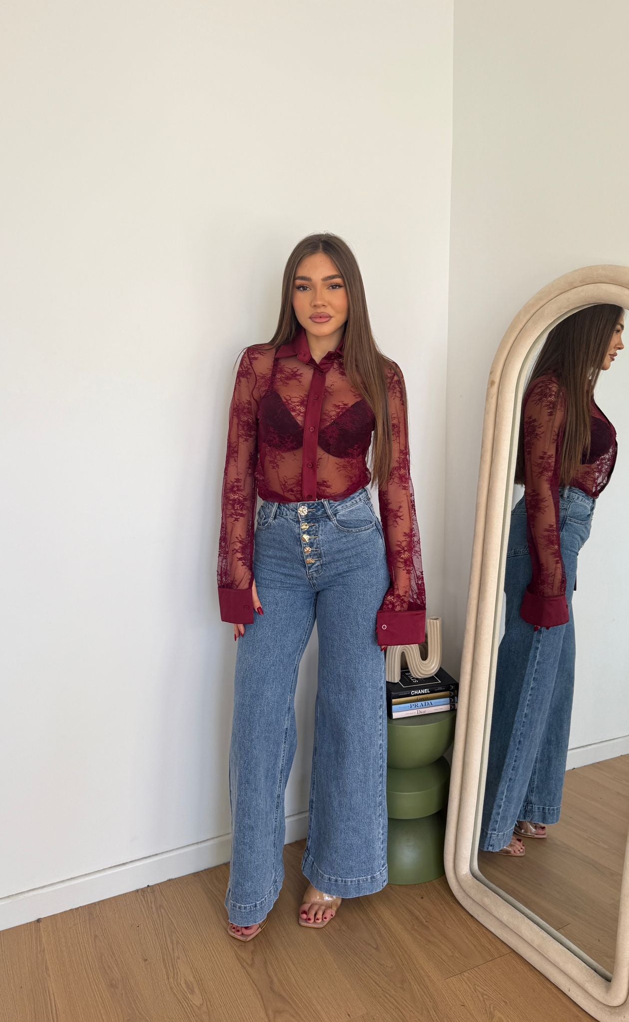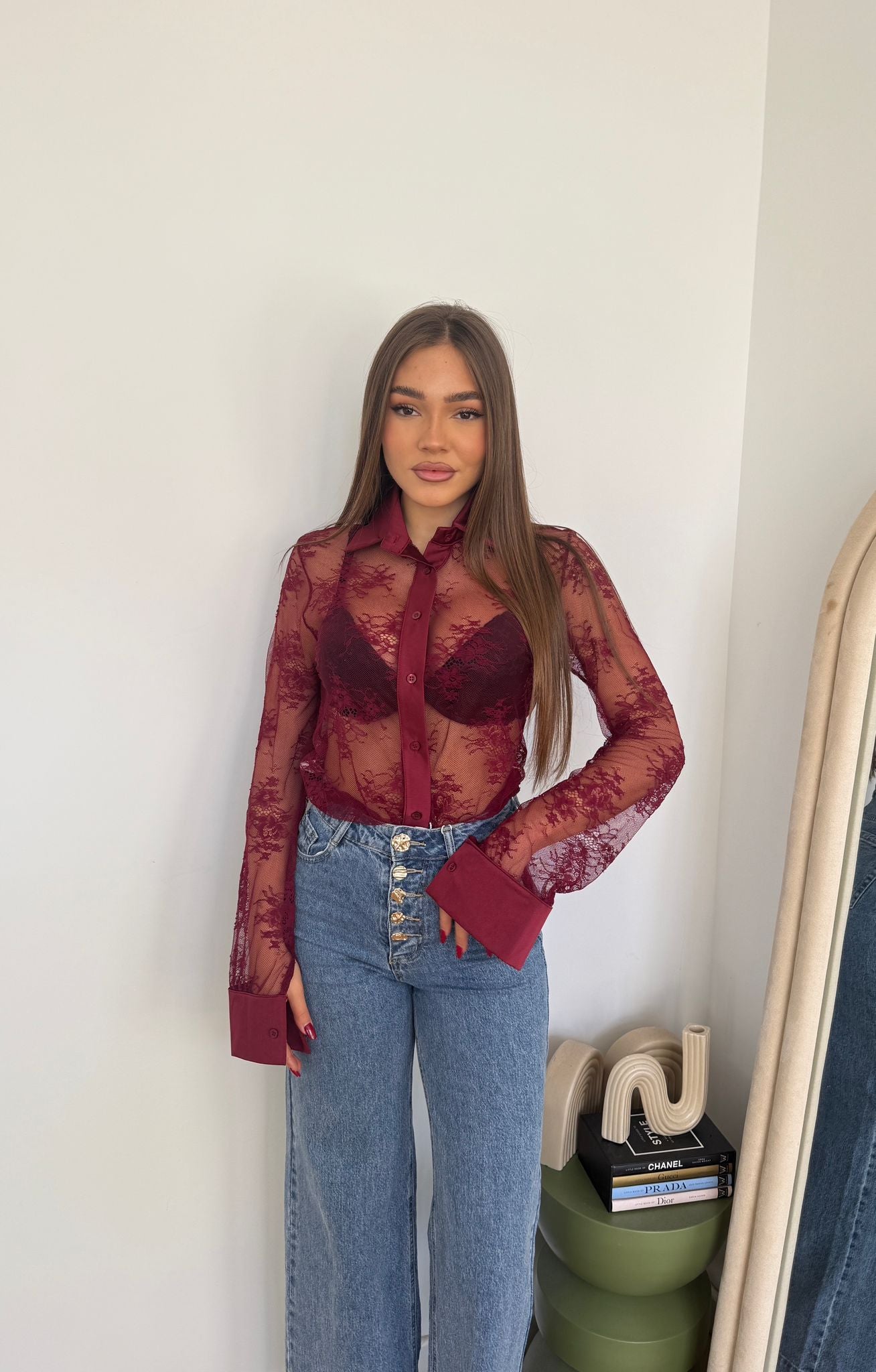 Camicia da donna in pizzo velata tessuto elasticizzato e vestirà bene fino ad una M piena