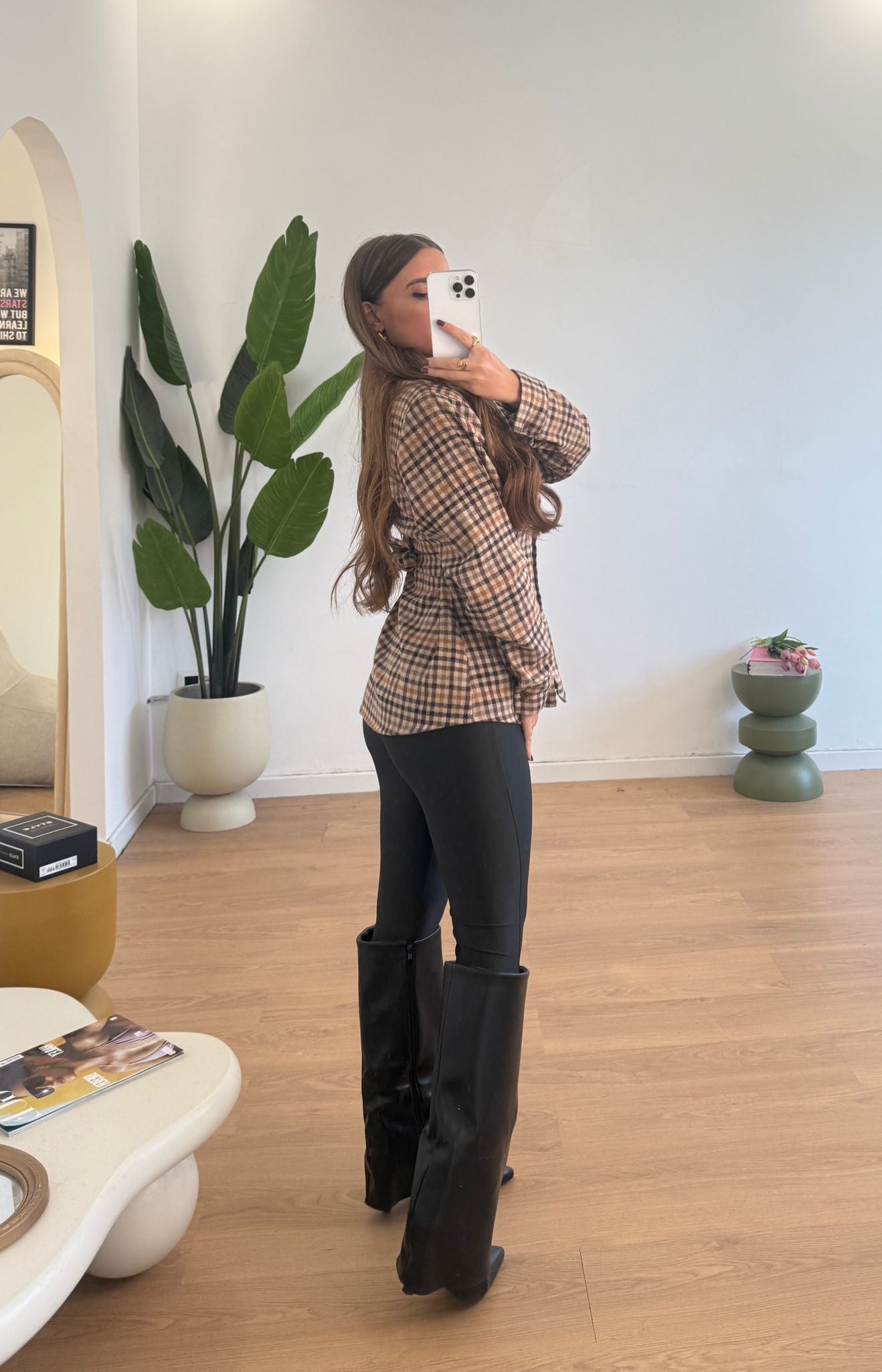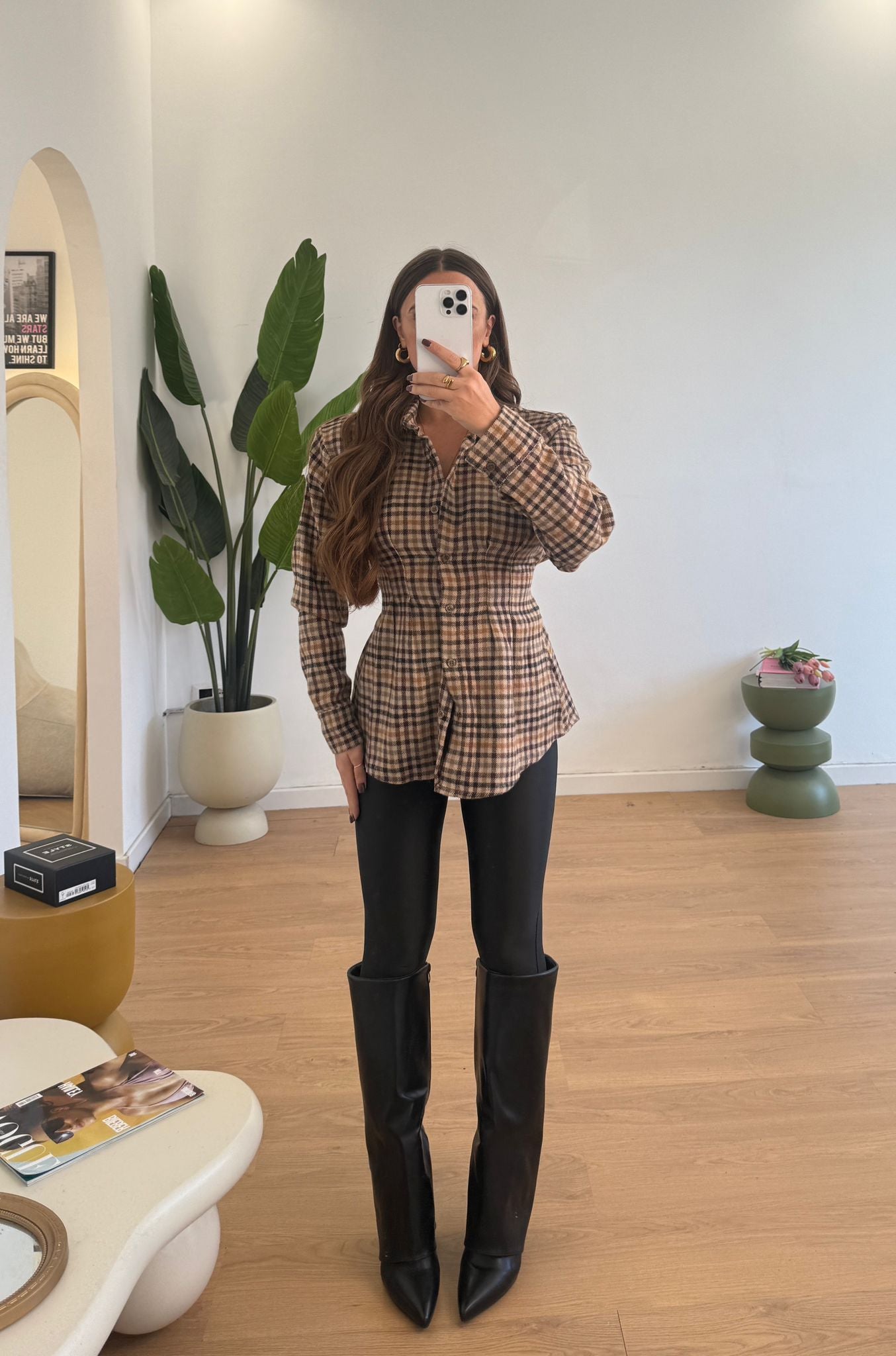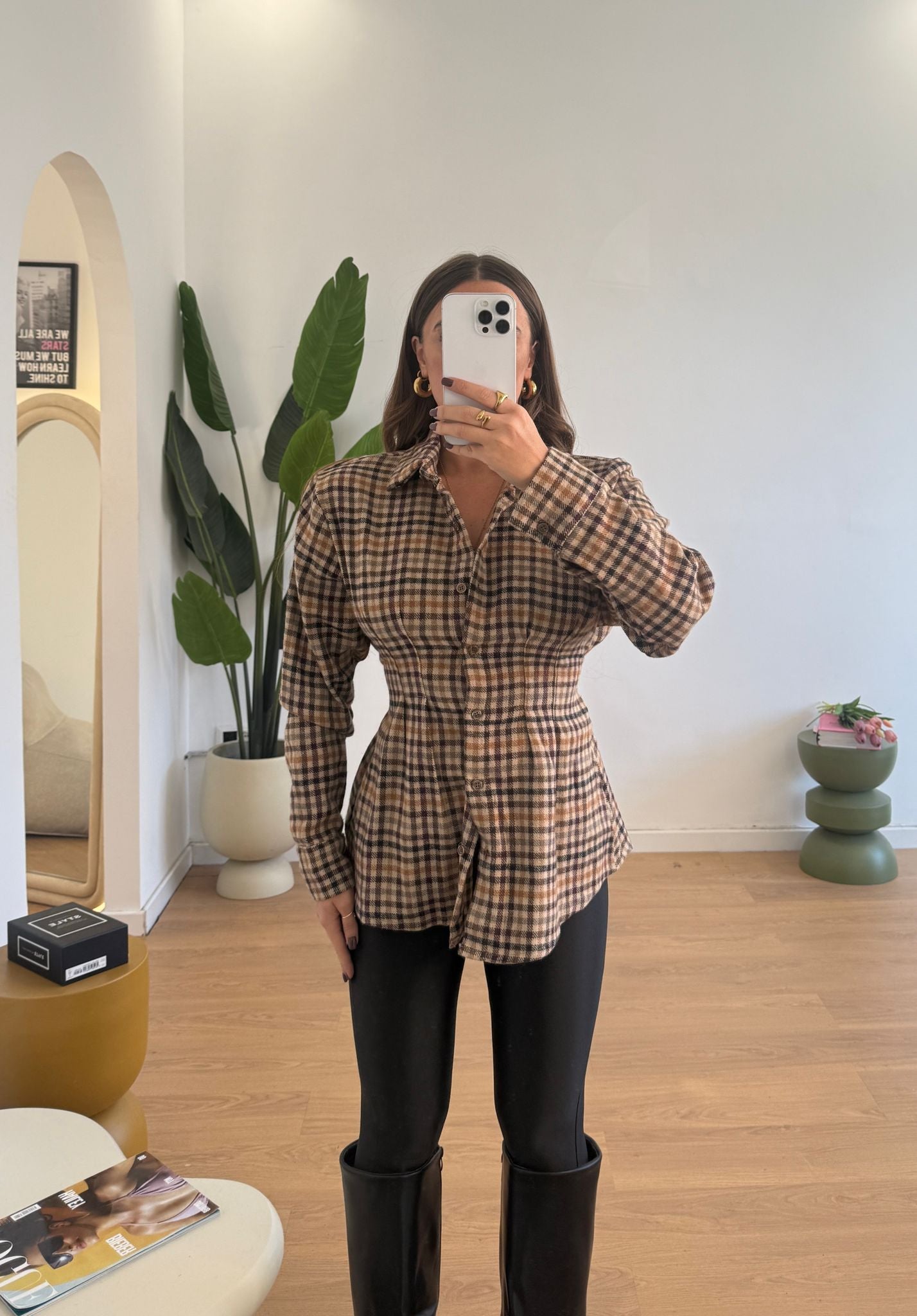 Camicia da donna in flanella, con coppe imbottite, chiusura a bottoni e fiocco sul retro.
