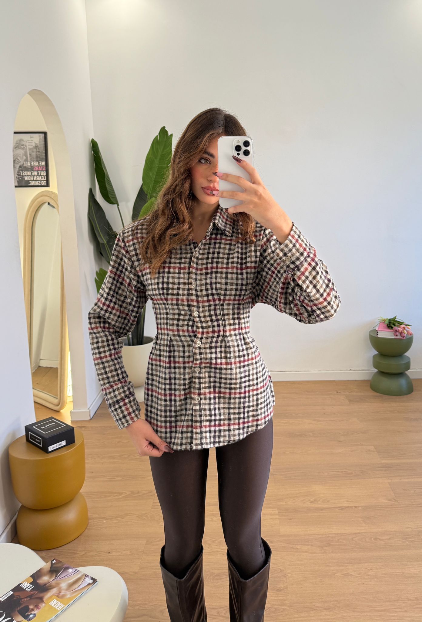 Camicia da donna in flanella, con coppe imbottite, chiusura a bottoni e fiocco sul retro.