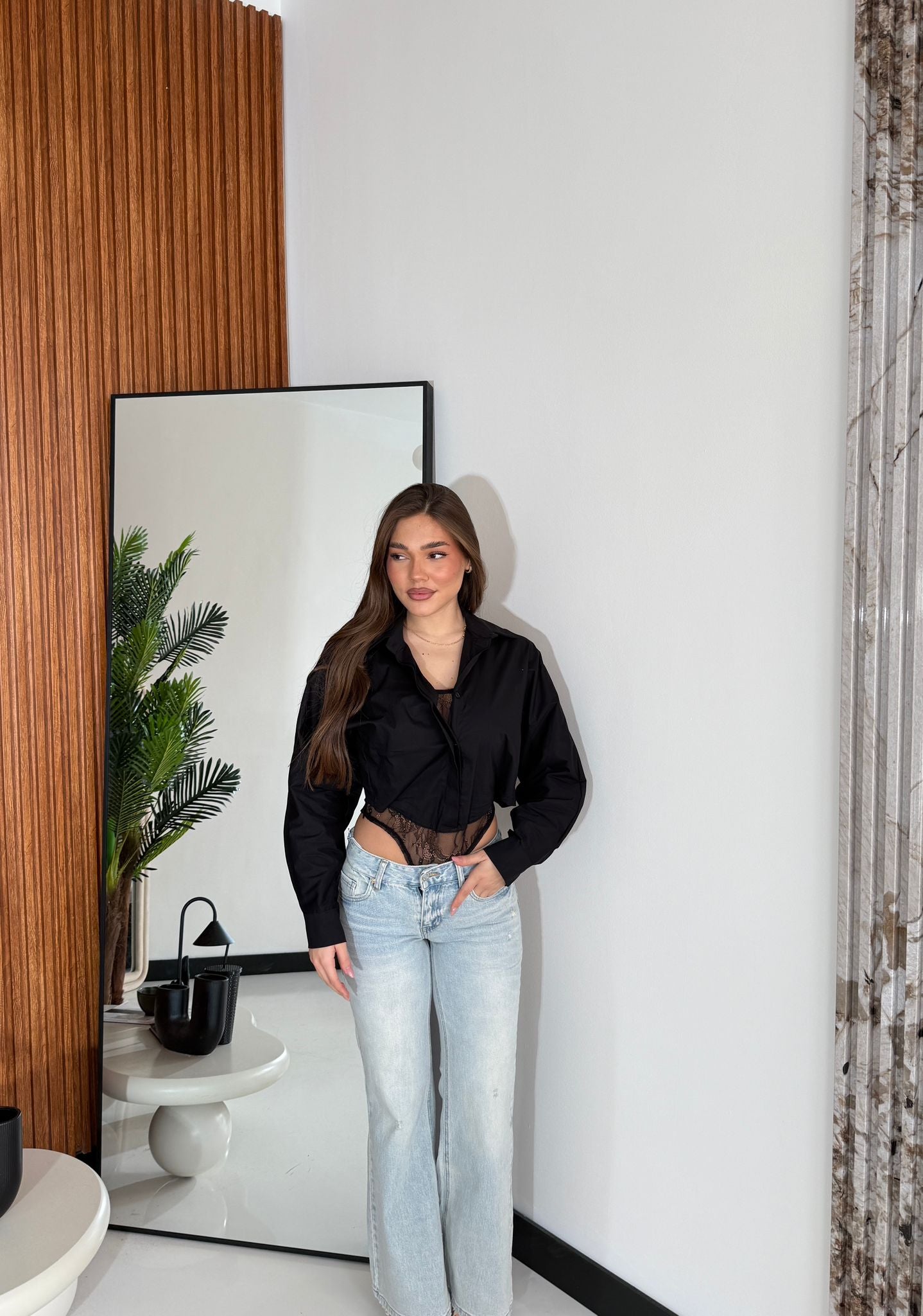 Camicia con body ricamato cucito internamente e vestita bene fino a dina M/L e la modella è alta 1,65 cm e pesa 52/63 kg
