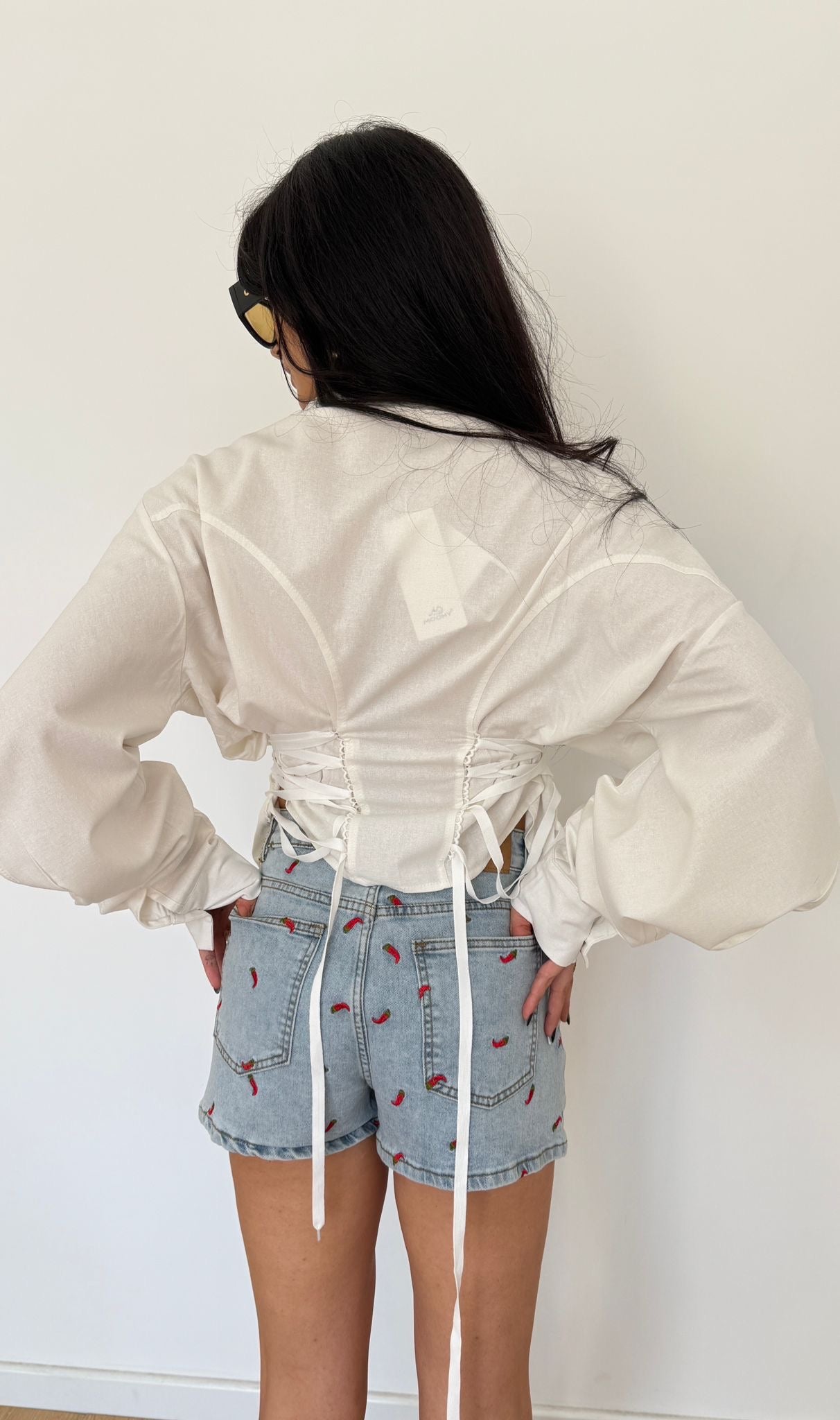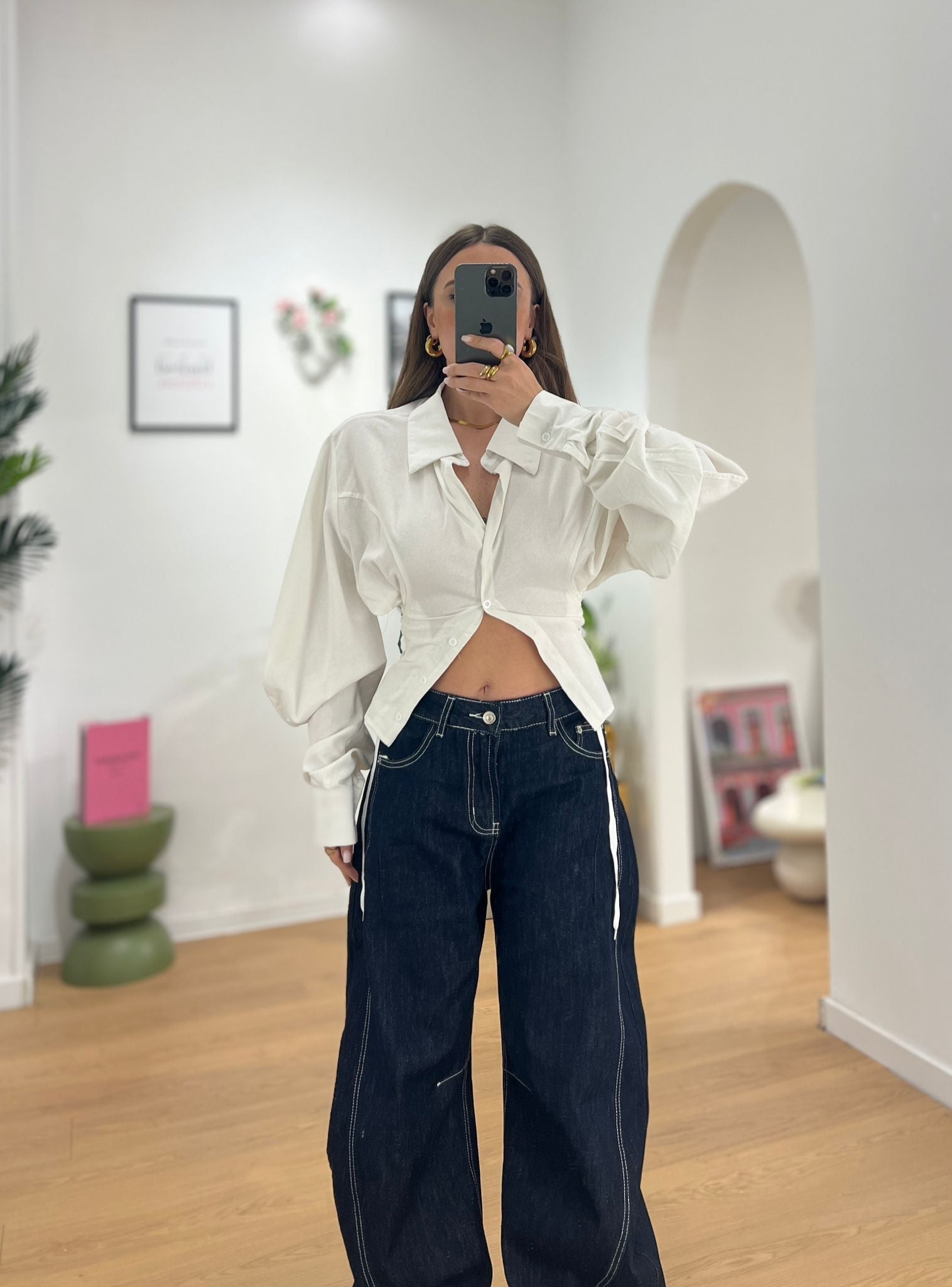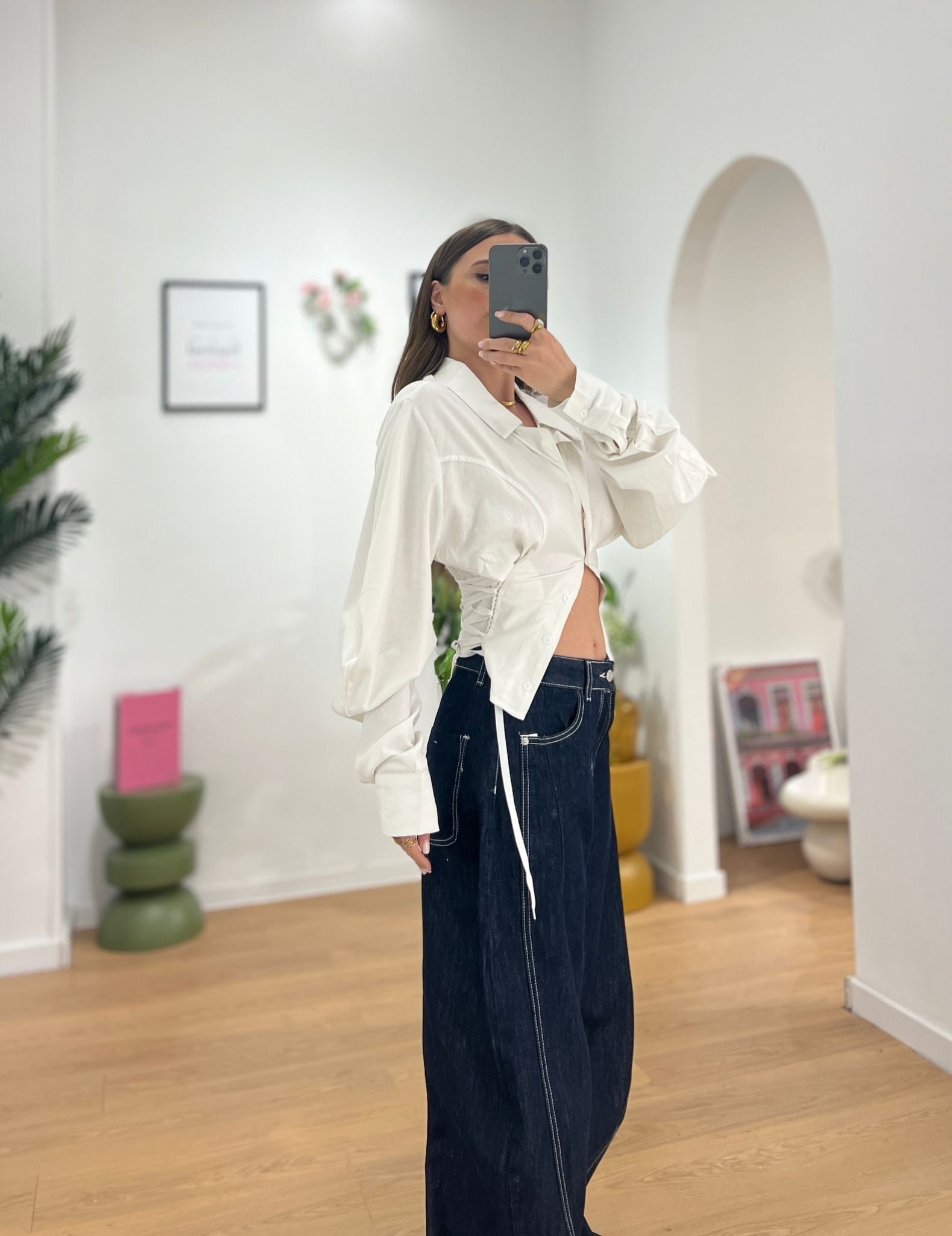 Camicia da donna in semi lino con intreccio laccio ai lati regolabili, veste regolarmente la propria taglia e giusy indossa taglia S/M