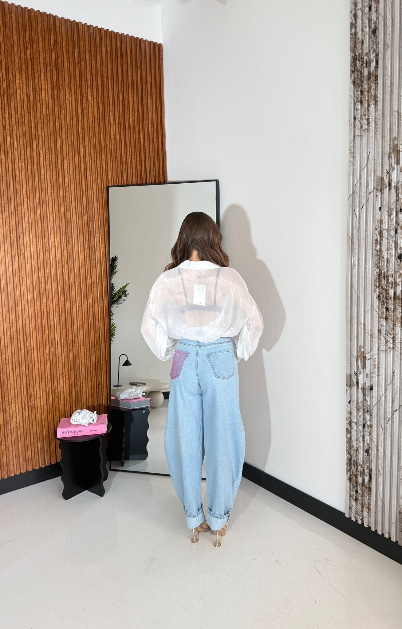 Camicia da donna completamente semi velata, effetto satin con manica a sbuffo e polsini con elastico. Veste bene fino ad una M/L e la modella è alta 1,65 cm e pesa 52/53 kg.
