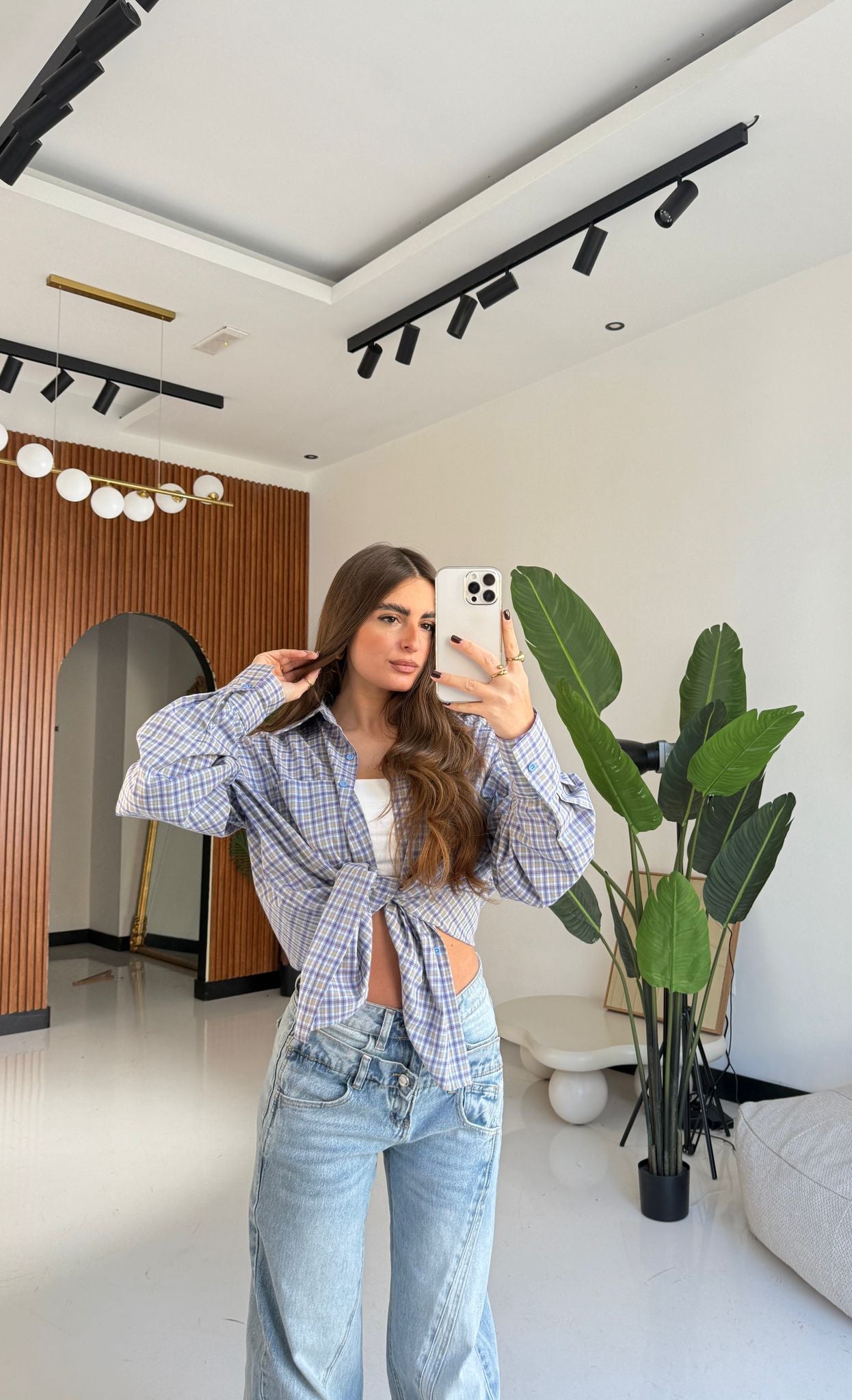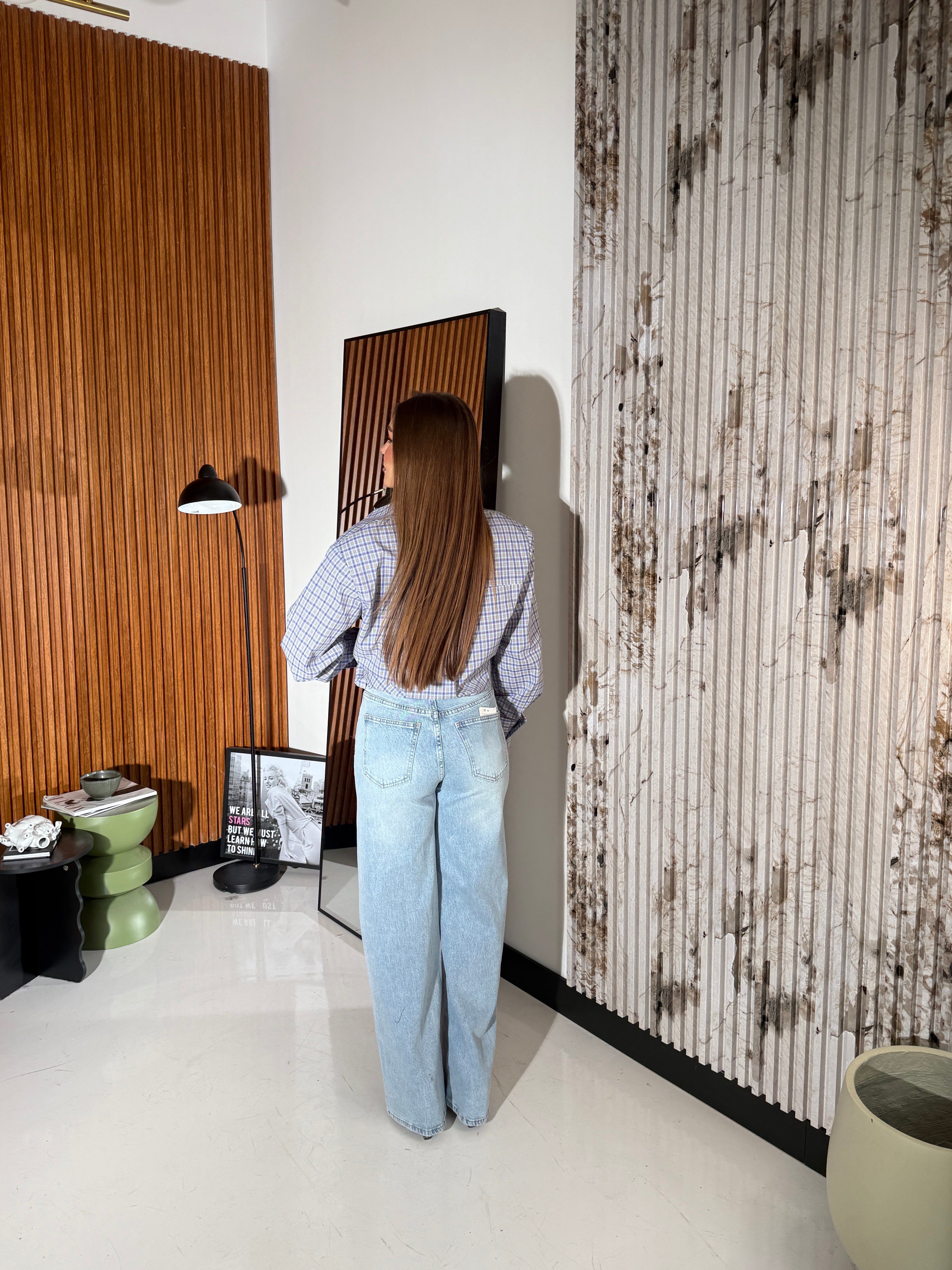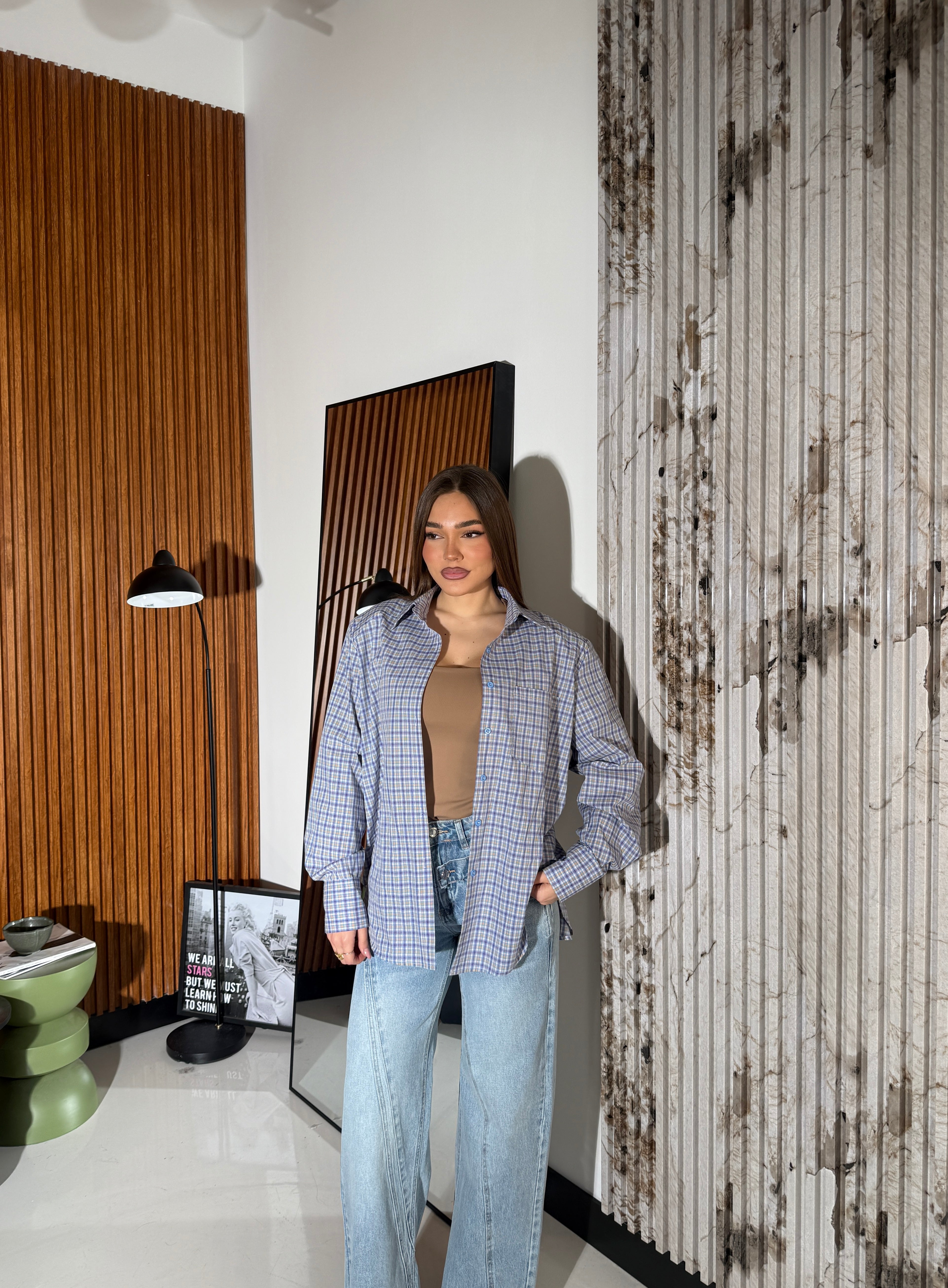 Camicia da donna con spalline strutturate, vestibilità oversize e vestirà bene fino ad una M/L piena. La modella è alta 1,65 cm e pesa 52/53kg