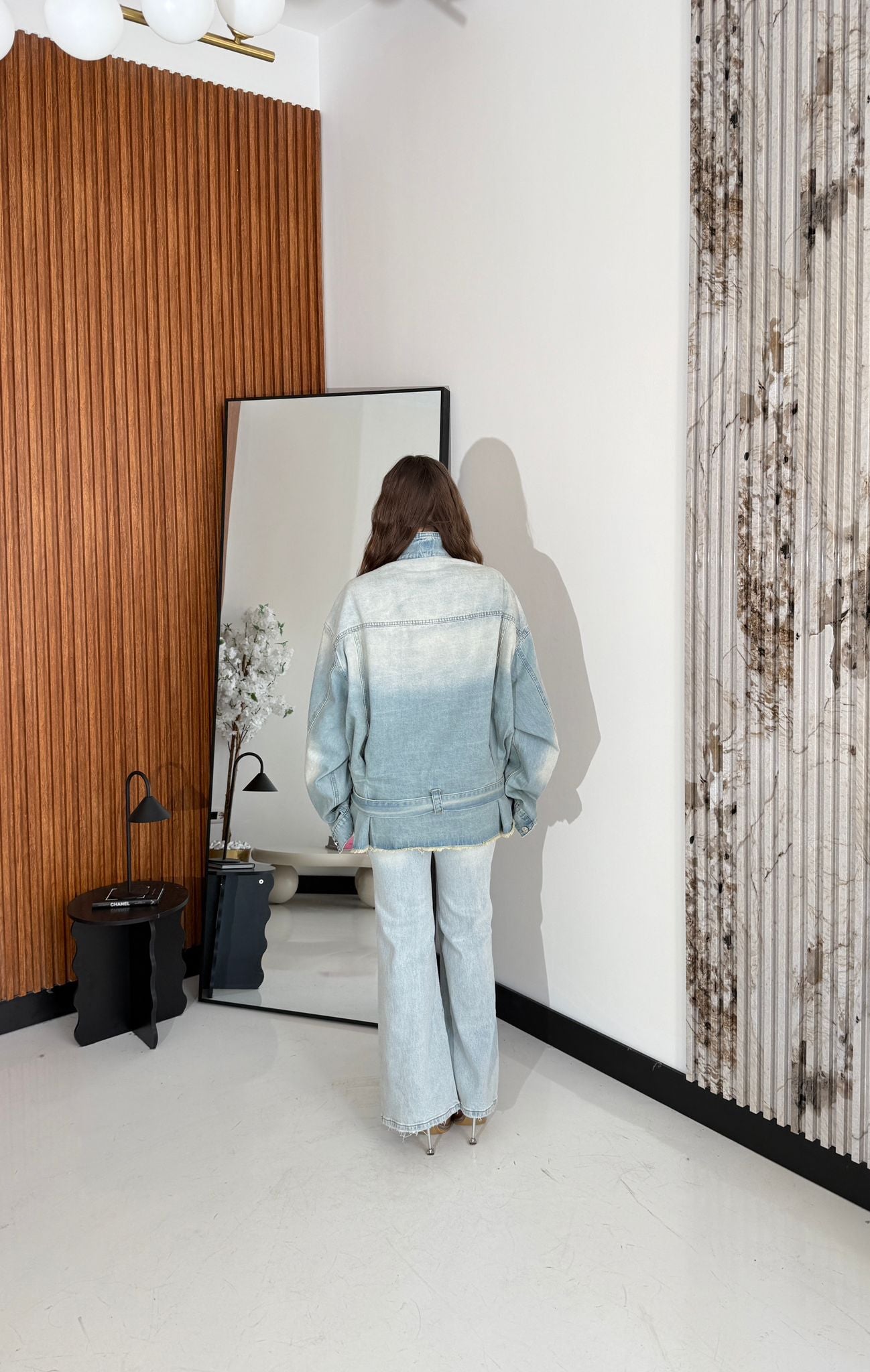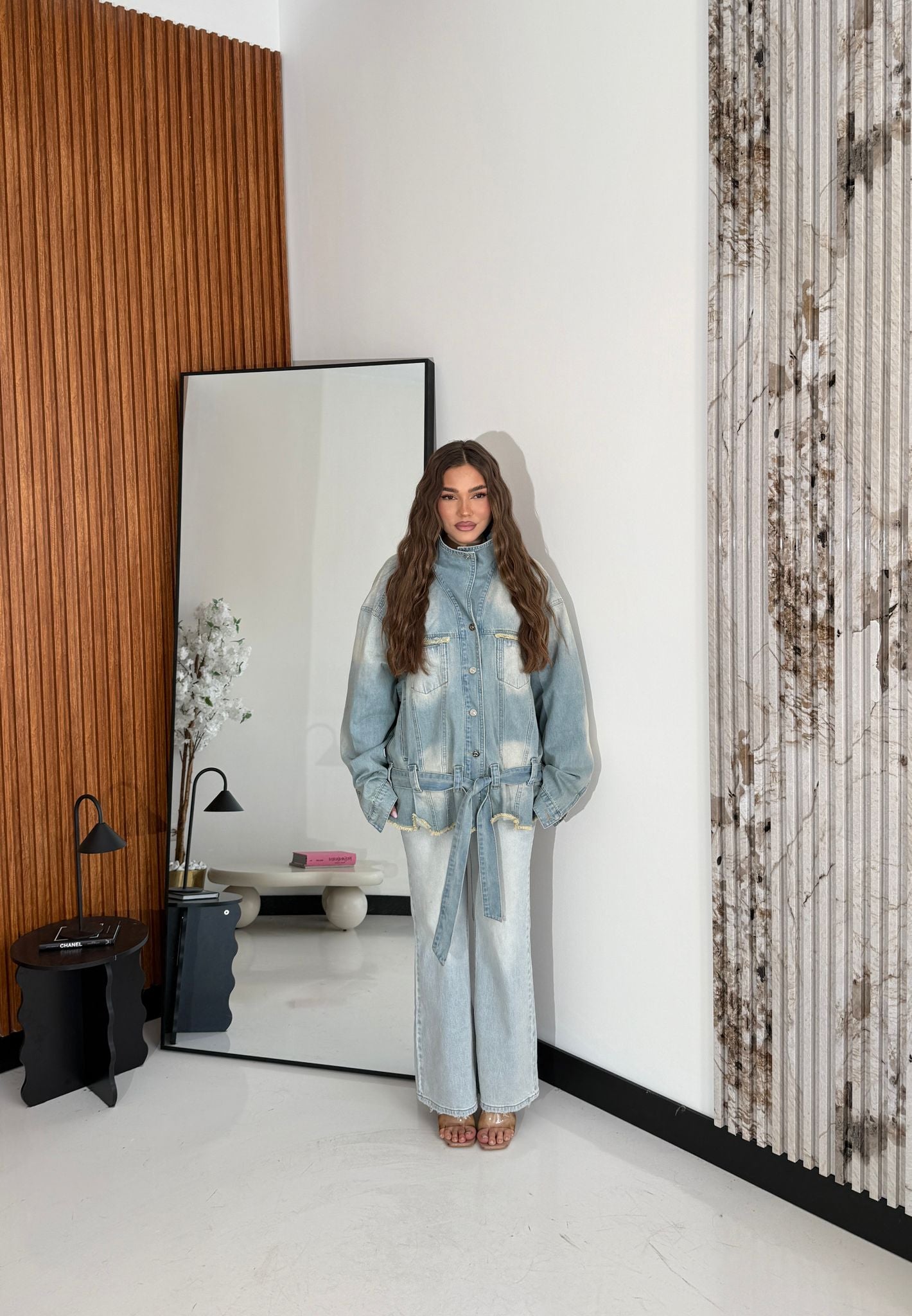 Camicione da donna in denim sfrangiato sulla parte inferiore con chiusura a bottoni, tasche laterali e cintura compresa. Modello oversize, tessuto tela fissa. Taglia unica, veste bene fino ad una taglia L/XL. La modella ed è alta 1,65 e pesa 52/52kg.
