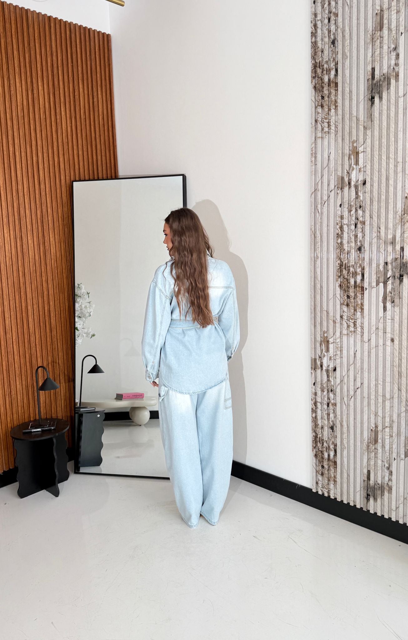 Camicione da donna in denim con chiusura a bottoni e cintura compresa. Modello oversize, tessuto tela fissa. Veste regolarmente la propria taglia, la modella indossa taglia XS ed è alta 1,65 e pesa 52/52kg.