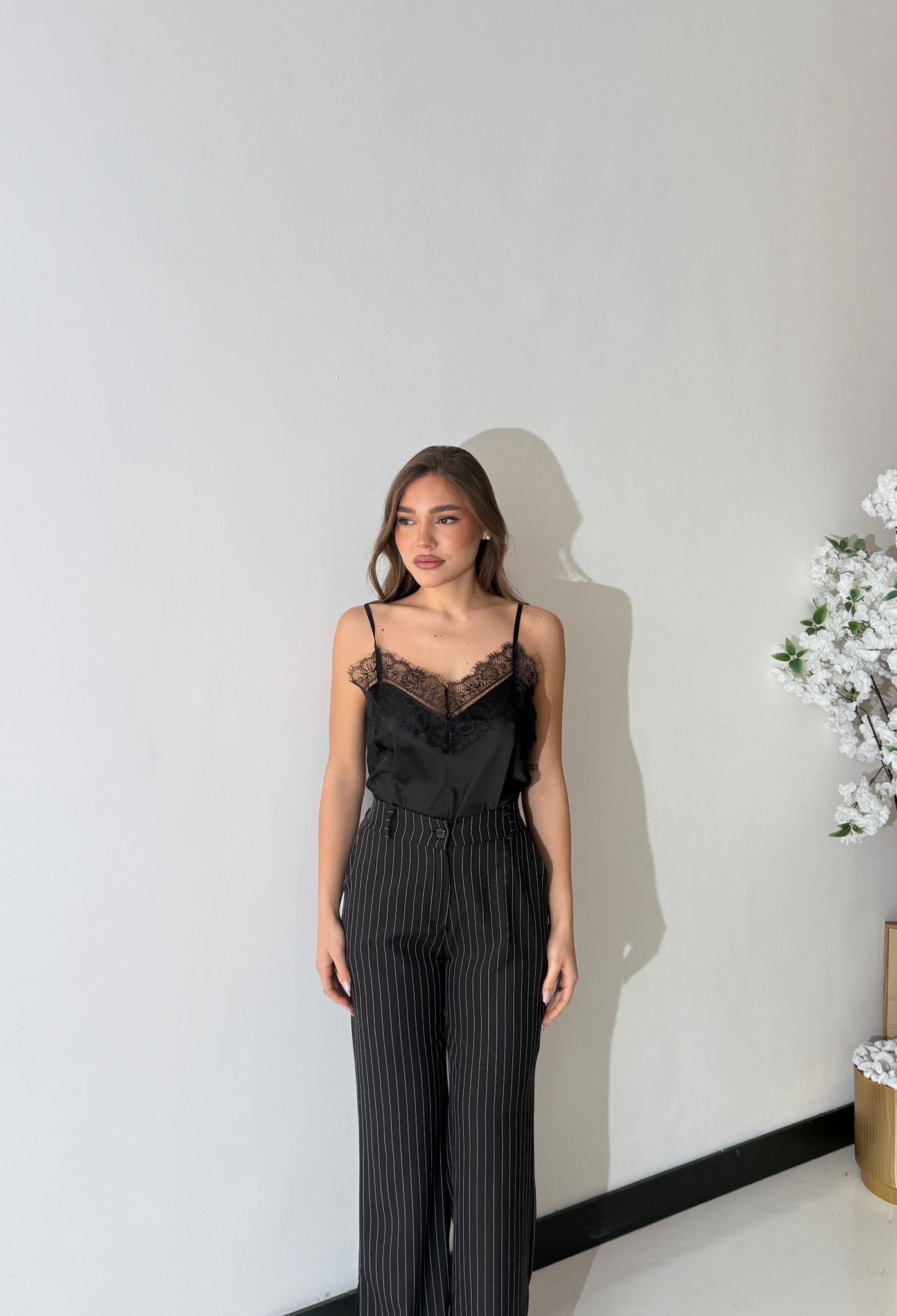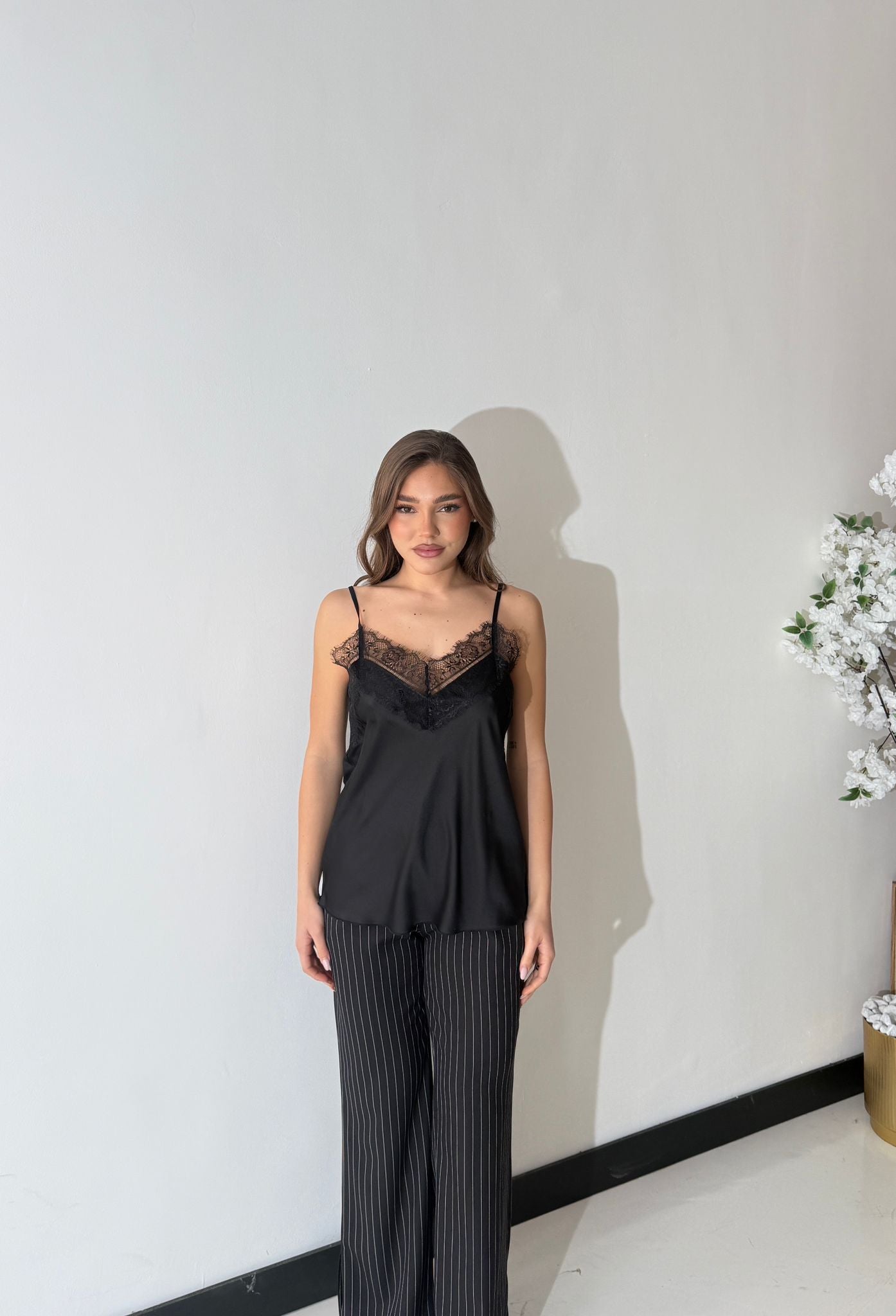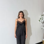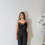 Canotta in tessuto effetto satin, con bretelle regolabili e scollo a V con dettagli in pizzo. Taglia unica, tessuto elasticizzato, veste bene fino ad una taglia M/L. La modella è alta 1,65 e pesa 52/53kg.