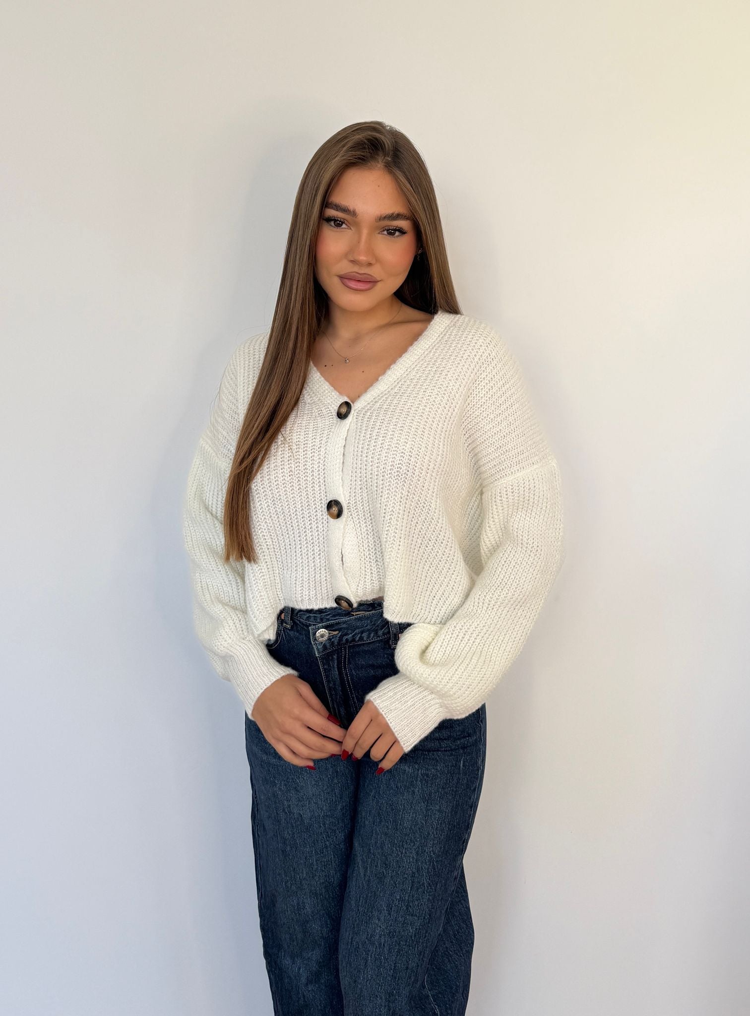 Cardigan da donna in caldo cotone con manica a sbuffo e polsini, chiusura sul davanti con bottoncini e veste bene fino ad una  M/L