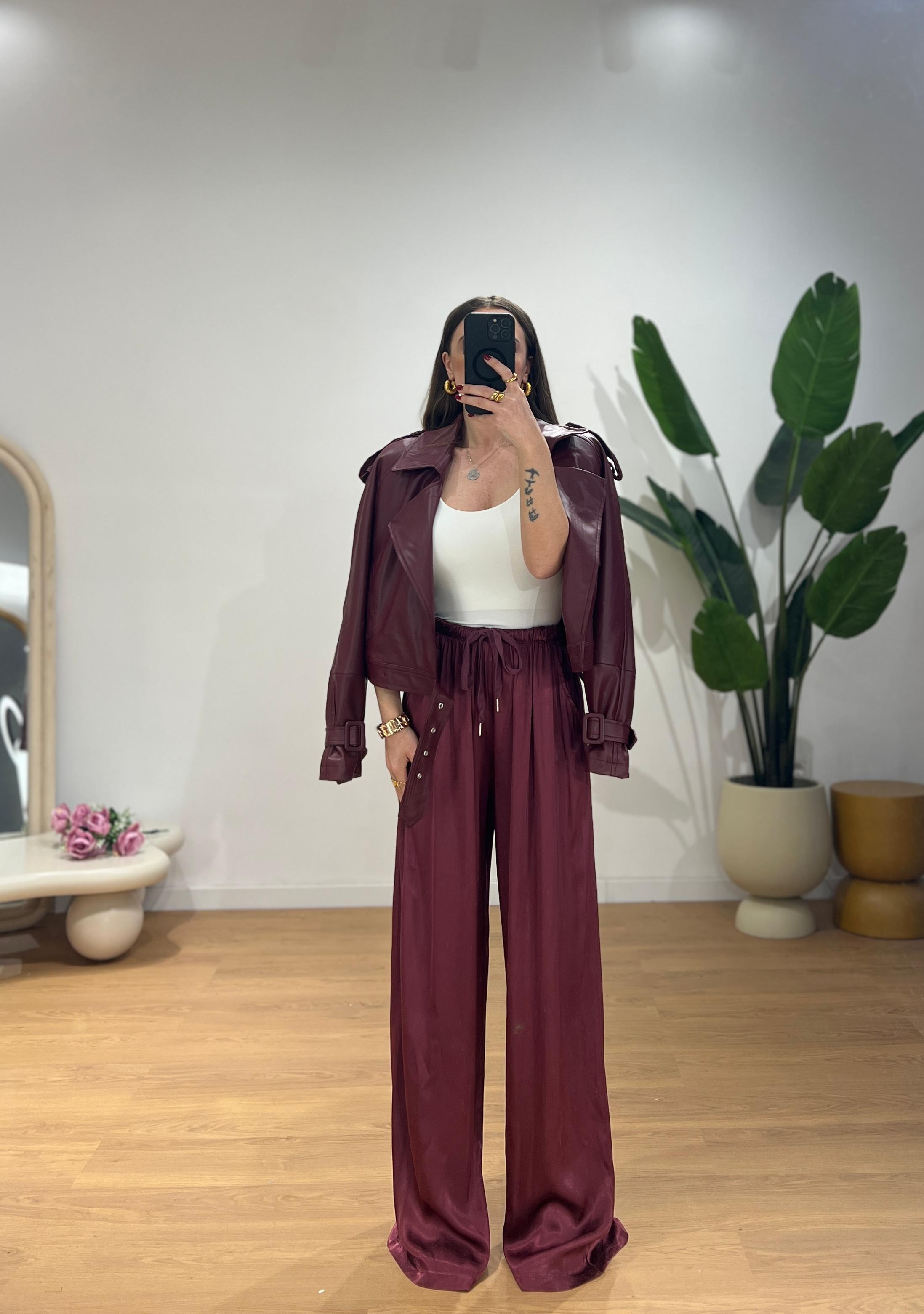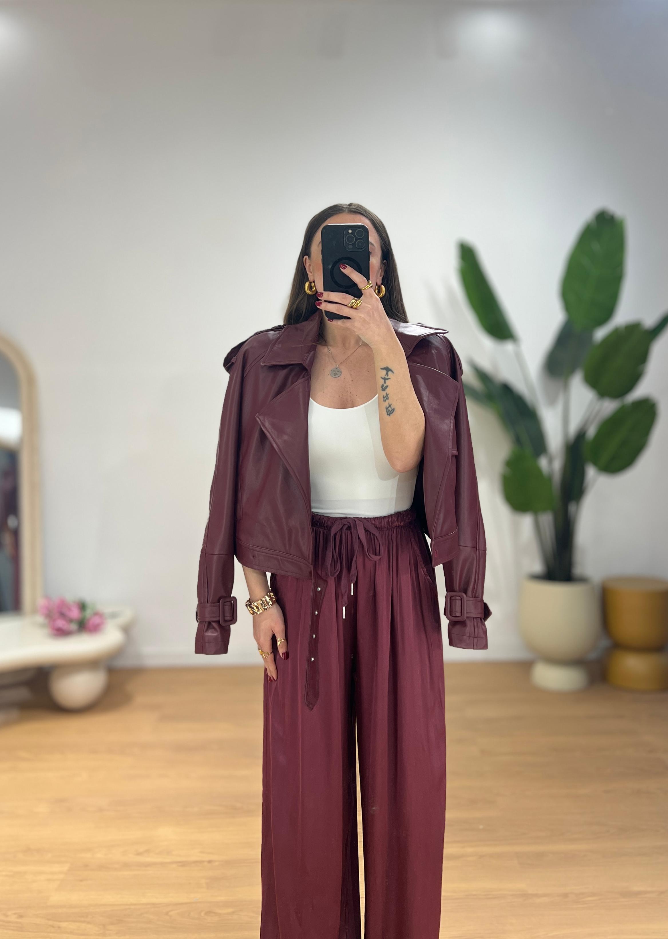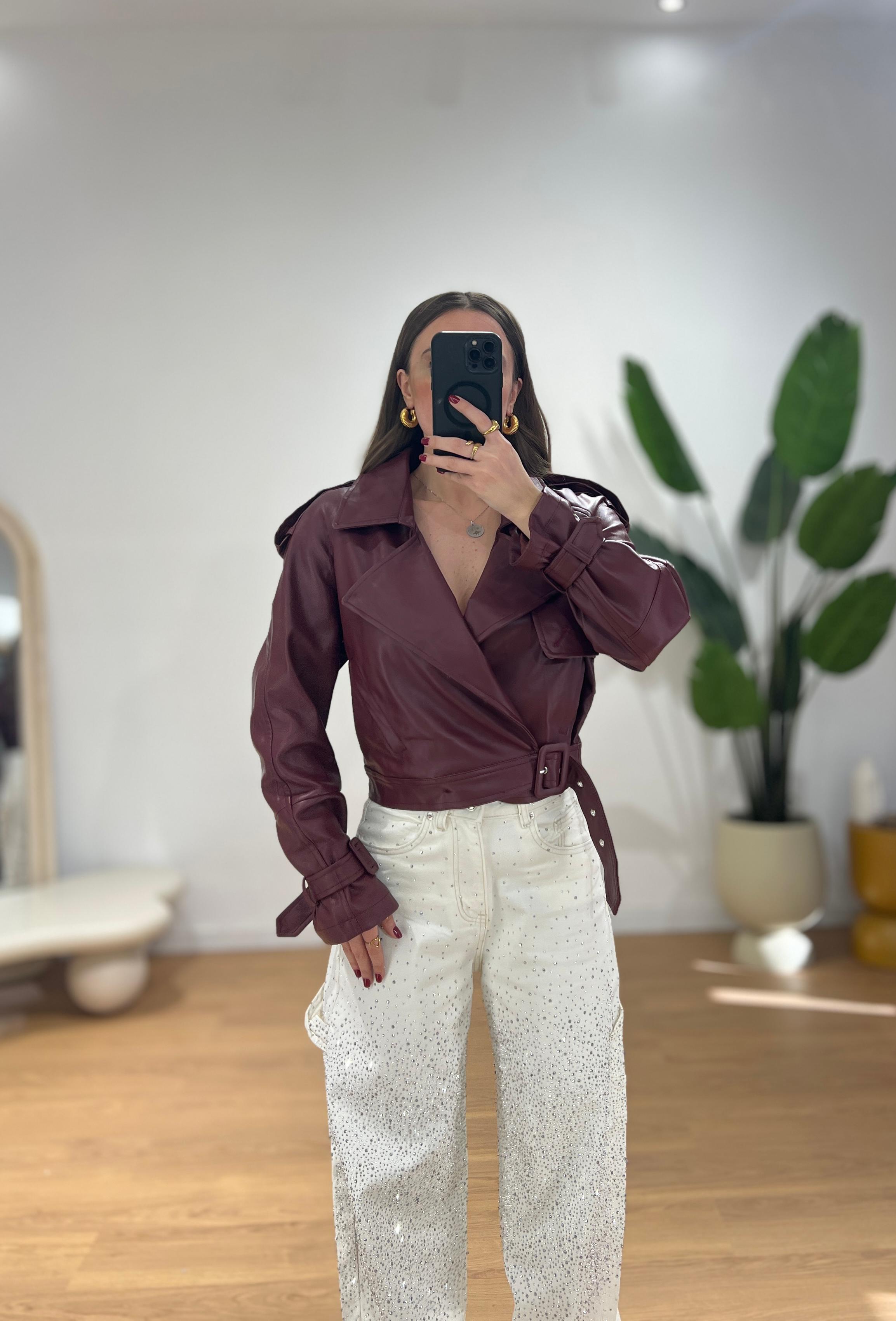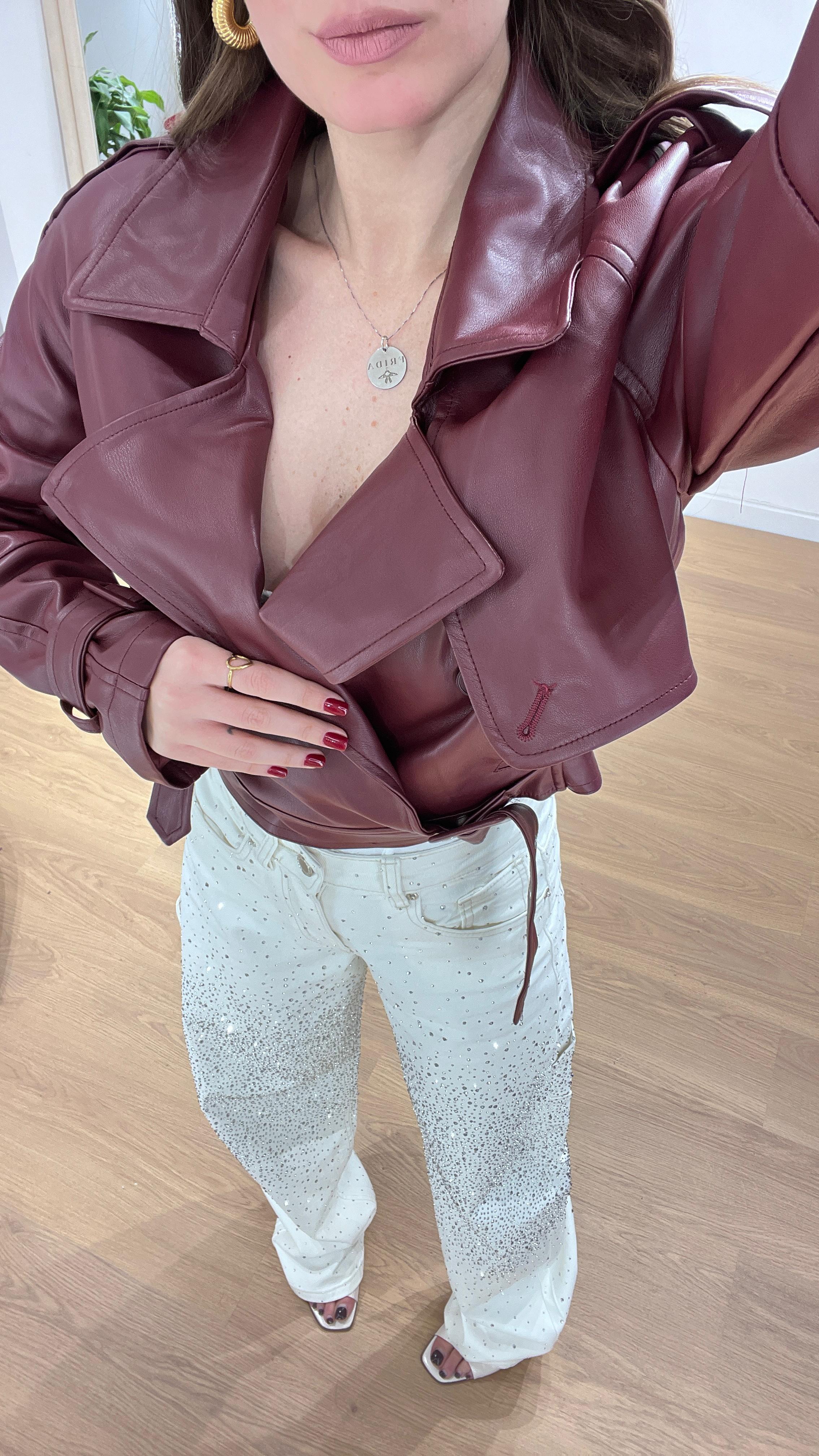 Giubbino di pelle, mix perfetto tra un chiodo classico ed una giacca Biker, con colletto ampio, cintura in vita, spalle leggermente strutturate e maniche con cinturini sui polsi. Giusy indossa la taglia XS/S.