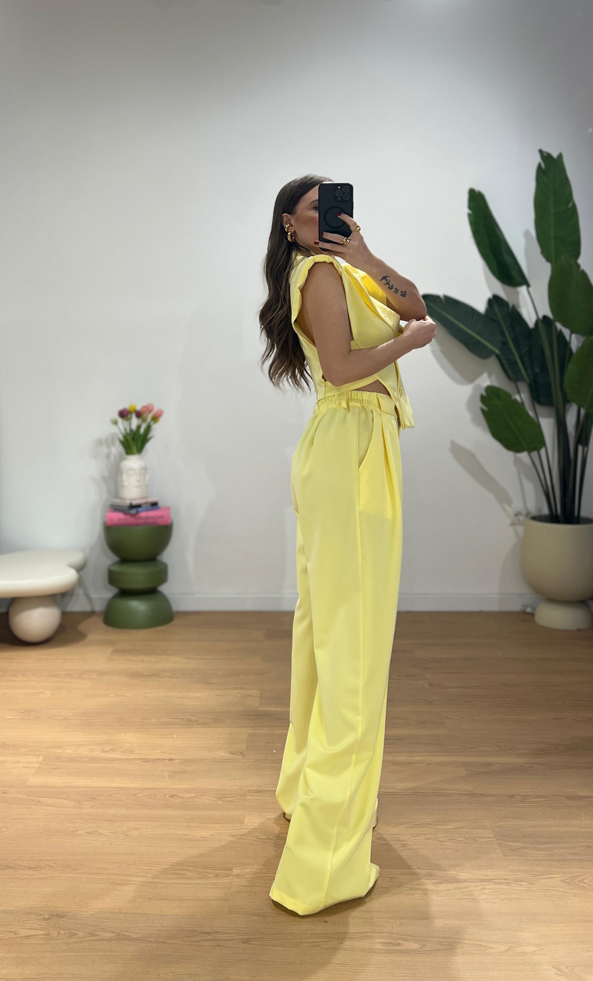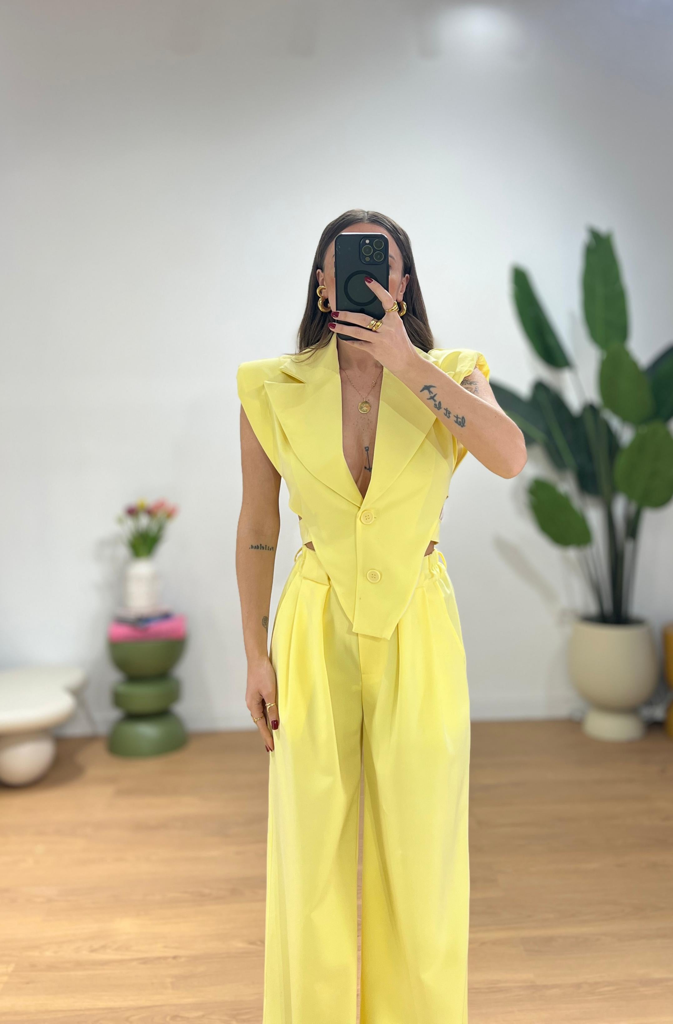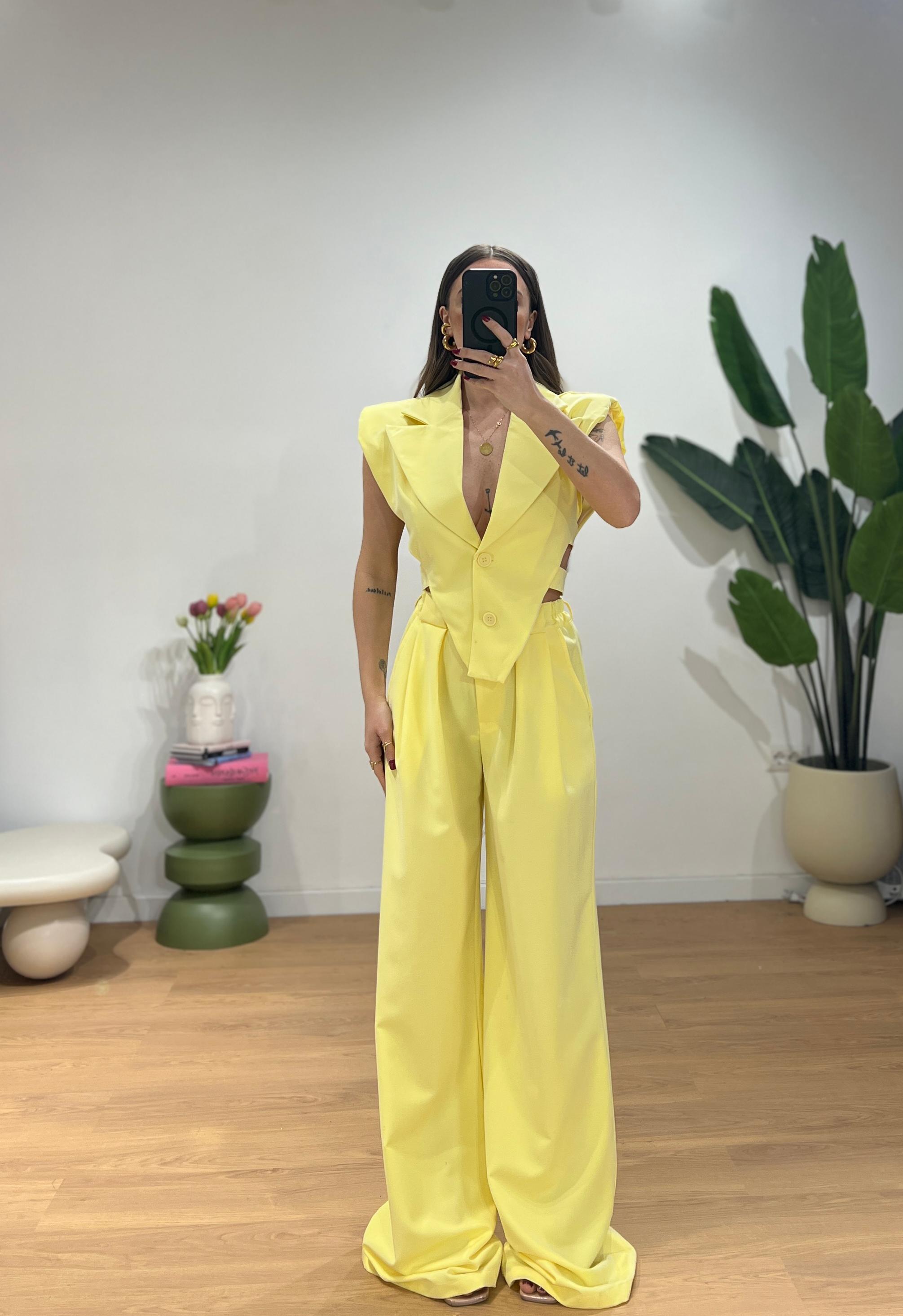 Coordinato da donna composto da giacca a gilet com spalline imbottite e aperture particolari laterali, mentre il pantalone a palazzo a vita alta con elastico in vita sul retro, tessuto cotone leggero e vestirà bene fino ad una M/L