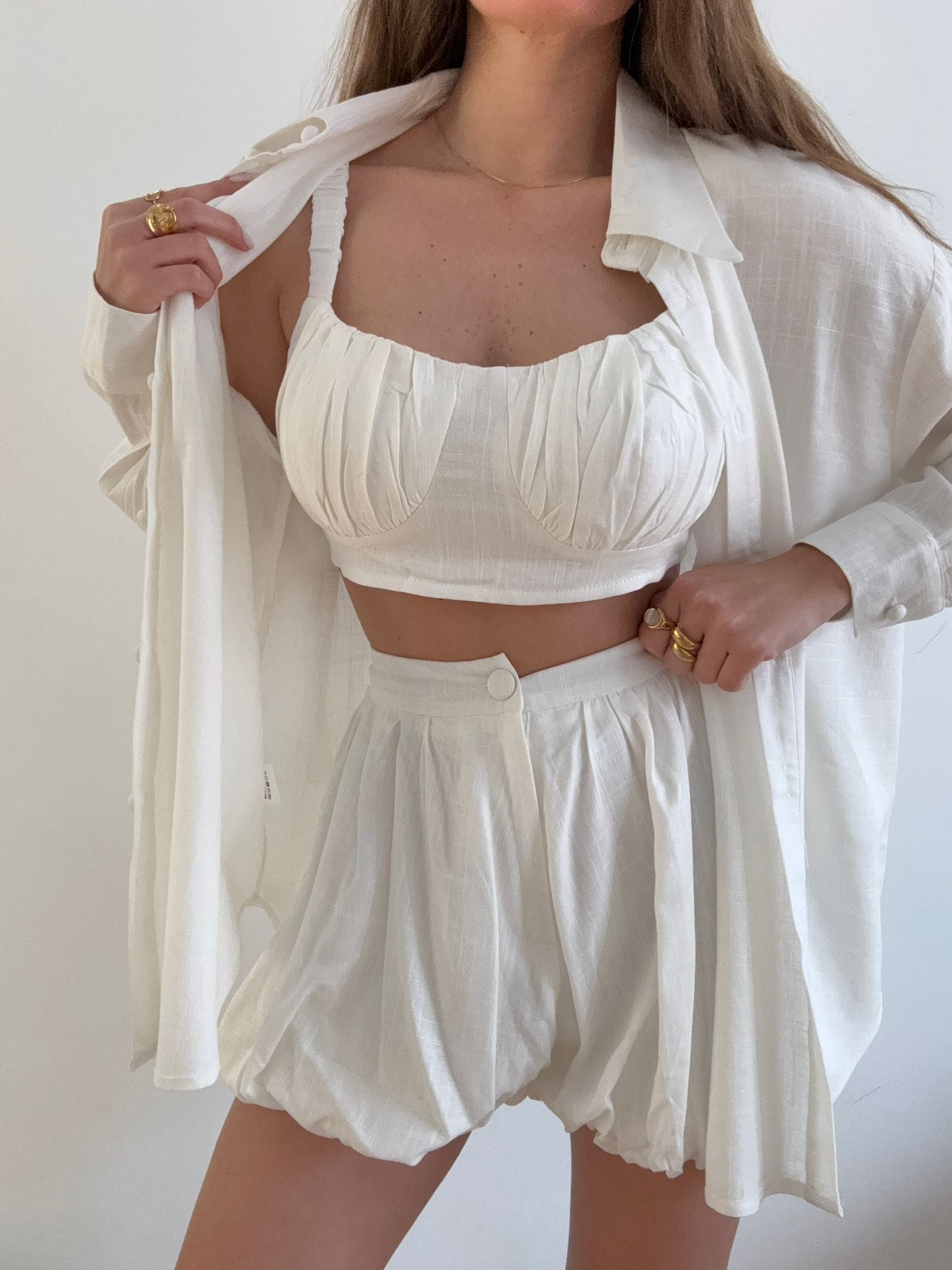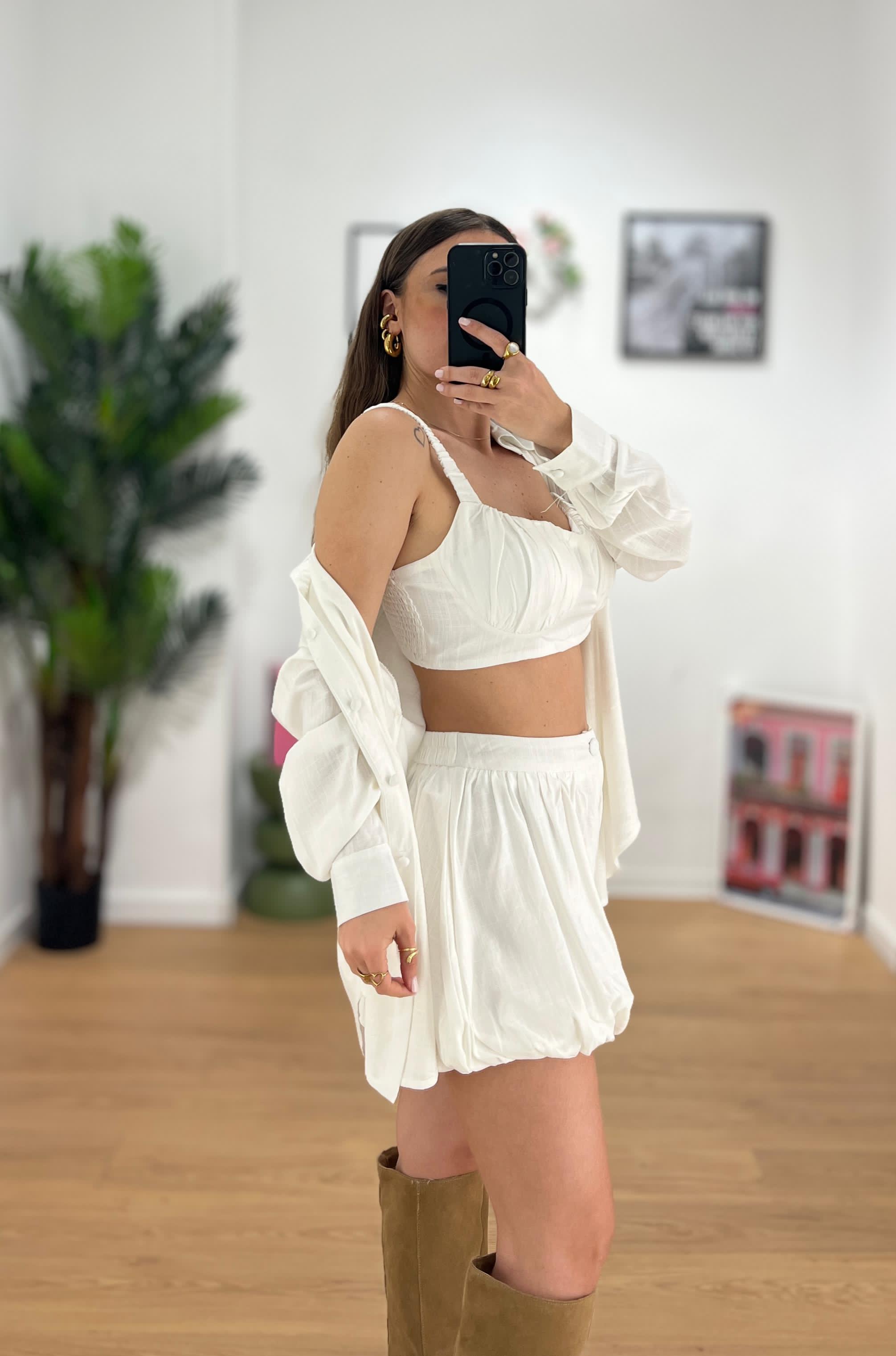 Coordinato da donna top quality in misto Lino composto da camicia con bottoncini rivestiti, top e shorts a palloncino con elastico sul retro ma ceTe regolarmente la propria taglia e Giusy indossa taglia S/M