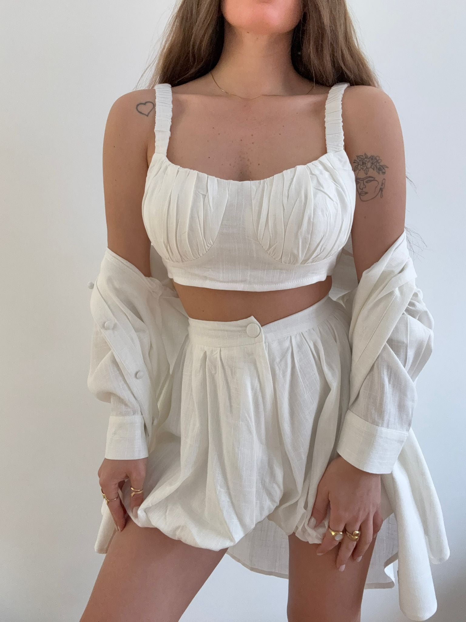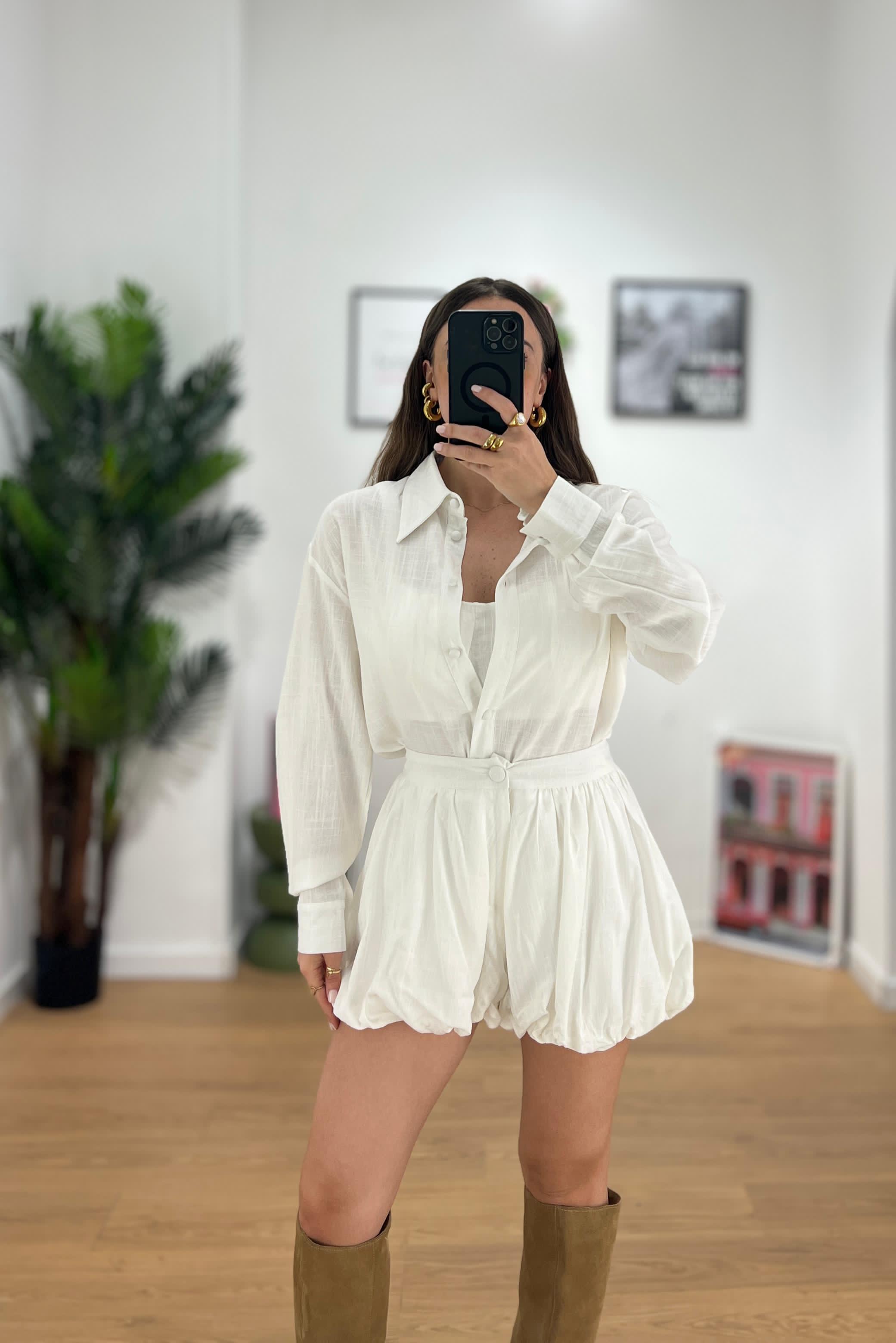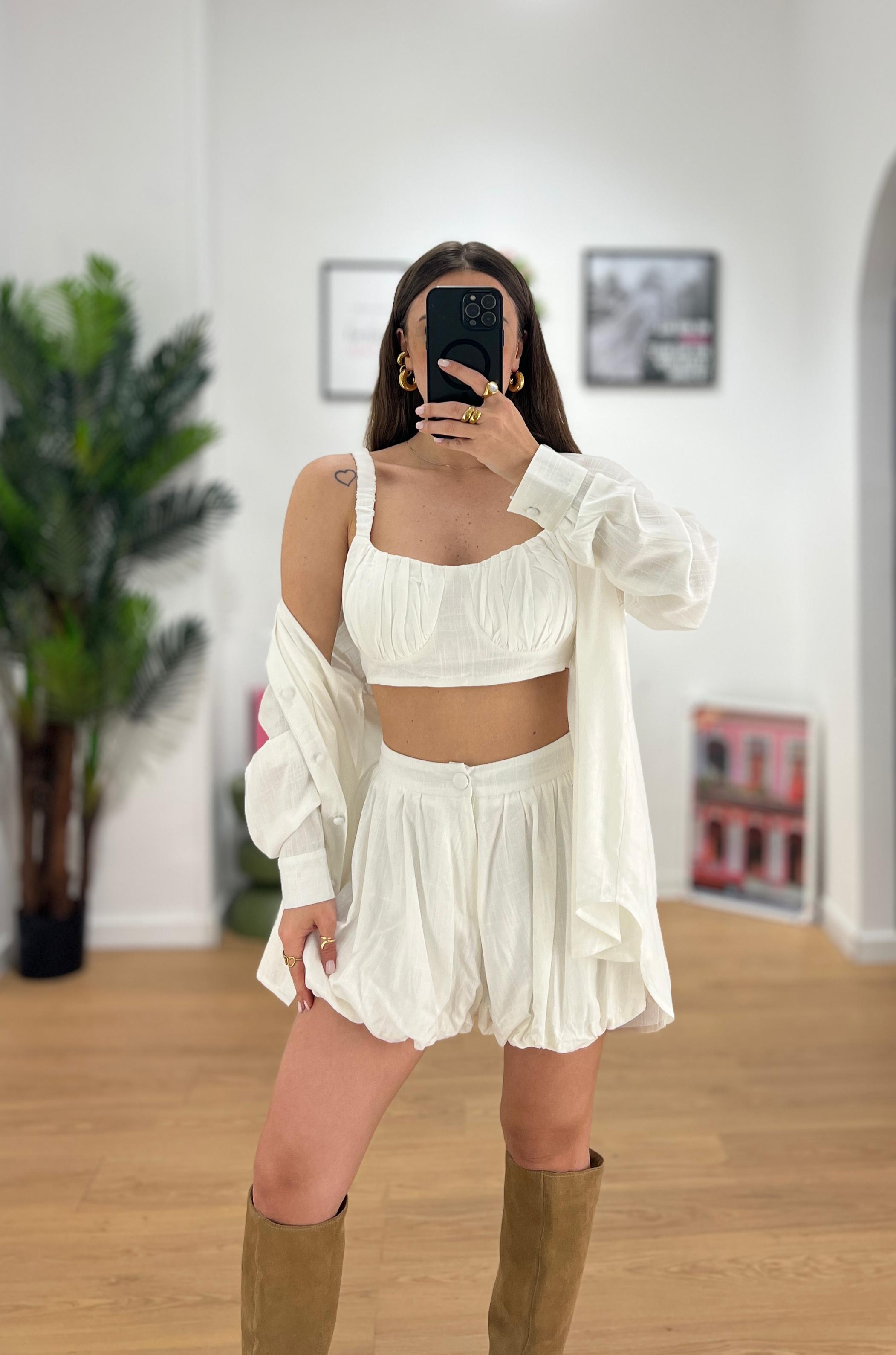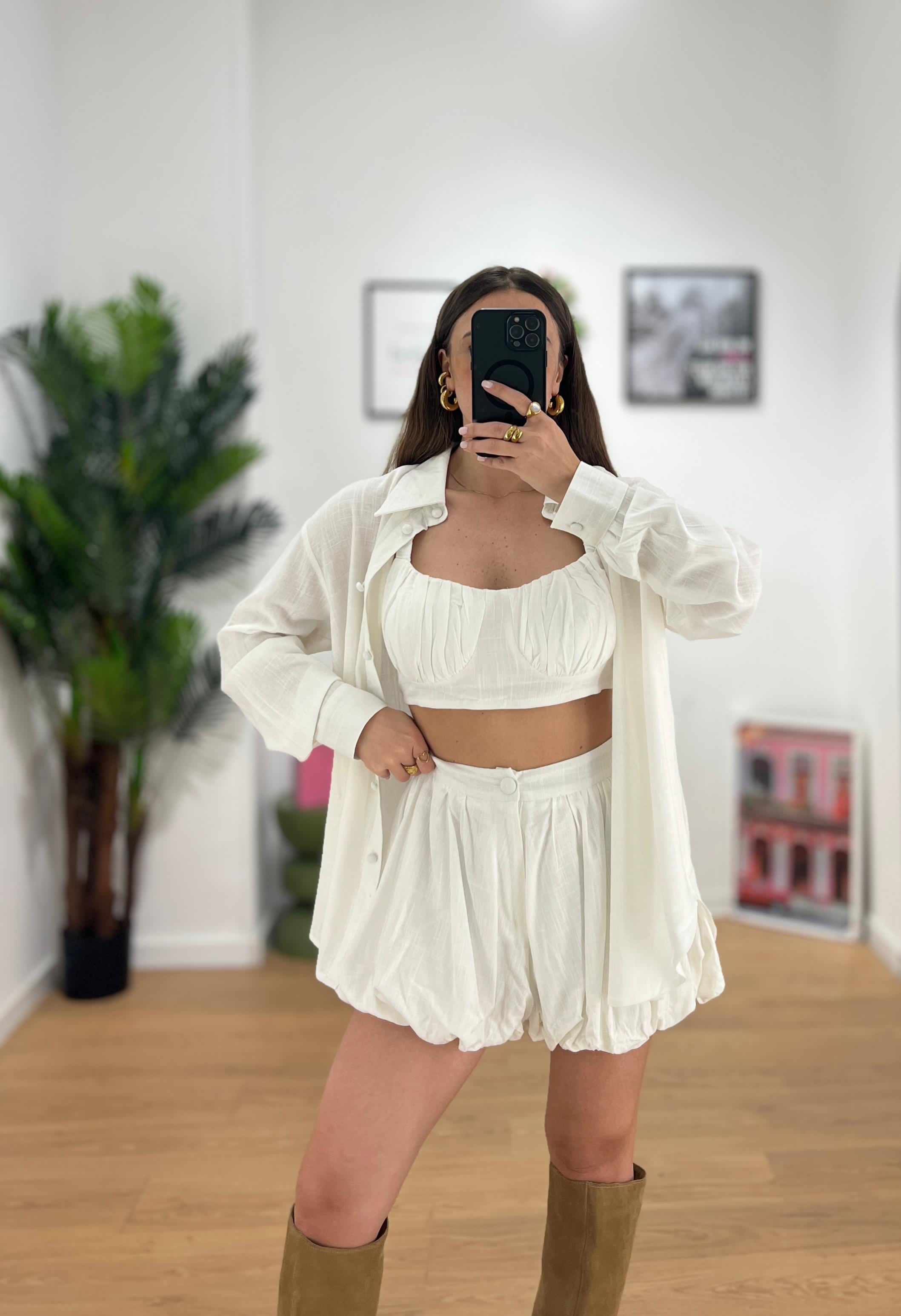 Coordinato da donna top quality in misto Lino composto da camicia con bottoncini rivestiti, top e shorts a palloncino con elastico  sul retro ma ceTe regolarmente la propria taglia e Giusy indossa taglia S/M