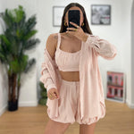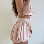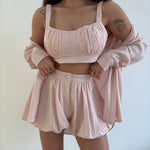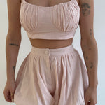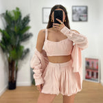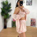 Coordinato da donna top quality in misto Lino composto da camicia con bottoncini rivestiti, top e shorts a palloncino con elastico sul retro ma ceTe regolarmente la propria taglia e Giusy indossa taglia S/M