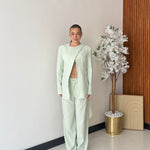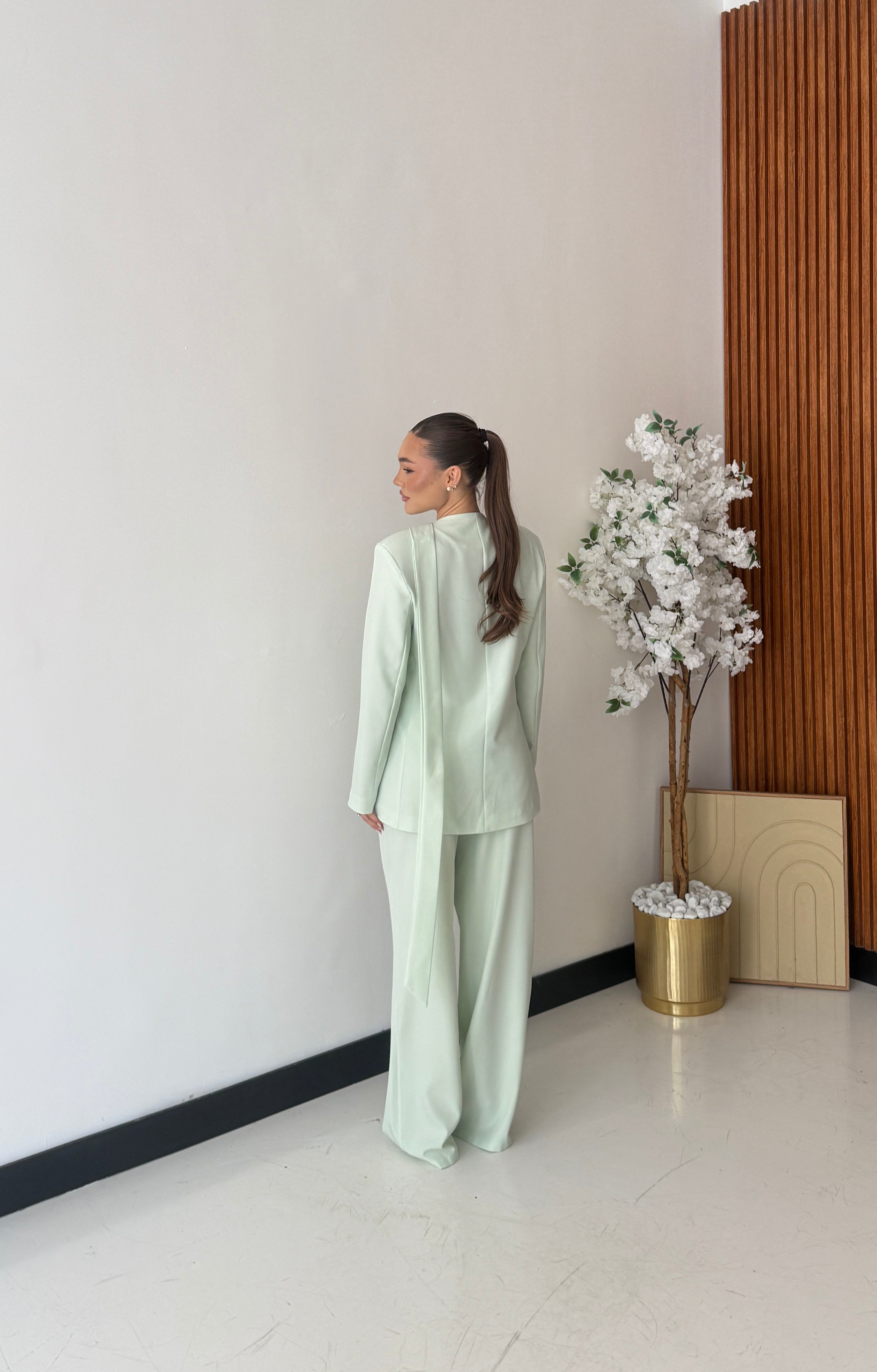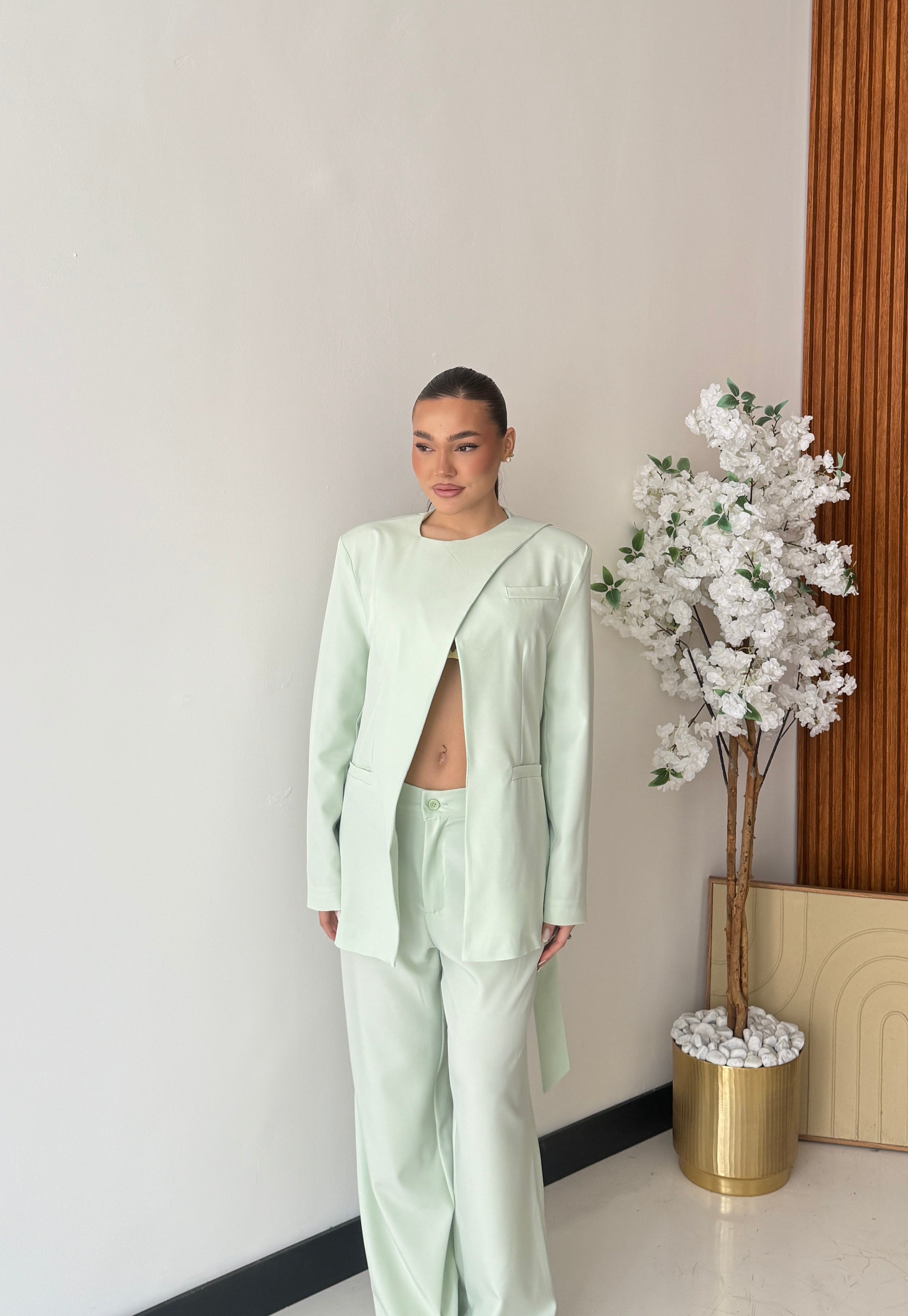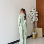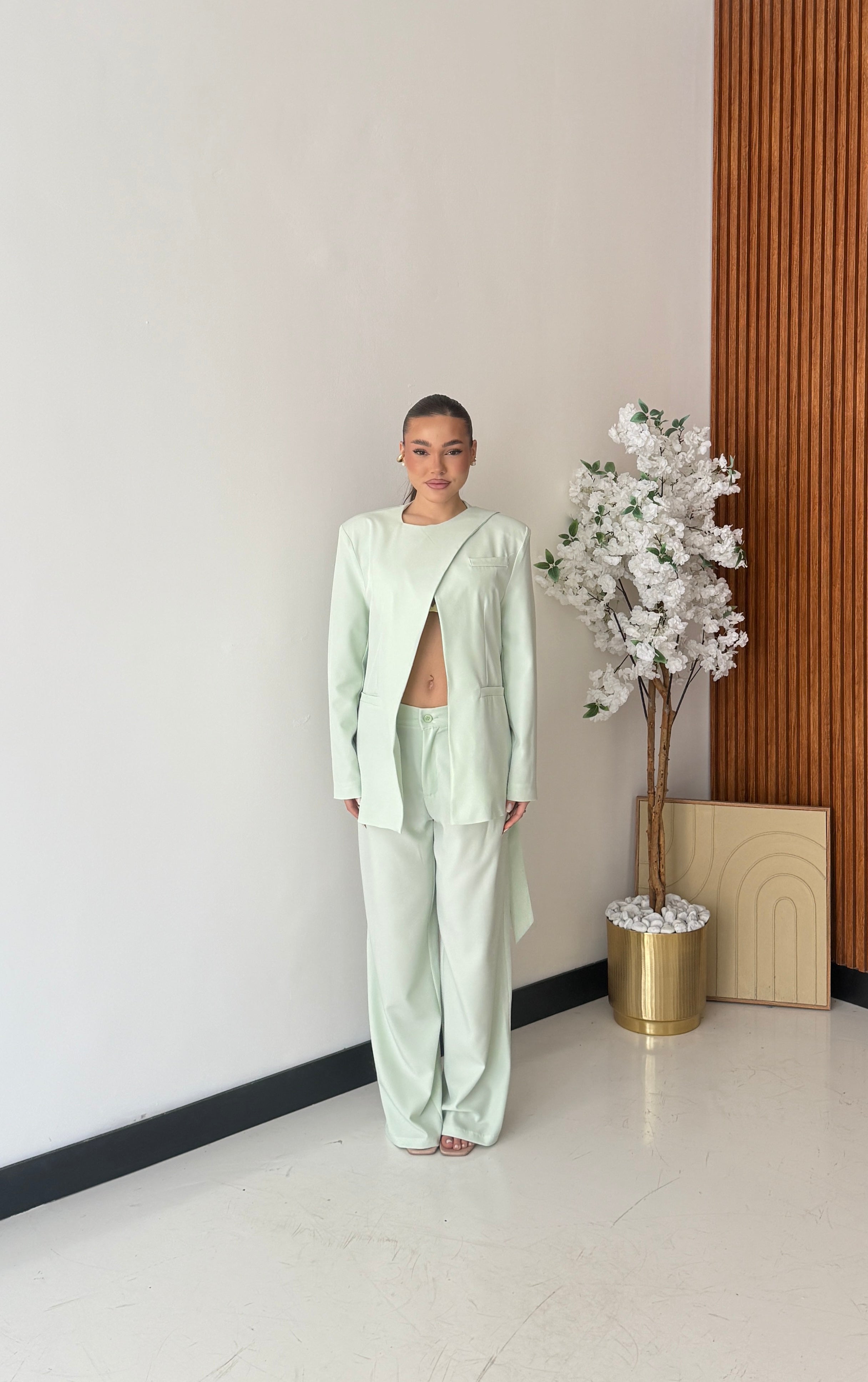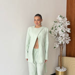 Coordinato in cotone composto da giacca con apertura asimmetrica sul davanti con spalline imbottite, foderata internamente con chiusura a bottone sul davanti, e da pantalone a gamba larga, con tasche laterali ed elastico in vita sul retro. Taglia unica, veste bene fino ad una taglia M piena. La modella è alta 1,65 e pesa 52/53kg.