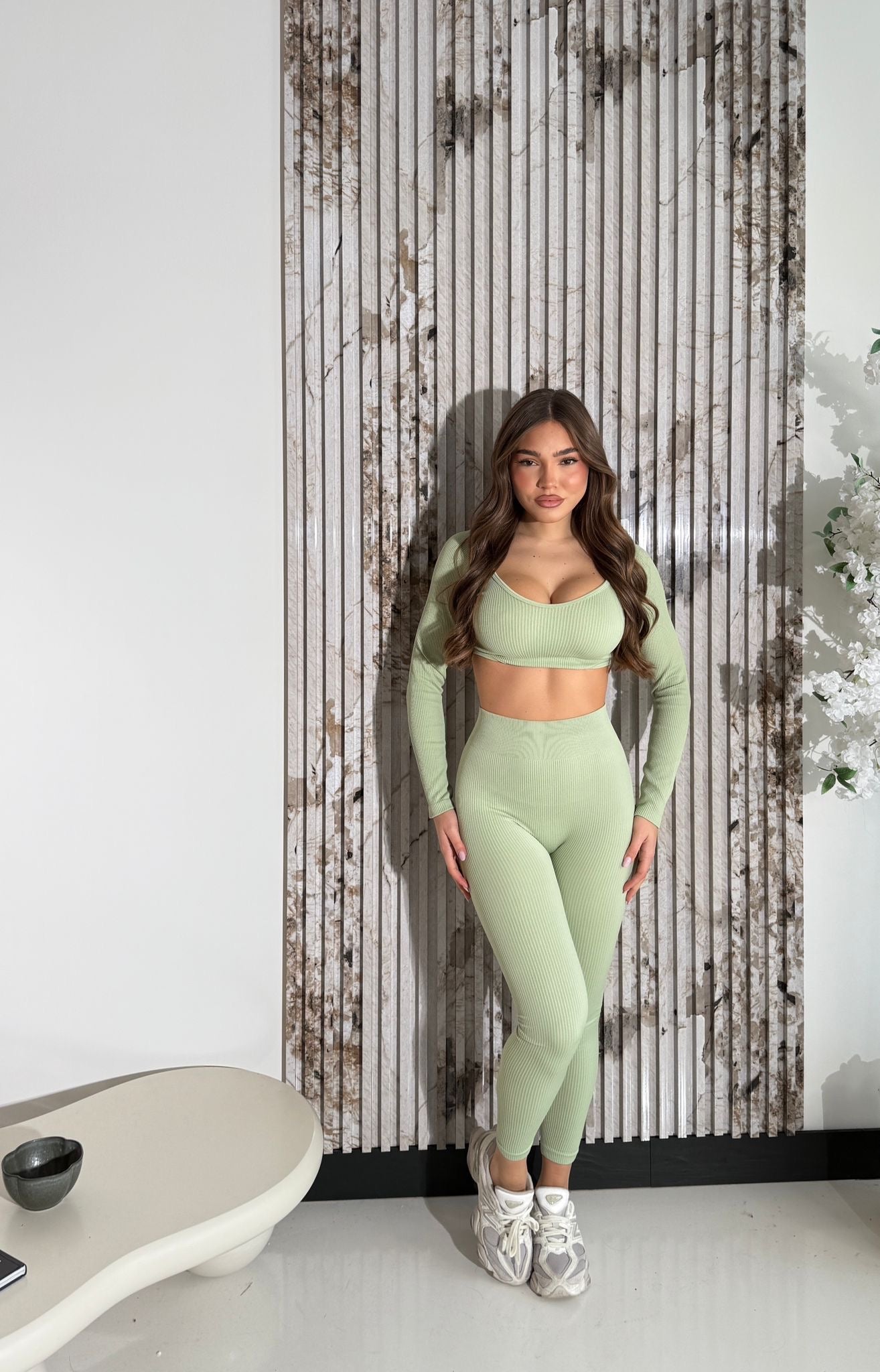 Coordinato da donna tessuto a costine, confortevole ma fasciante, composto da maglia e leggings con elastico in vita. La modella in foto indossa taglia S/M ed è alta 1,65 e pesa 52/53 kg.