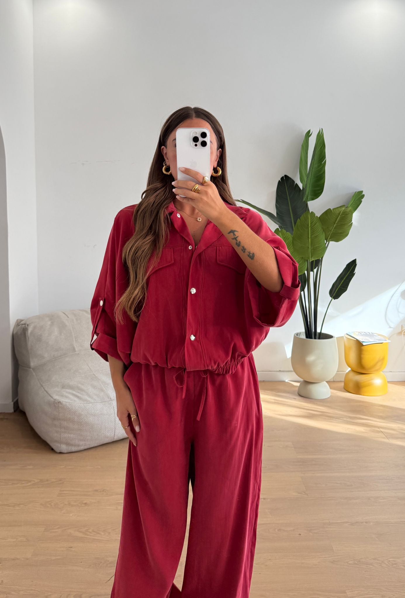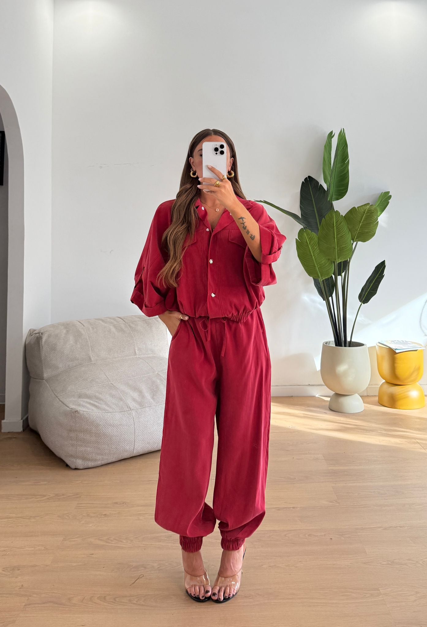 Coordinato da donna composto da camicia con chiusura bottoni e pantalone con elastico in vita e veste bene fino ad una M/L