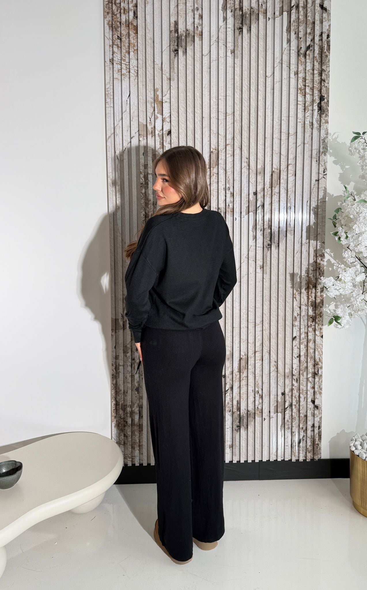 Coordinato da donna in lana rasata composto da maglia oversize e pantalone con elastico in vita e laccetti regolabili. Taglia unica, tessuto elasticizzato, veste bene fino ad una taglia M/L piena. La modella é alta 1,65 e pesa 52/53 kg.