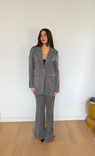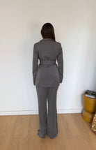 coordinato da donna composto da giacca con cintura, foderato internamente e pantalone a zampa con elastico sul retro e spacchetti sul finale