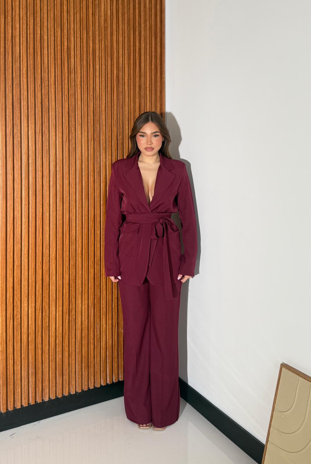 Coordinato da donna composto da giacca con cintura, foderato internamente e pantalone a zampa con elastico sul retro e spacchetti sul finale.