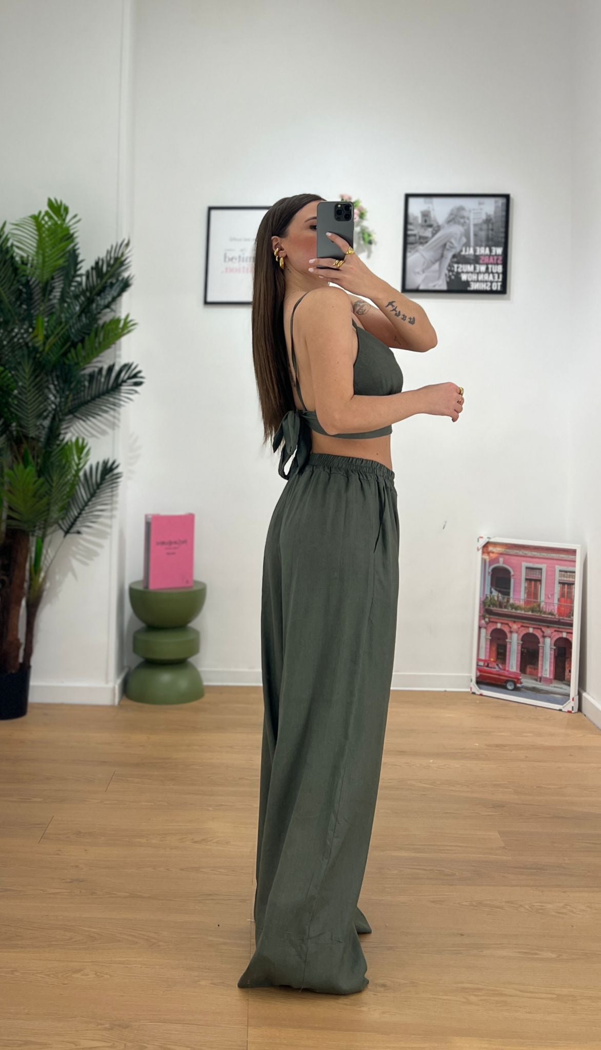 Coordinato da donna in misto lino composto da top e pantalone con elastico in vita e vestira' bene fino ad una L/XL