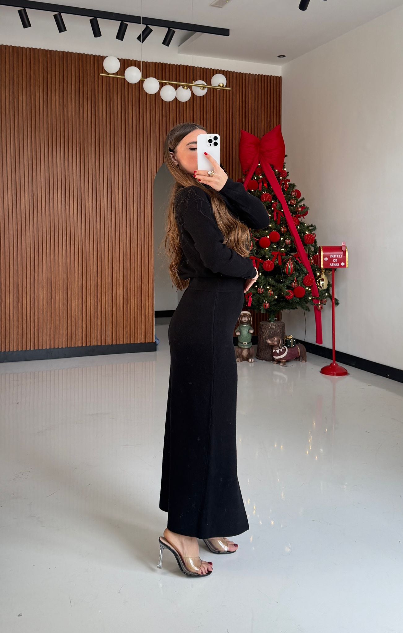 Coordinato da donna composto da maglia leggermente crop e gonna con elastico in vita interno, tessuto elasticizzato in lana rasata e vestirà bene fino ad una M/L piena
