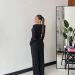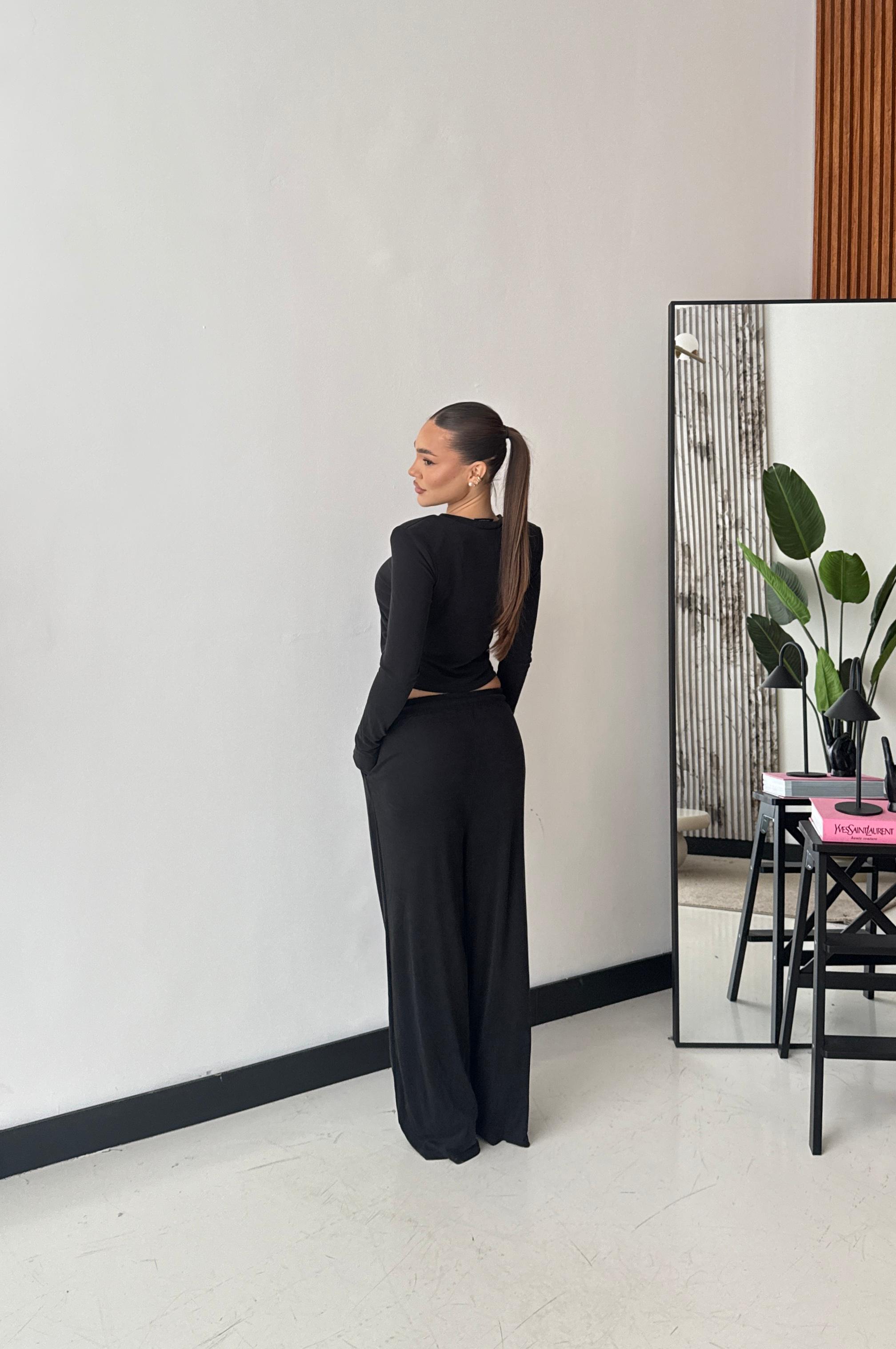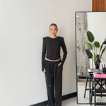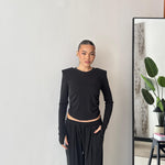Coordinato composto da maglia con spalline imbottite e drappeggio laterale, e da pantalone a gamba larga con elastico in vita, lacci regolabili e tasche laterali. Taglia unica, veste bene fino ad una taglia M/L. La modella è alta 1,65 e pesa 52/53kg.