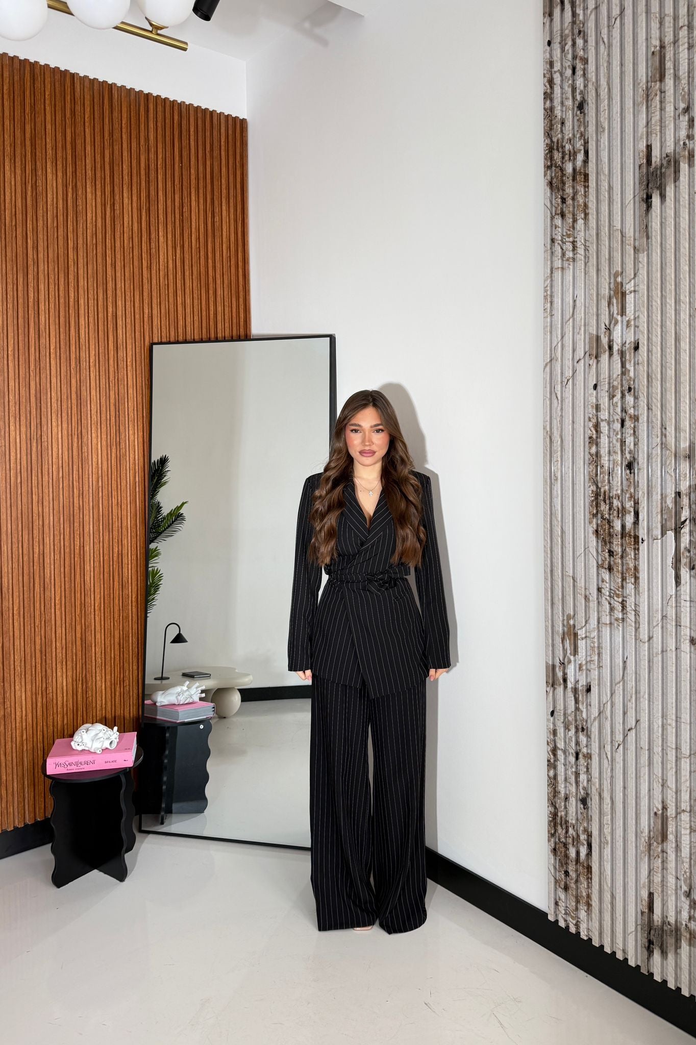 Coordinato da donna gessato composto da giacca con spalline imbottite, foderata internamente e con chiusura cintura non rimovibile. Pantalone a gamba larga con elastico sul retro. Vestita bene fino ad una M/L e la modella è alta 1,65 cm e pesa 52/53 kg.