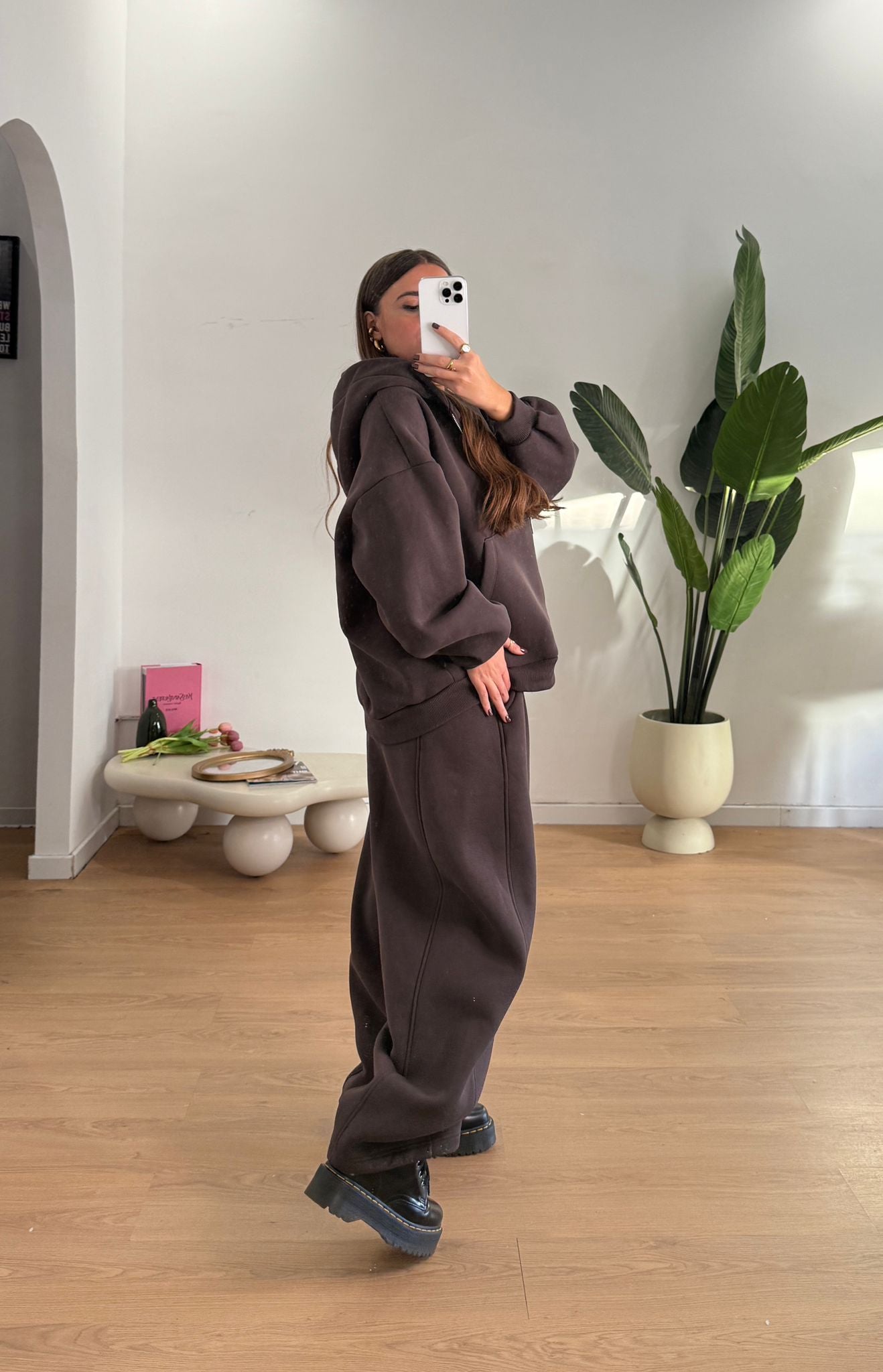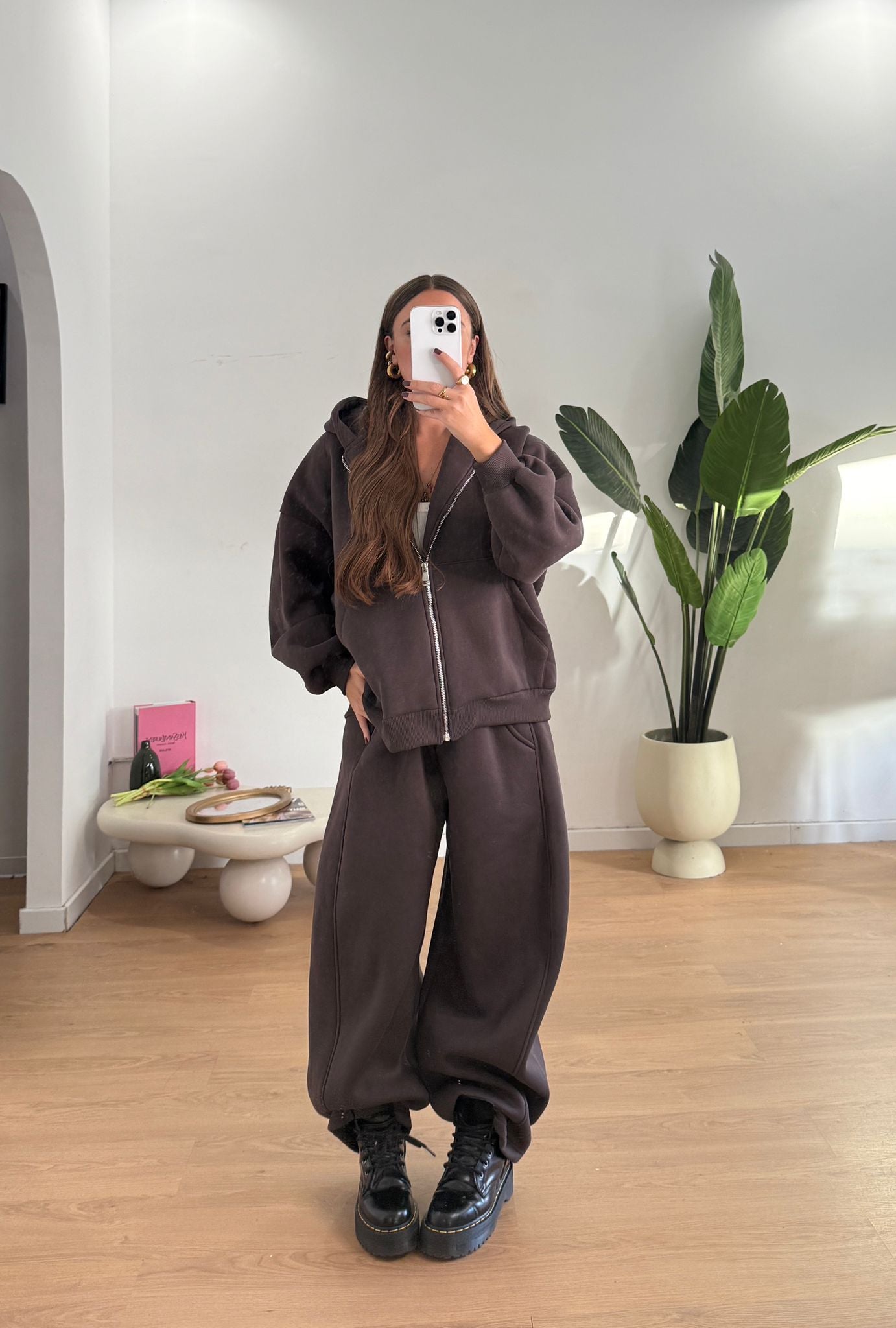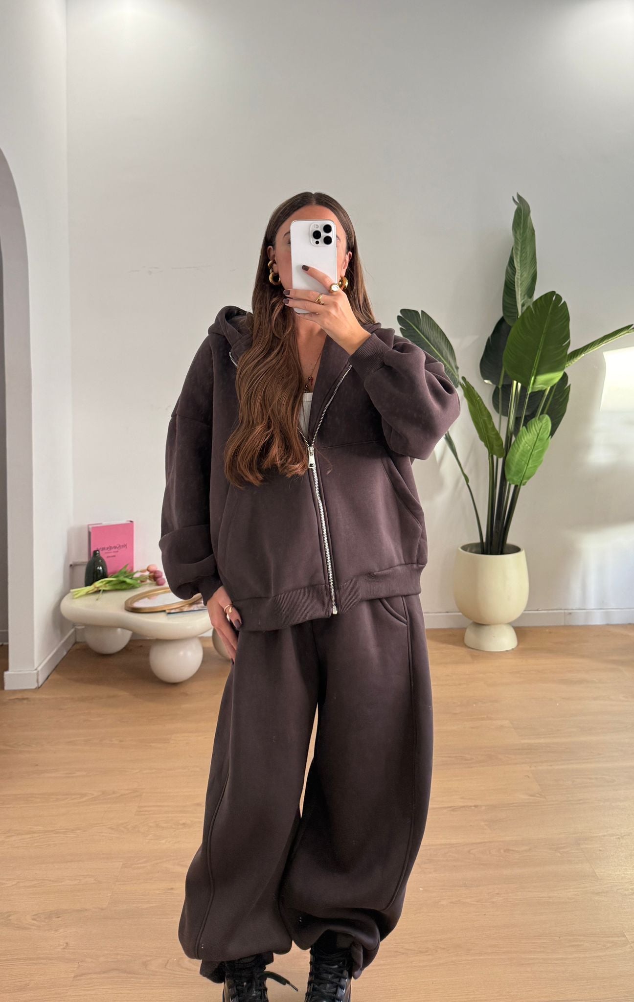 Coordinato da donna felpata internamente composto da felpa oversize con cappucci e chiusura zip sul davanti e pantalone con elastico in vita e vestirà bene fino a d una M/L