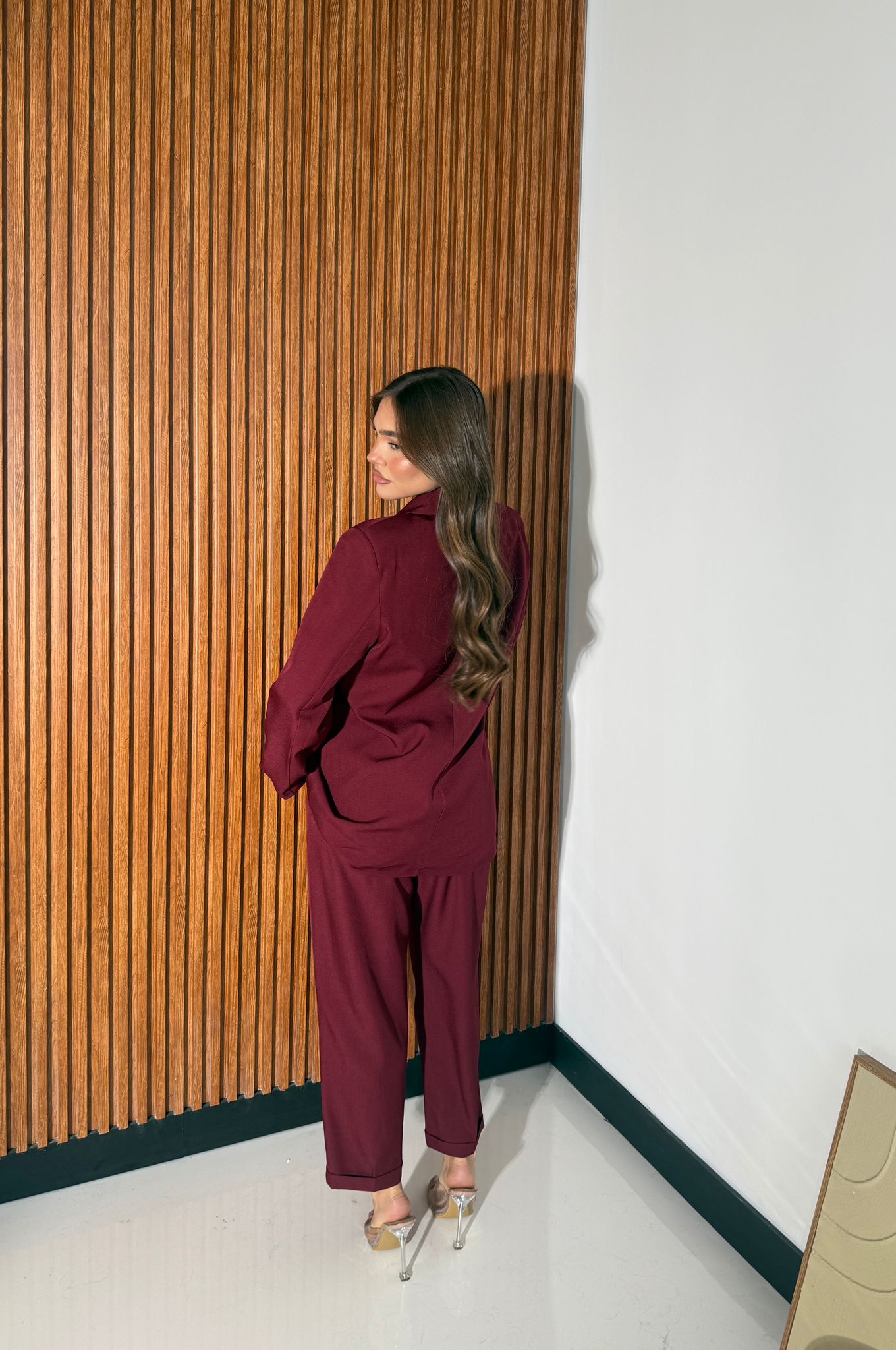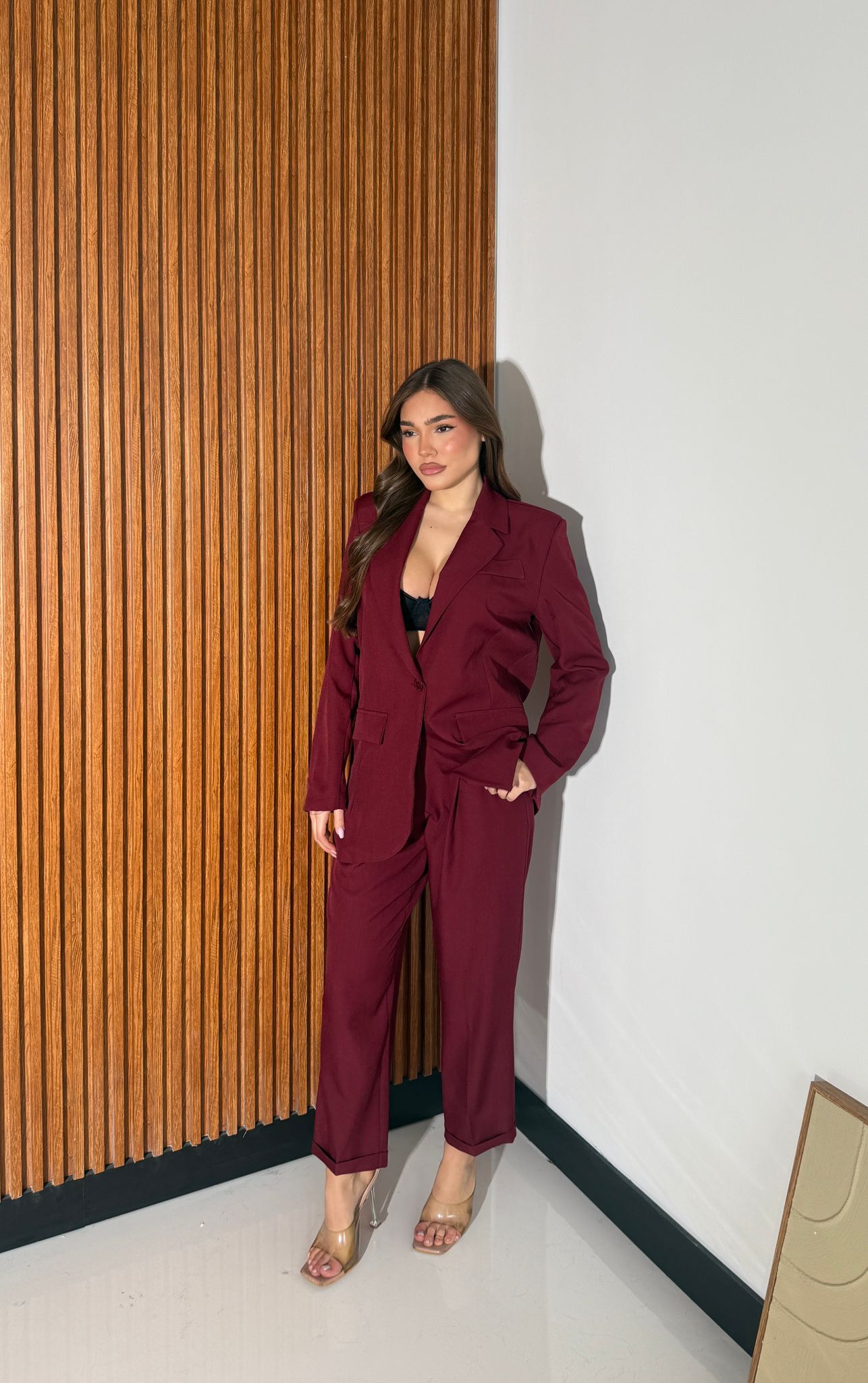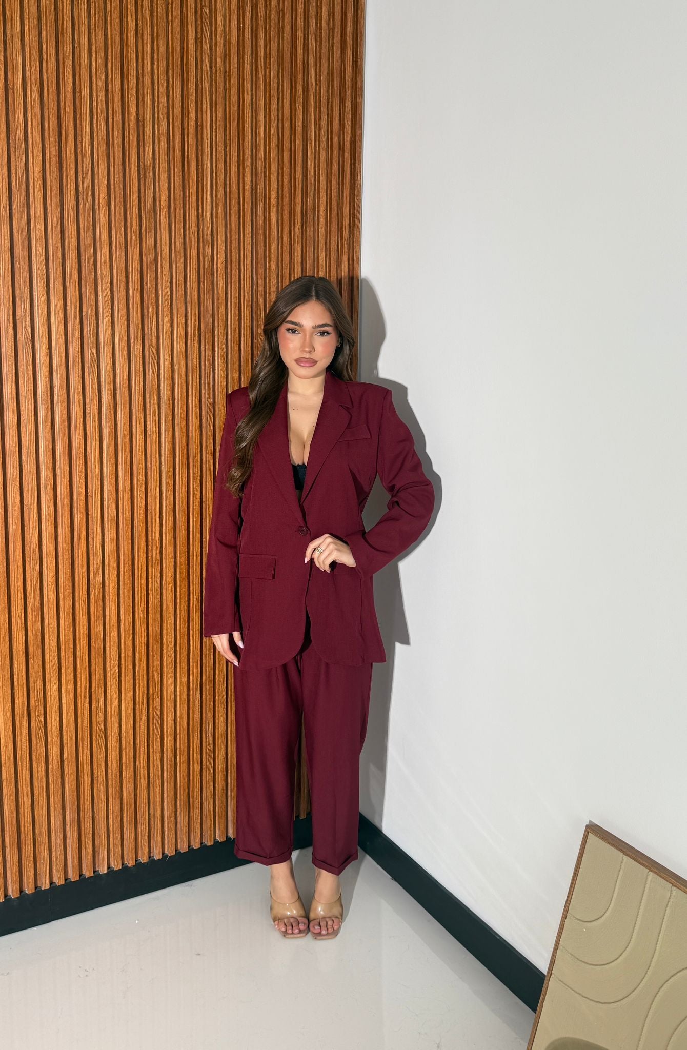 Il coordinato low cost presente in foto è composto da una  giacca abbastanza over, con bottoncino centrale e foderata all’interno, e da un pantalone morbido con elastico sul retro. La modella in foto indossa taglia unica, veste fino a taglia 44.