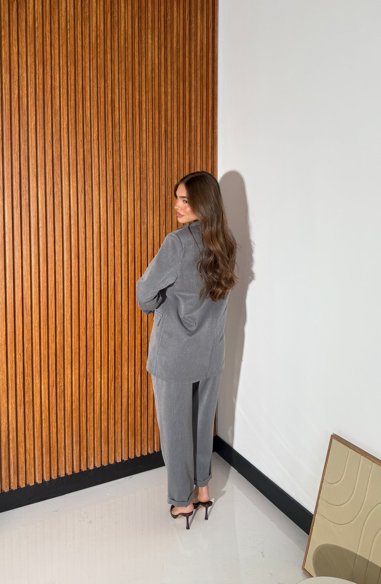 Il coordinato low cost presente in foto è composto da una  giacca abbastanza over, con bottoncino centrale e foderata all’interno, e da un pantalone morbido con elastico sul retro. La modella in foto indossa taglia unica, veste fino a taglia 44.