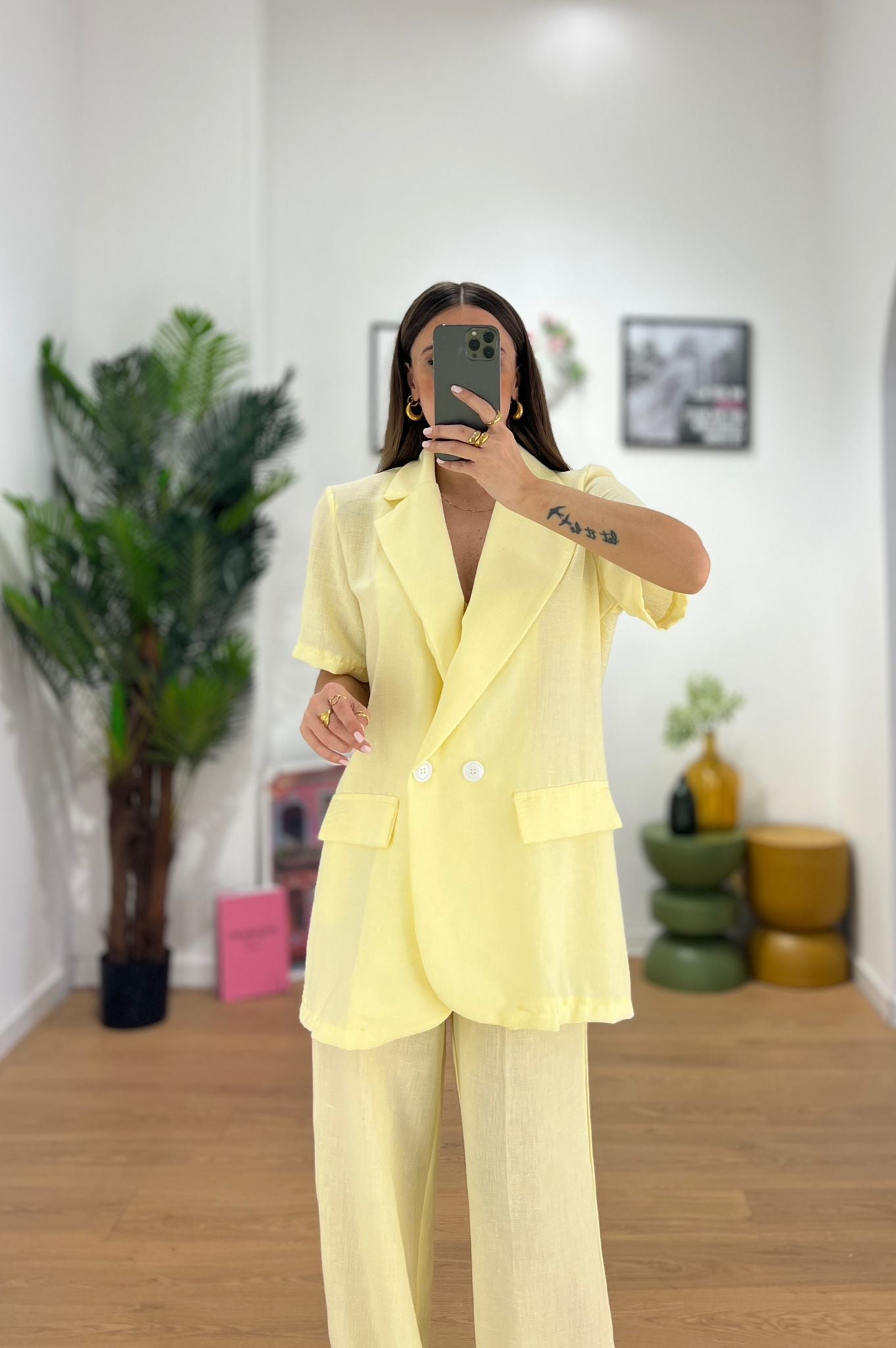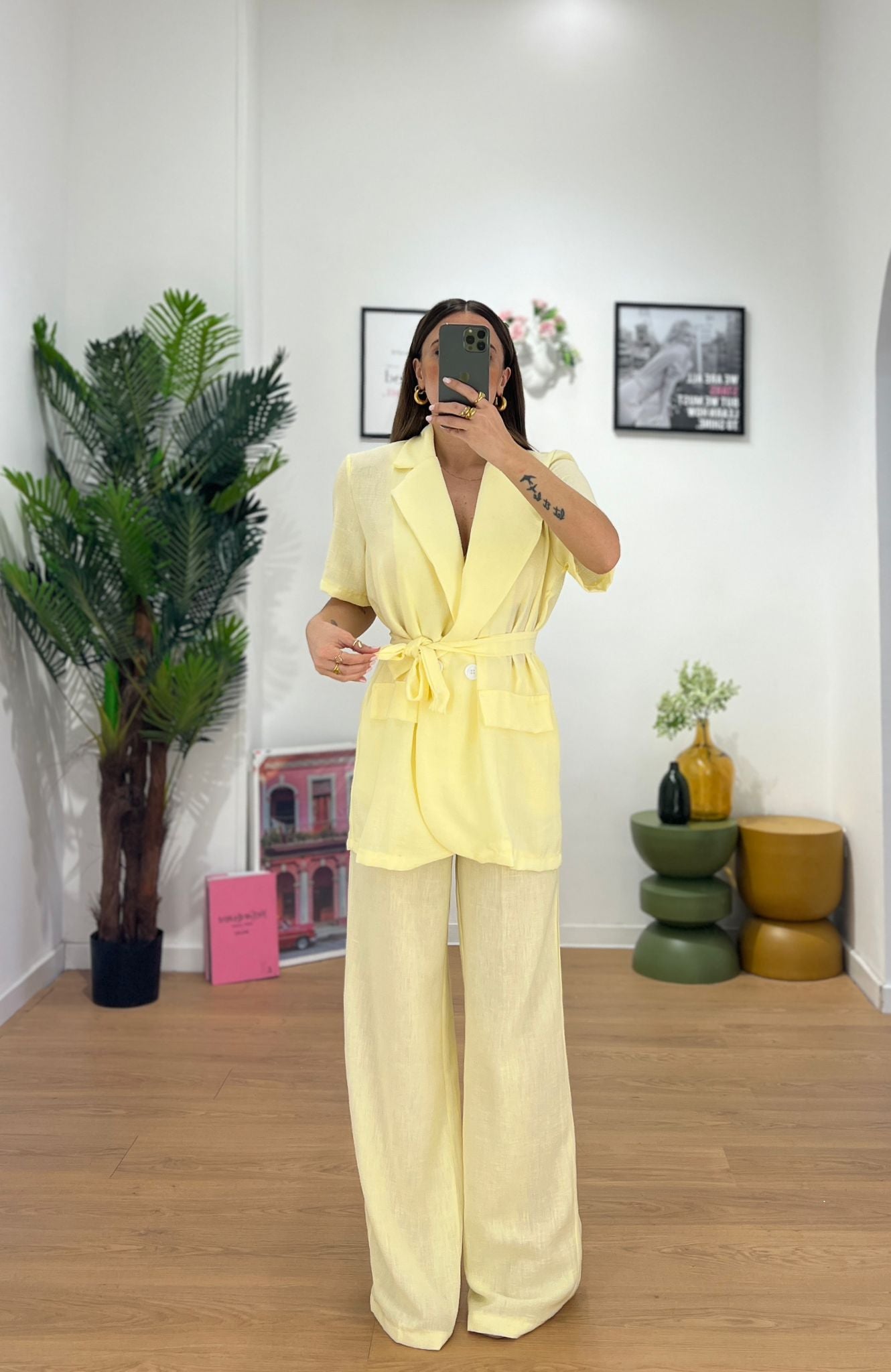 Coordinato da donna in misto lino composto da giacca a doppio bottone e cintura compresa mentre il pantalone ha l elastico sul retro e vestira' bene fino ad una L/XL