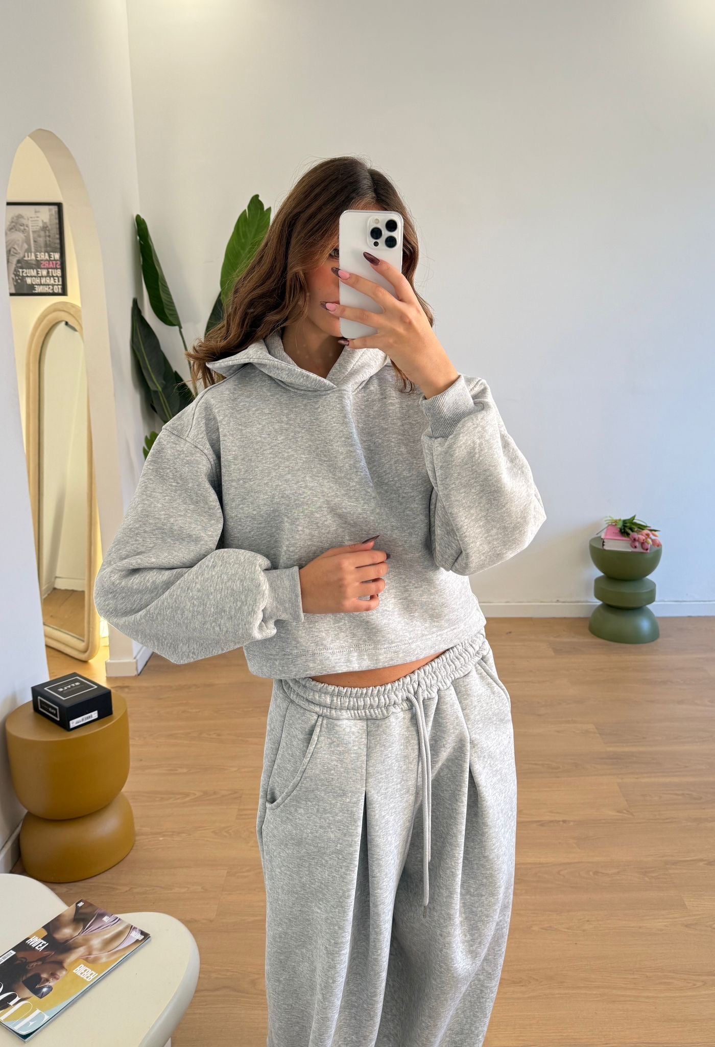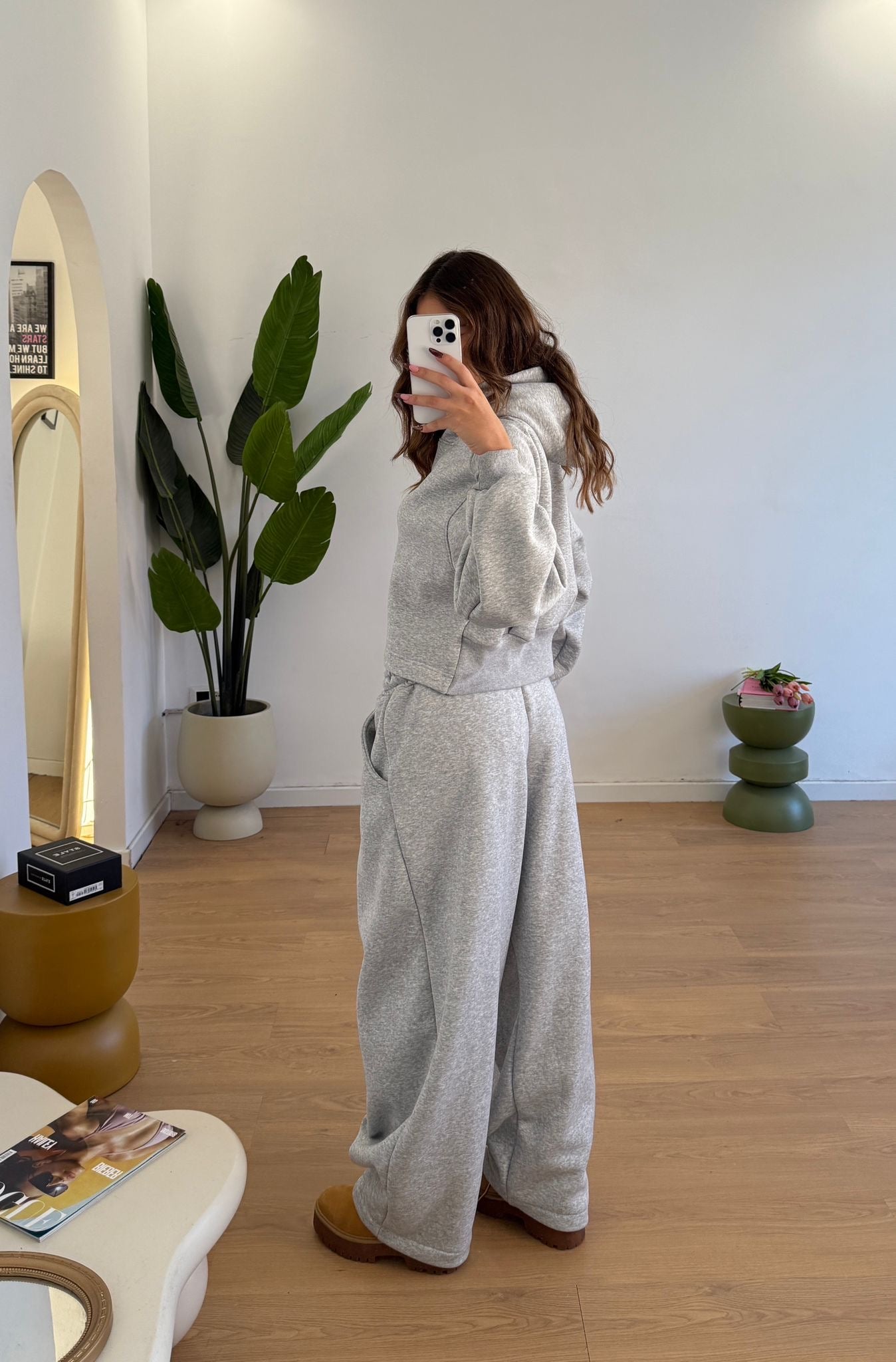 Coordinato da donna felpati internamente, composto da felpa con cappuccio, polsini ed elastico sul retro e da pantalone gamba larga, elastico in vita e laccetti regolabili. Taglia unica, veste bene fino ad una taglia 46.