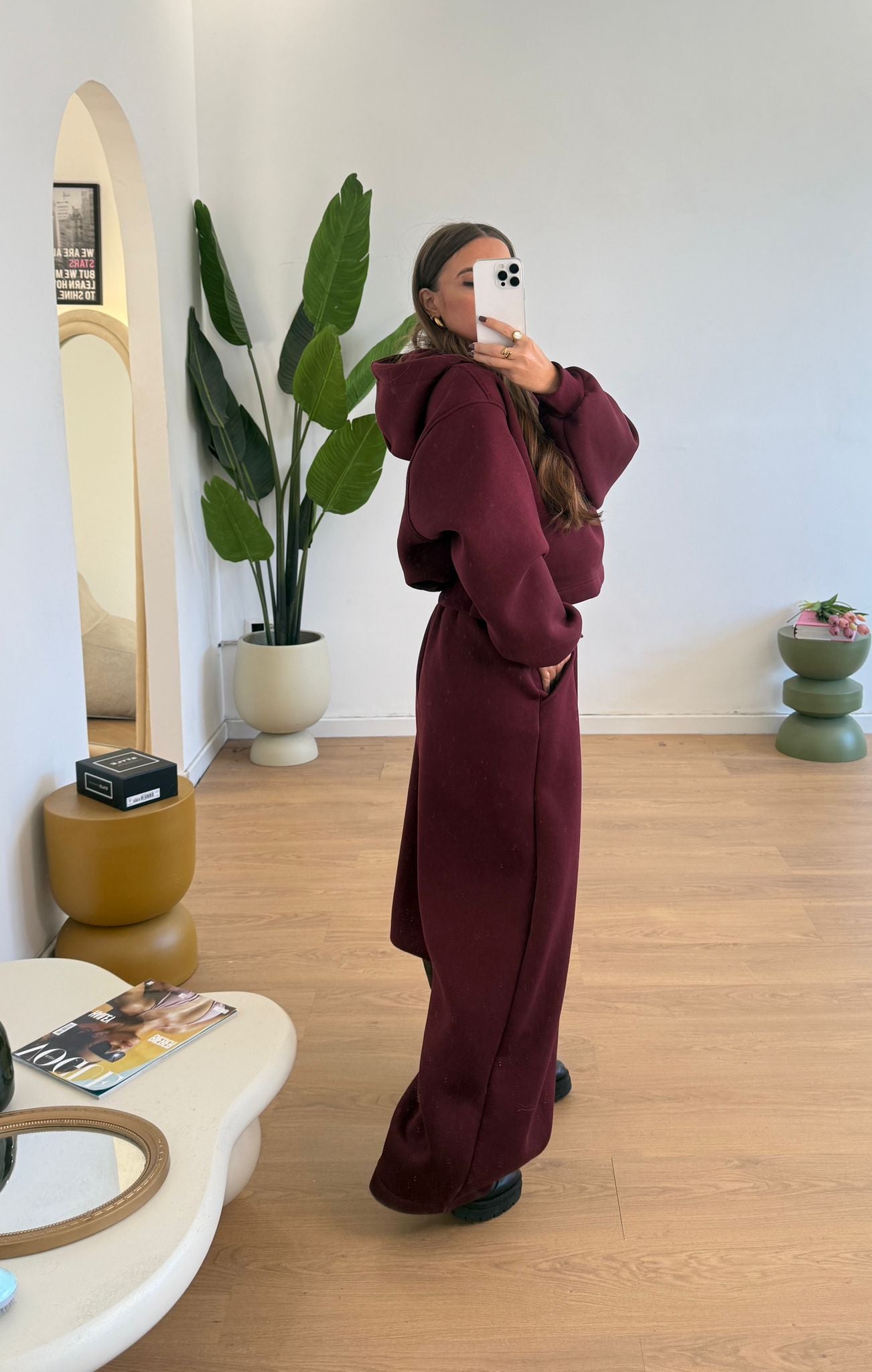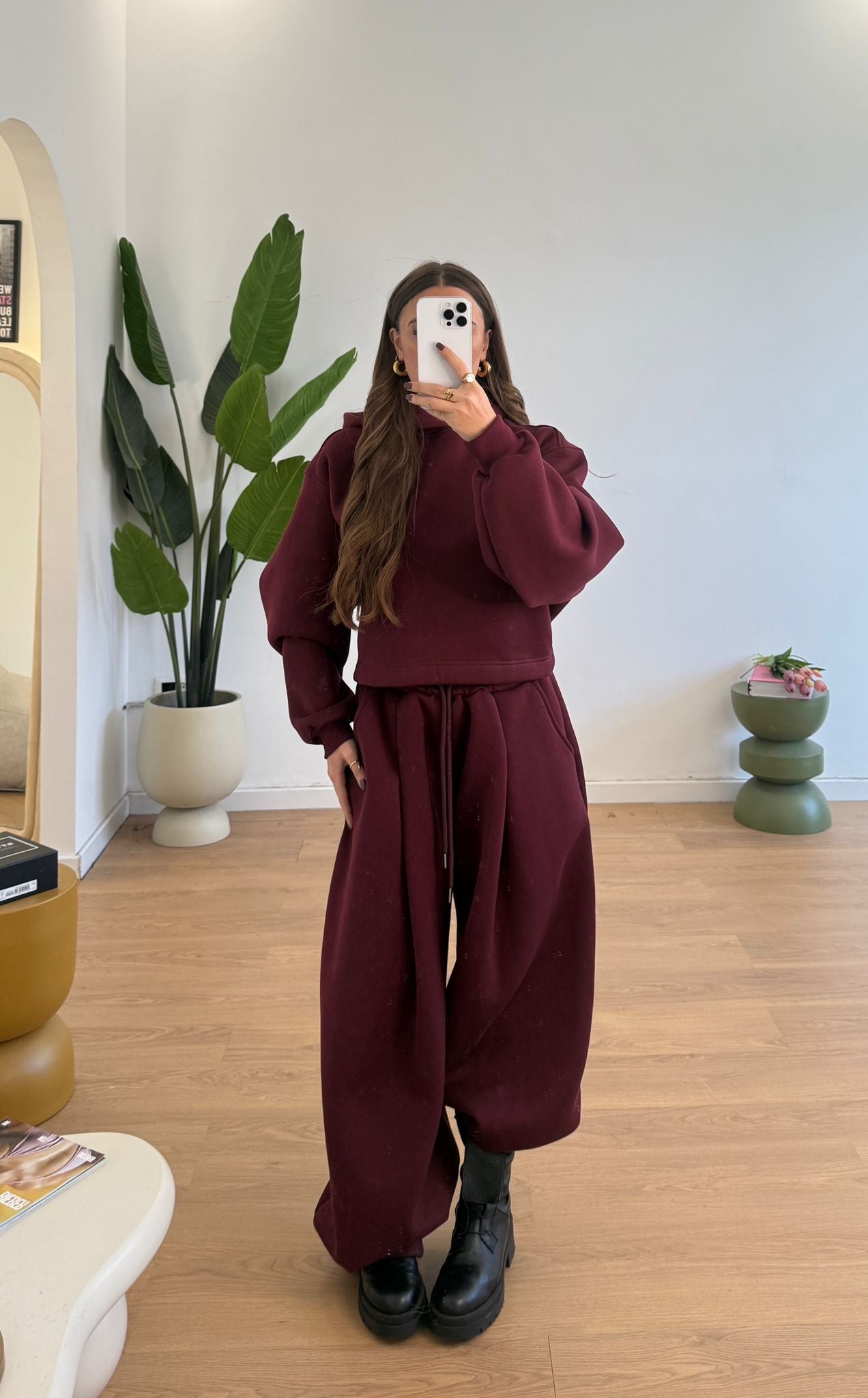 Coordinato da donna felpati internamente, composto da felpa con cappuccio, polsini ed elastico sul retro e da pantalone gamba larga, elastico in vita e laccetti regolabili. Taglia unica, veste bene fino ad una taglia 46.