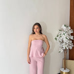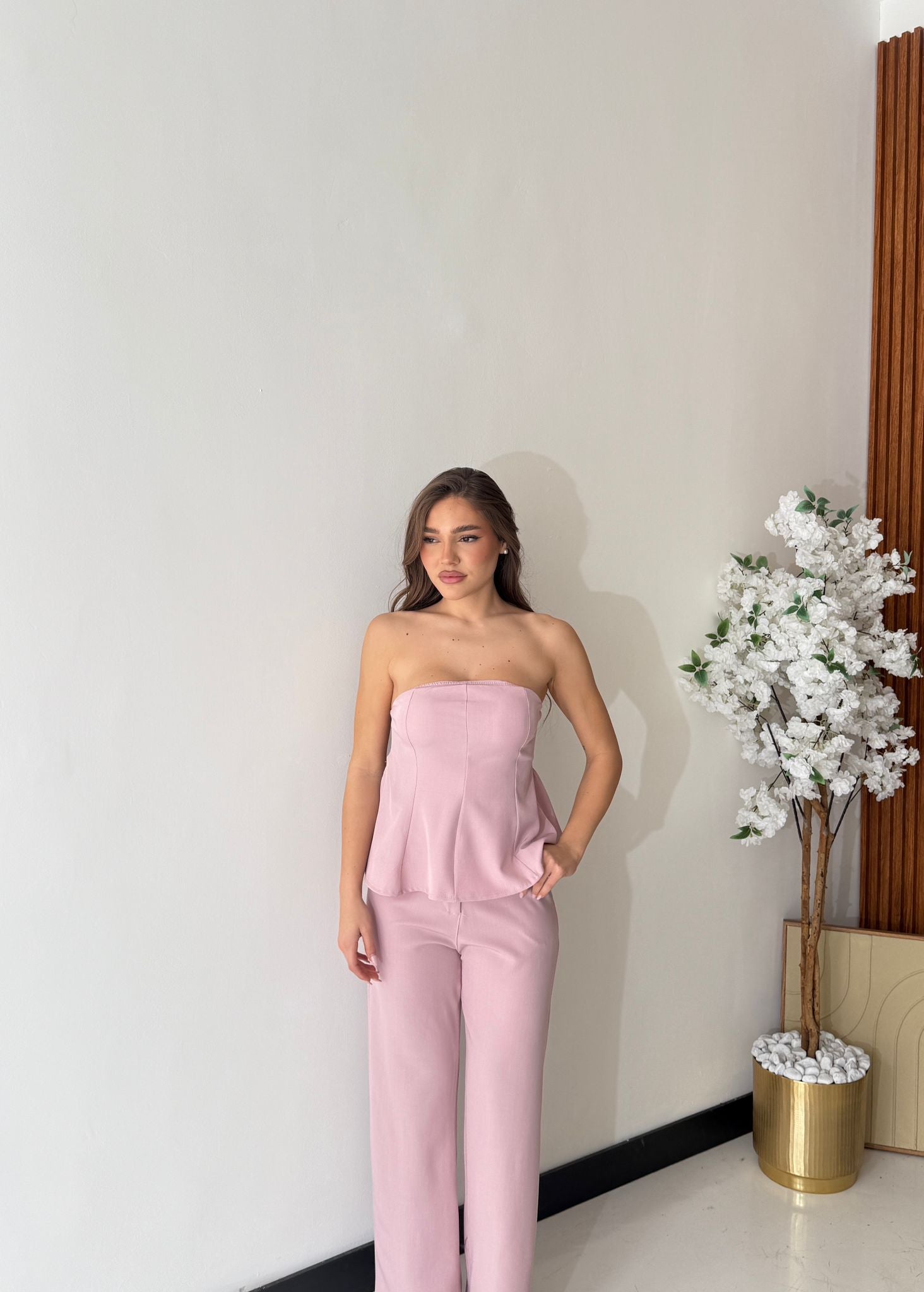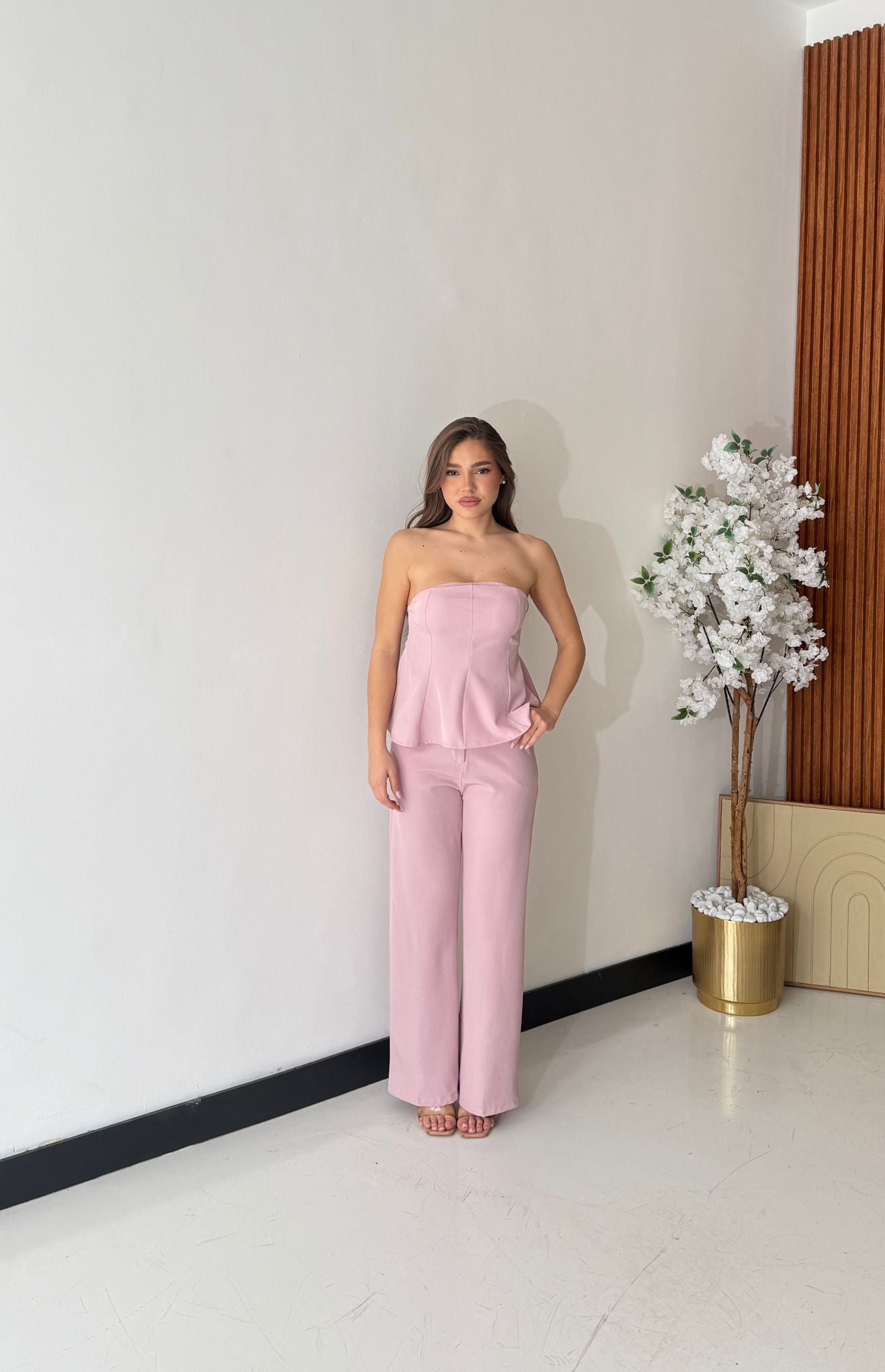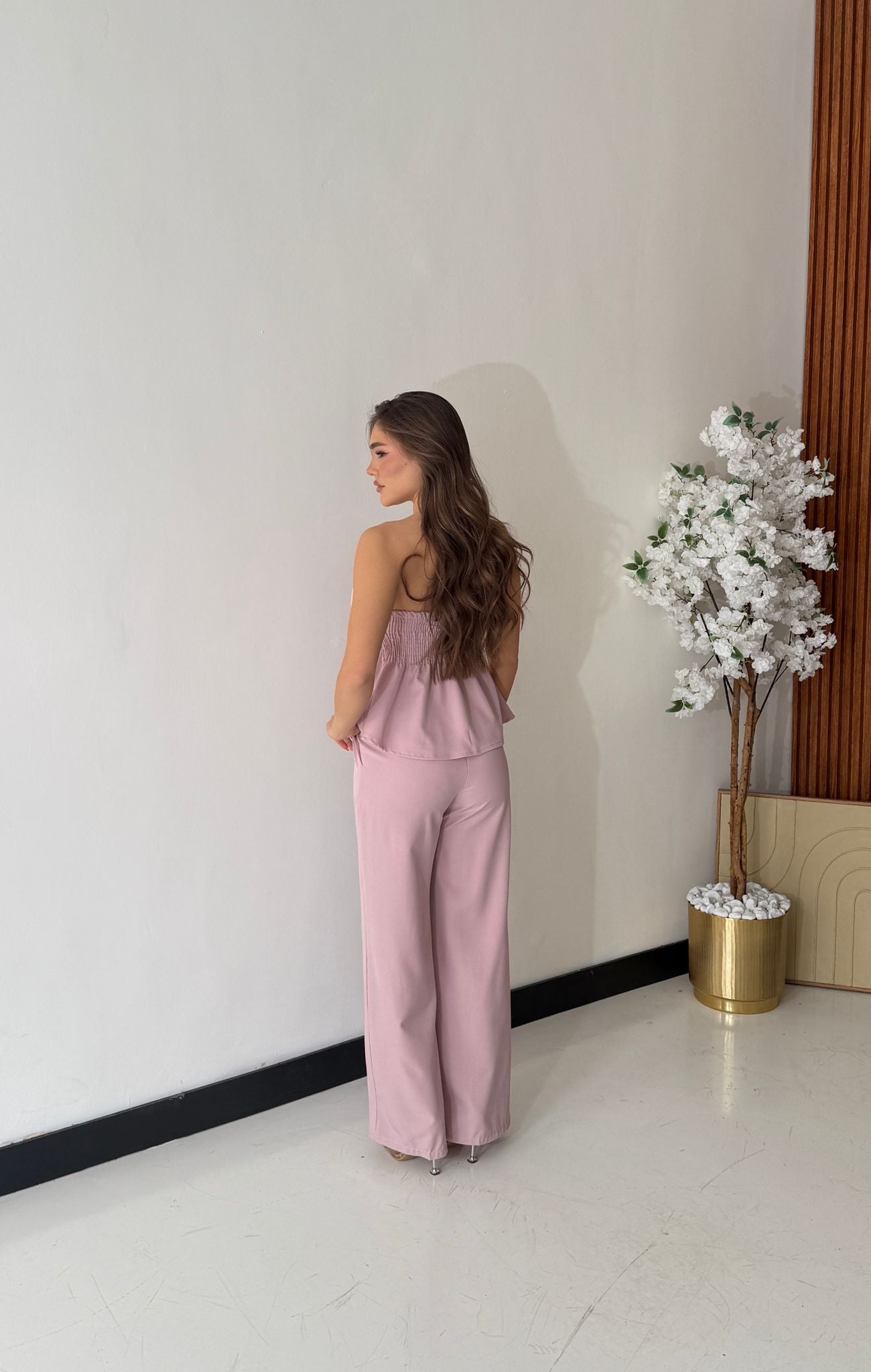 Coordinato in cotone composto da top con coppe imbottite ed elastico sul retro, e da pantalone a gamba larga con elastico in vita sul retro. Taglia unica, veste bene fino ad una taglia M/L. La modella è alta 1,65 e pesa 52/53kg.