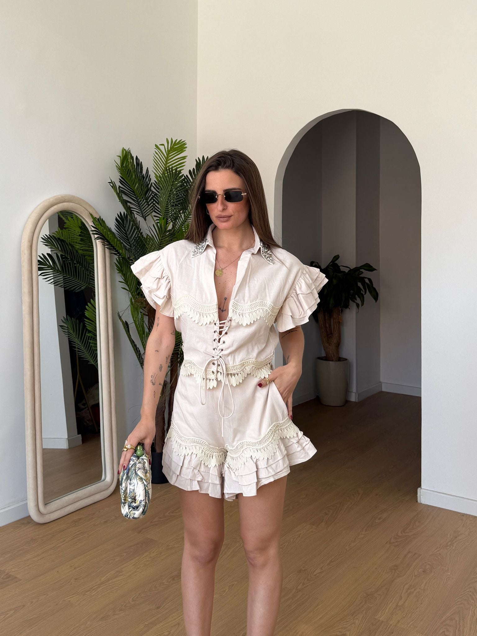 Coordinato da donna composto da camicia con colletto strass e pantaloncino con elastico sul retro in vita, veste regolarmente la propria taglia e Giusy indossa taglia S/M