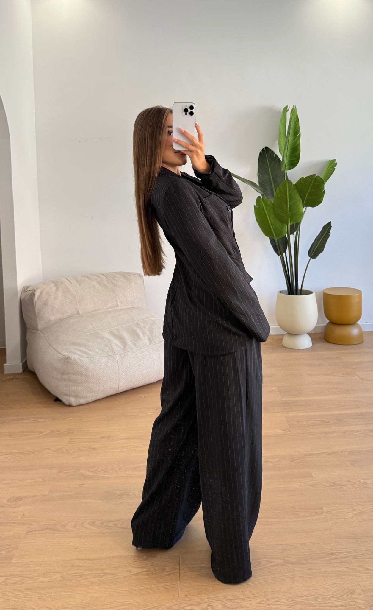 Coordinato da donna gessato composto da giacca crop con spalline imbottite, foderata internamente e pantalone con maniche lastrico in vita sul retro ed elastico sul finale, vestira bene fino ad una 44