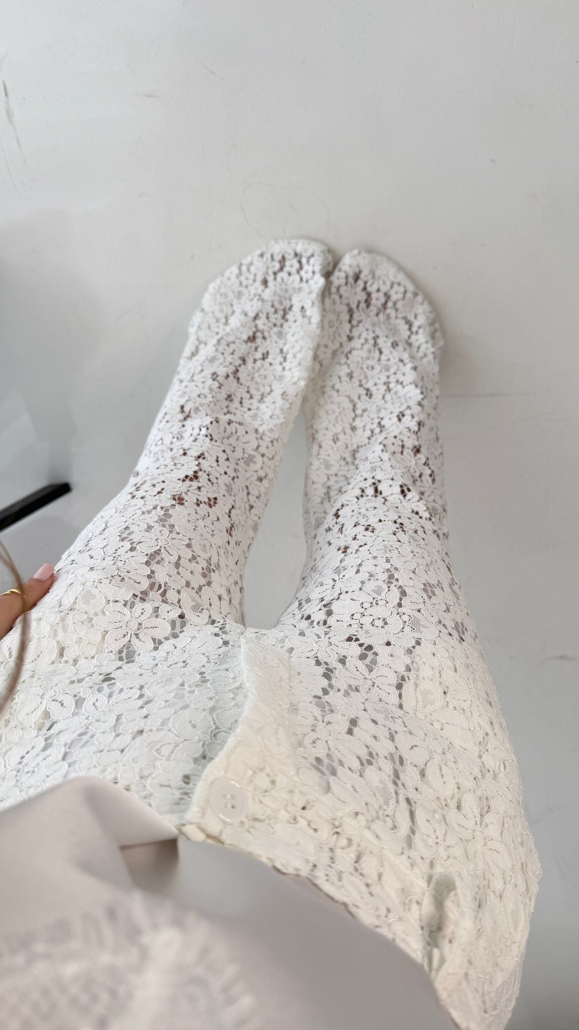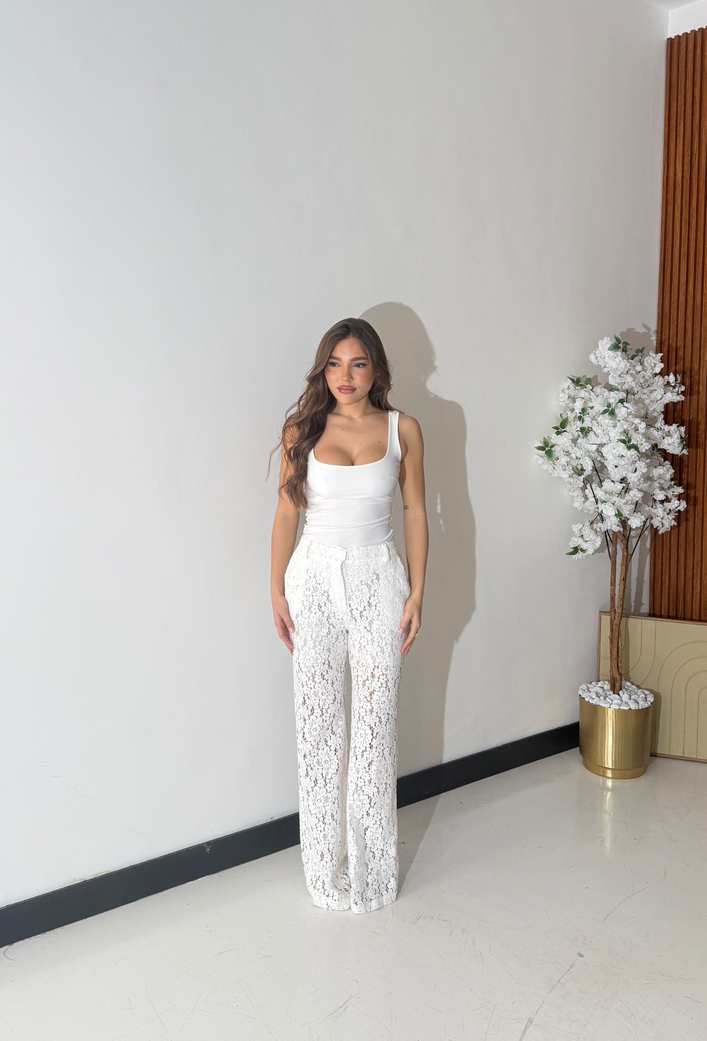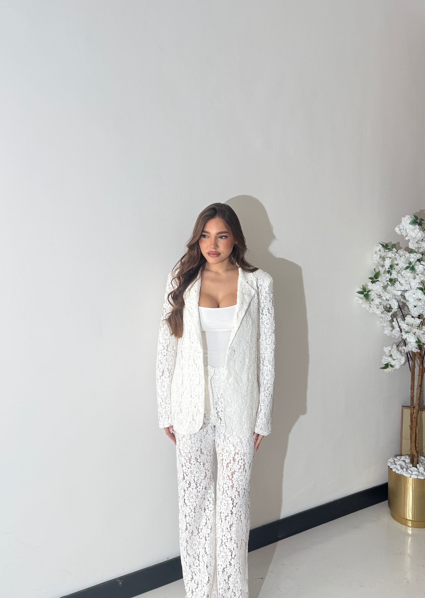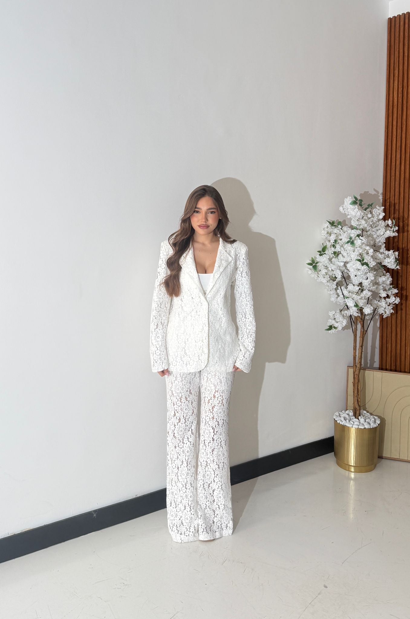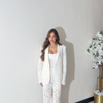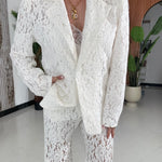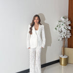 Coordinato completamente ricamato, composto da giacca foderata interamente, spalline imbottite e chiusura a bottone sul davanti, e da pantalone gamba larga, con tasche laterali, shorts interno ed elastico in vita sul retro. Taglia unica, veste bene fino ad una taglia M piena. La modella è alta 1,65 e pesa 52/53kg.