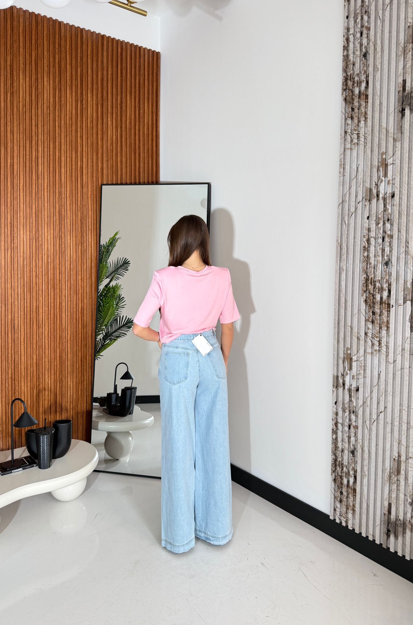 Coordinato in denim in tela fissa composto da giacca con maniche a sbuffo e chiusura zip sul davanti modello avvitato sui fianchi con quattro tasche e pantalone a vita alta, modello palazzo e veste regolarmente la propria taglia ma la modella indossa taglia M per un effetto più morbido ed è alta 1,65 cm e pesa 52/53 kg