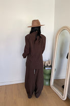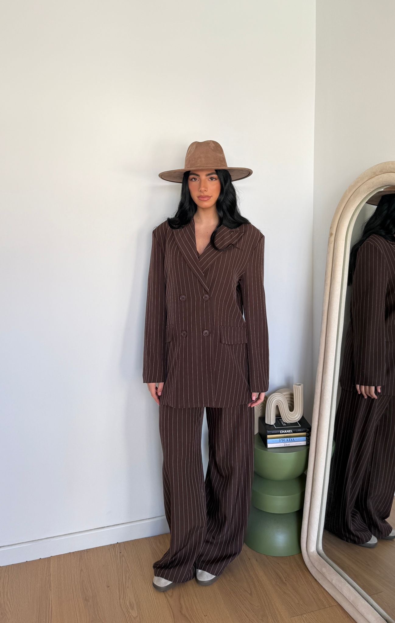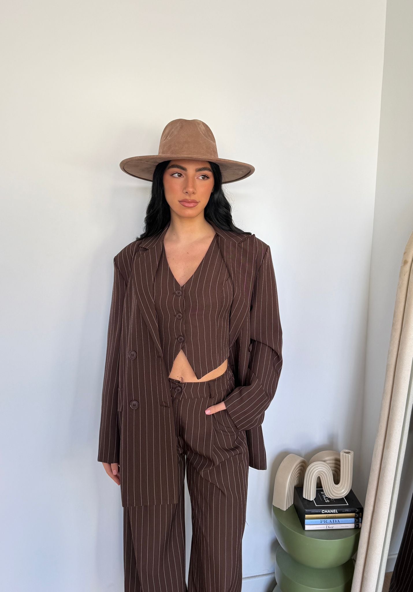 Coordinato da donna gessato composto da giacca con spalline imbottite, foderata internamente, gilet e pantalone con elastico in vita sul retro. Taglia unica, veste bene fino ad una 44.