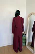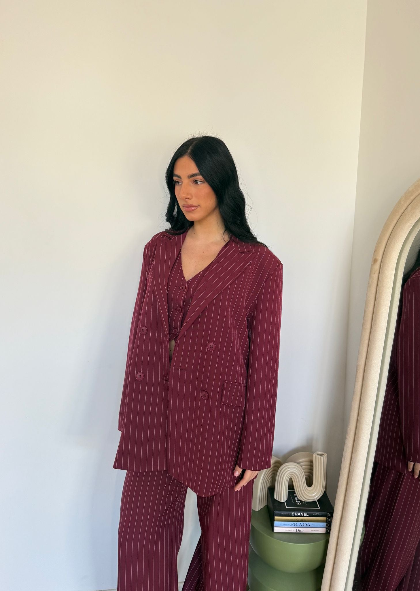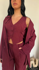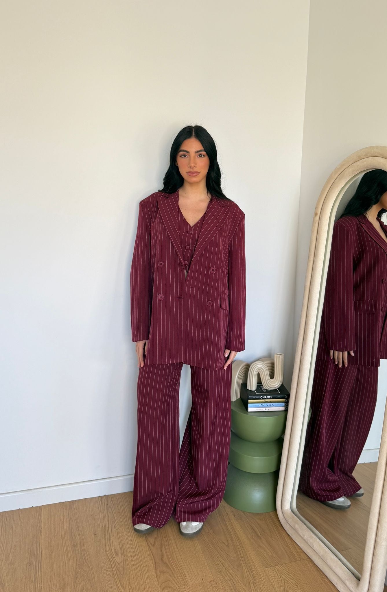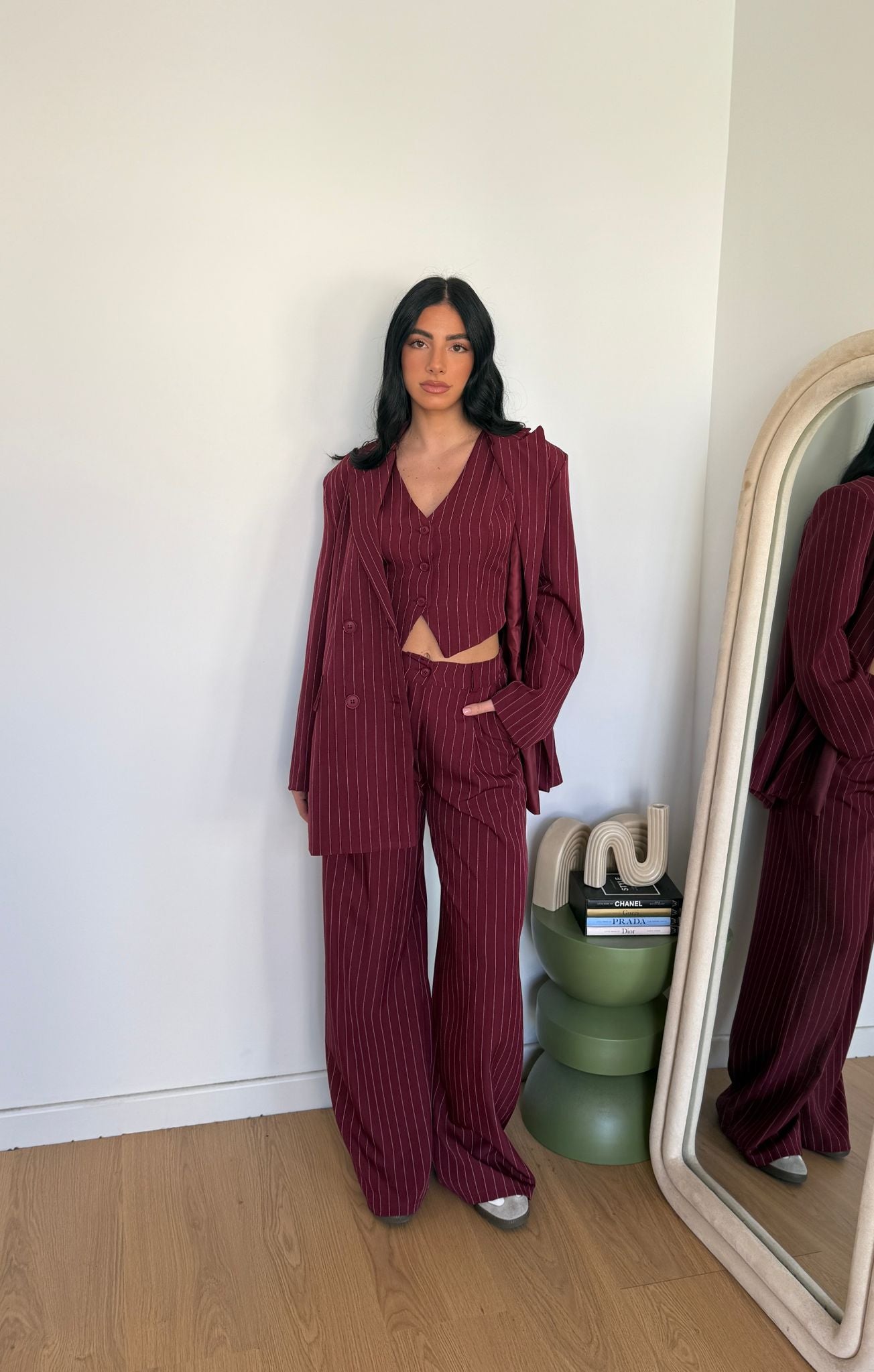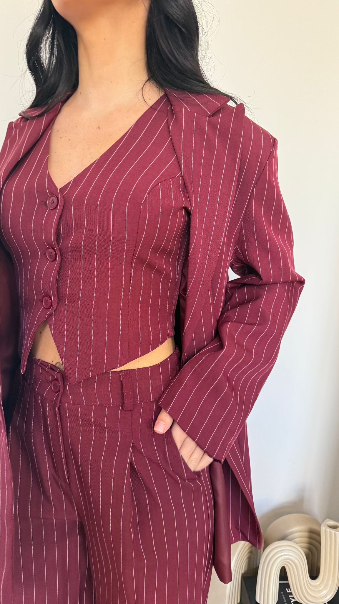 Coordinato da donna gessato composto da giacca con spalline imbottite, foderata internamente, gilet e pantalone con elastico in vita sul retro. Taglia unica, veste bene fino ad una 44.