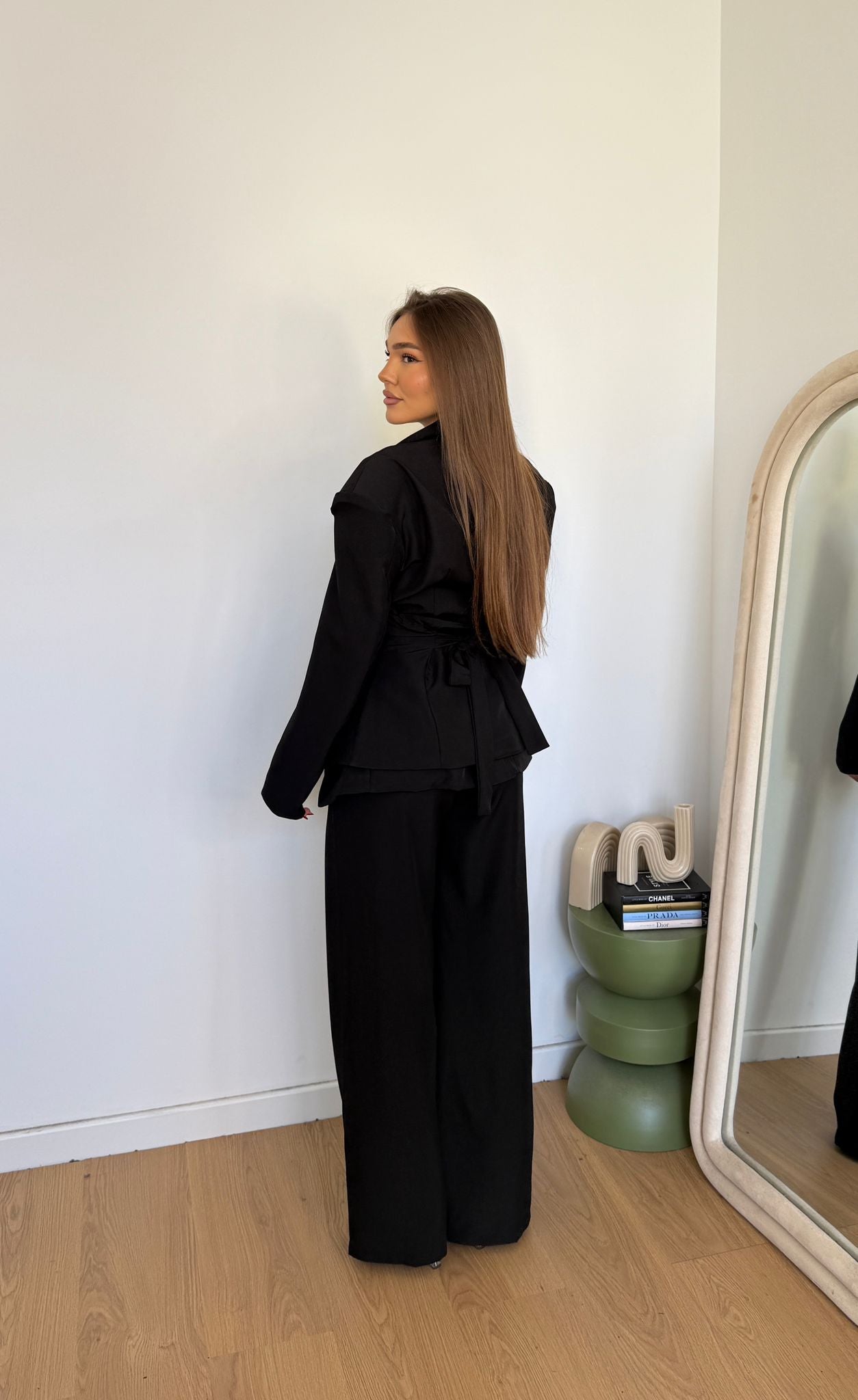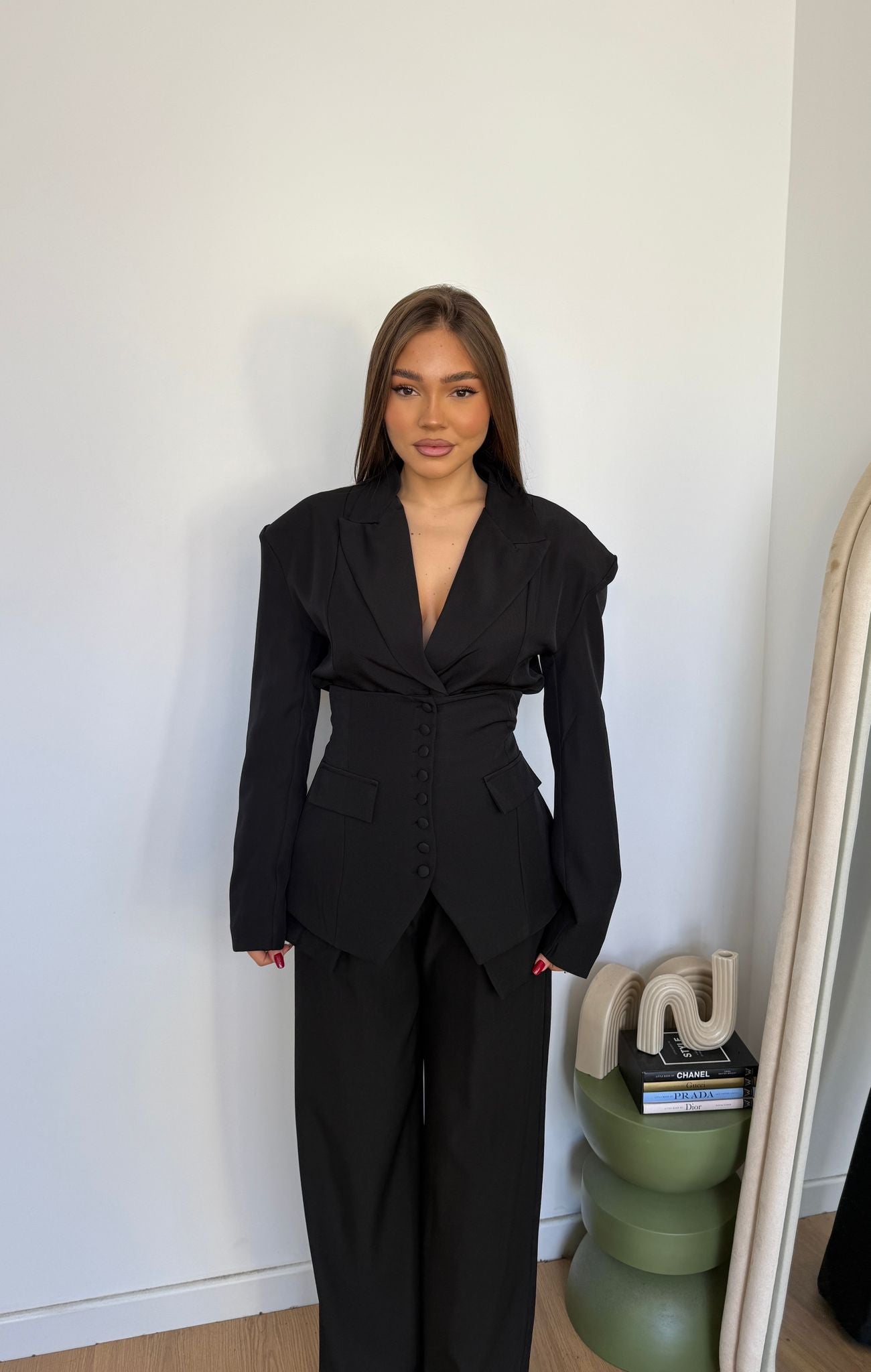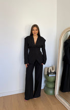 Coordinato da donna composto da giacca con spalline imbottite e foderar internamente, corsetto e pantalone con elastico in vita e vestirà bene fino ad una M/L