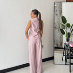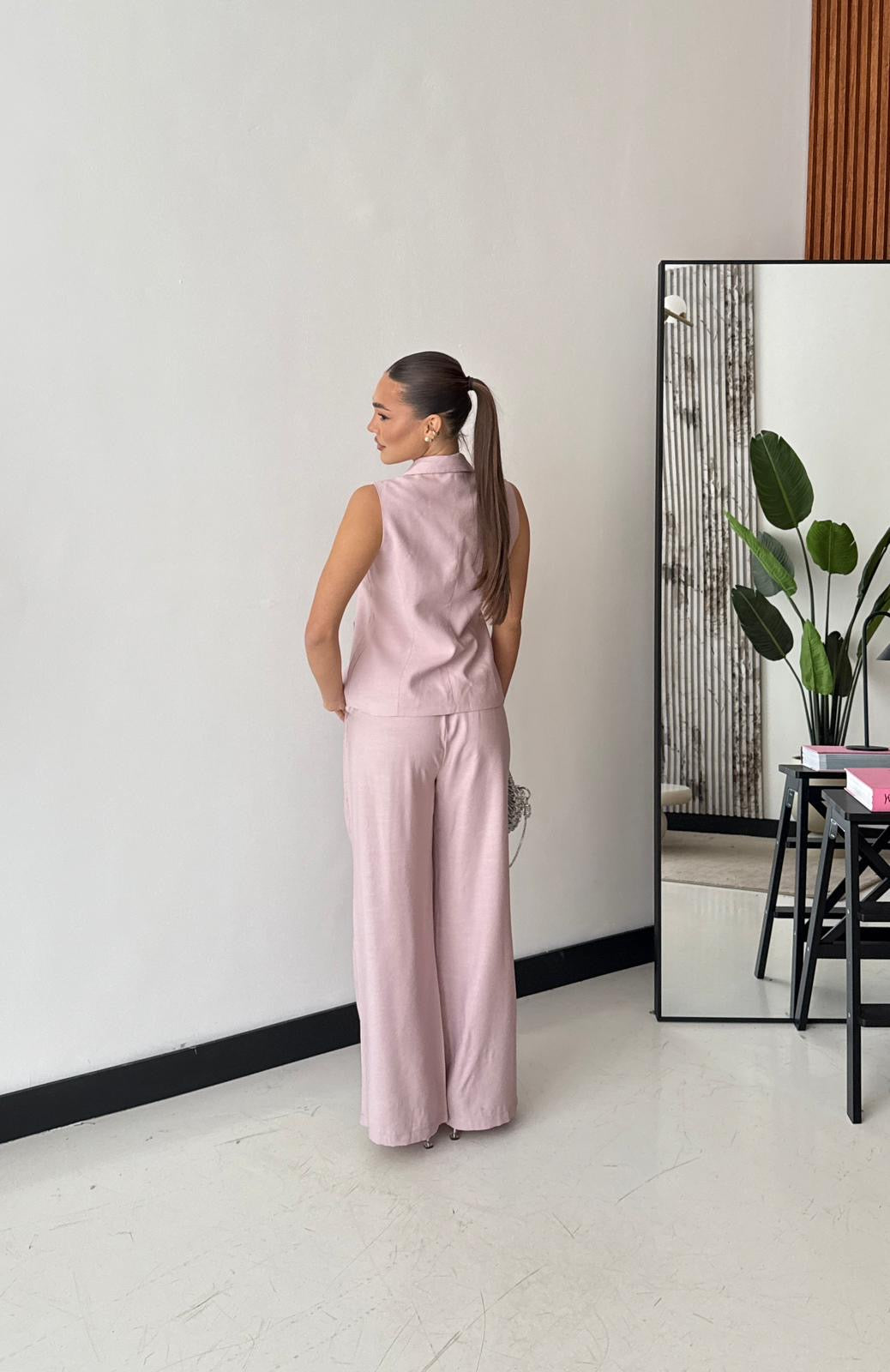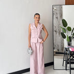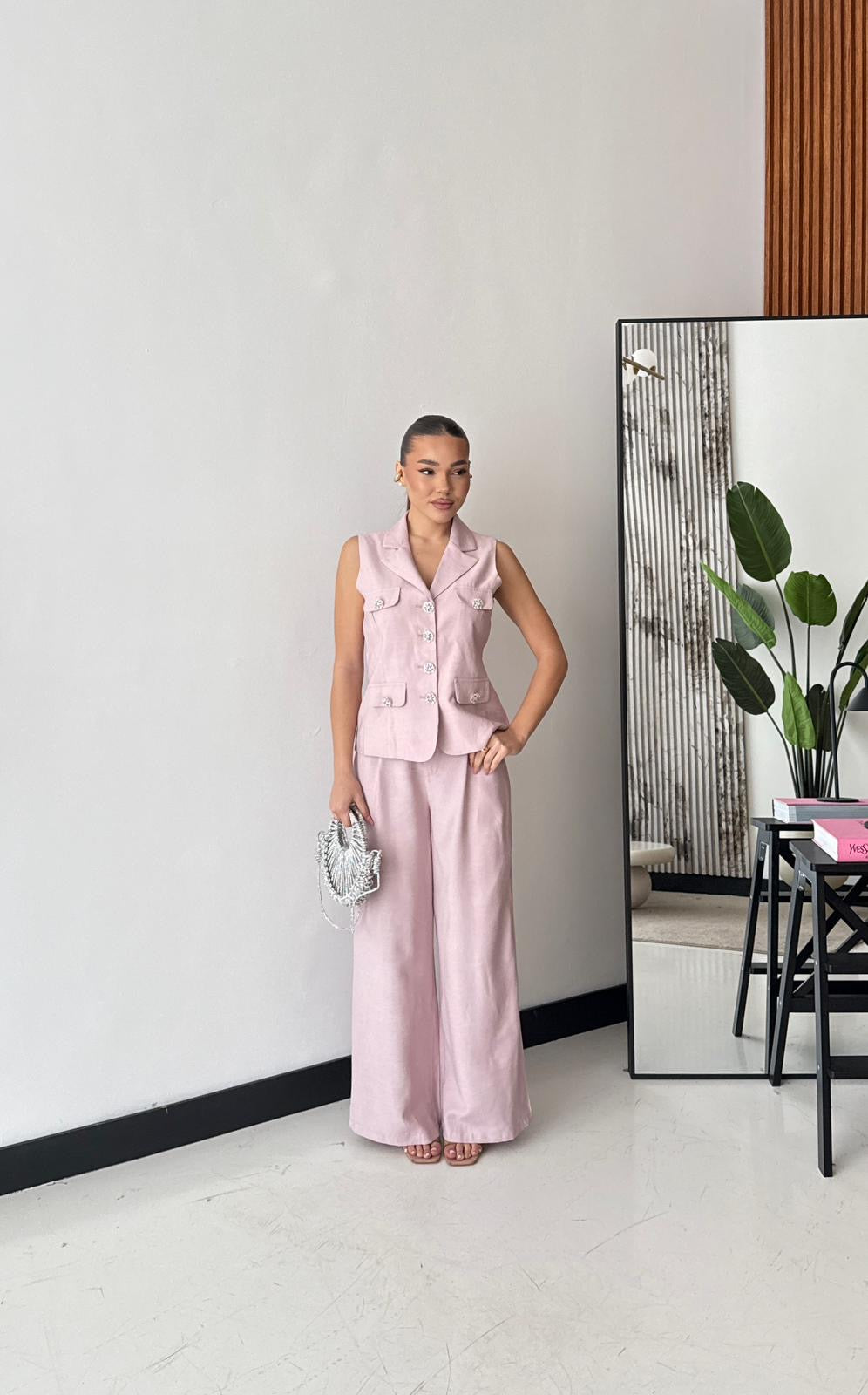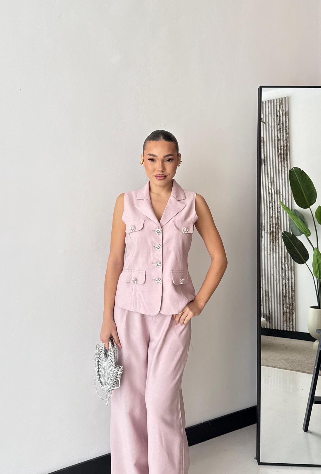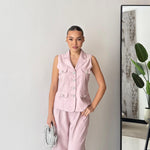 Coordinato composto da gilet, foderato internamente, con chiusura a bottoni gioiello sul davanti, e da pantalone a gamba larga, con tasche laterali, elastico in vita sul retro e chiusura a bottone sul davanti. Veste regolarmente la propria taglia, la modella indossa taglia S/M. La modella è alta 1,65 e pesa 52/53kg.