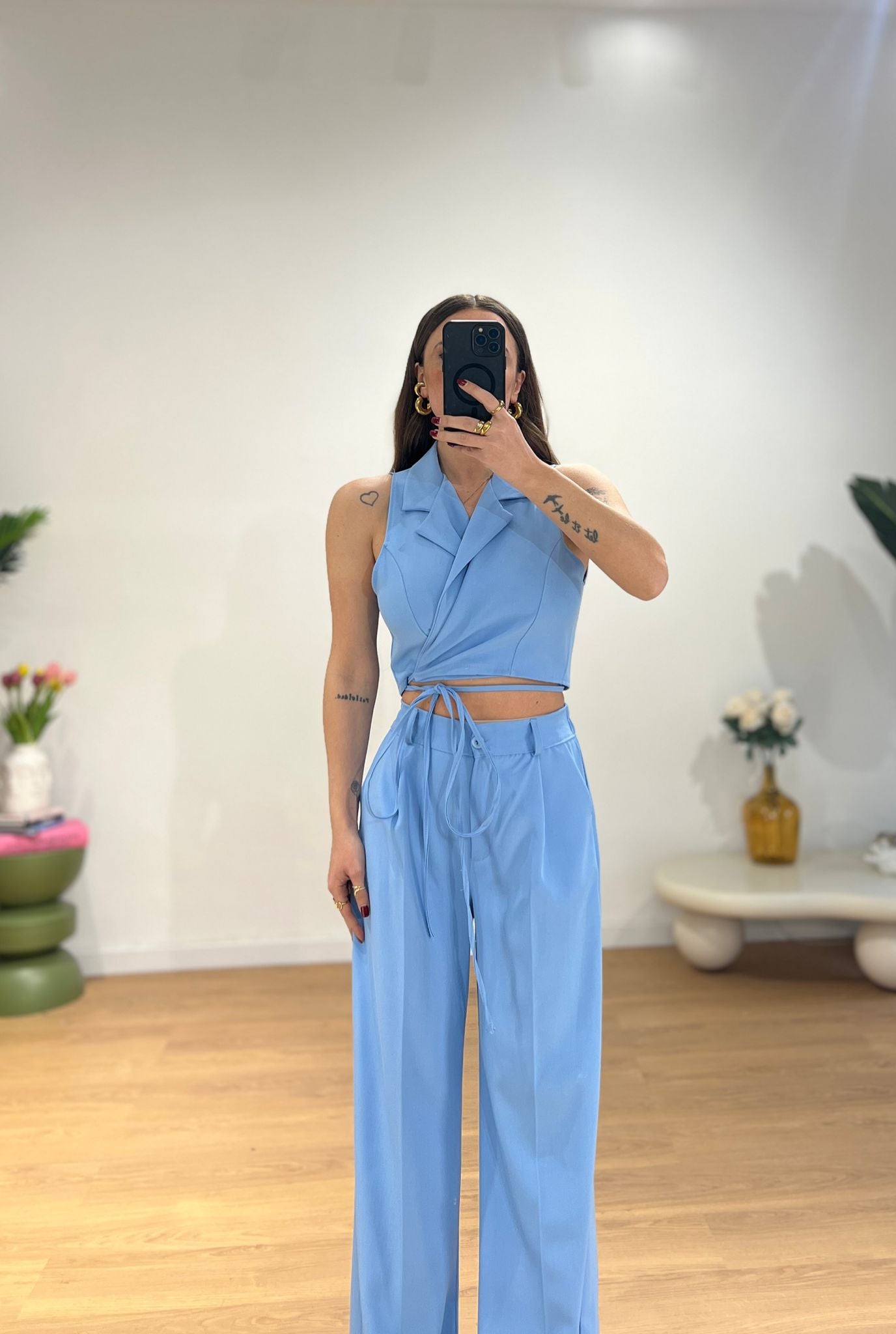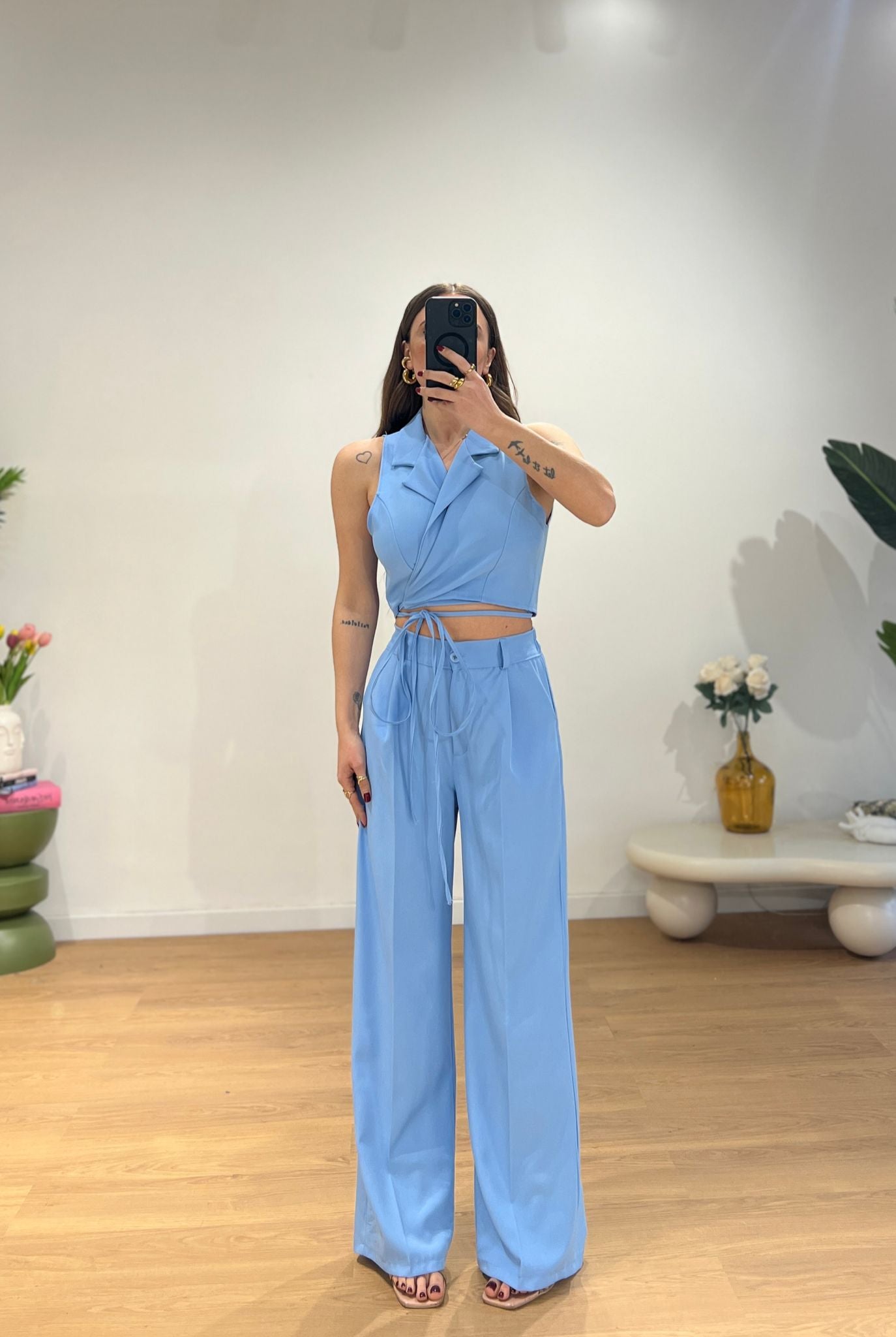 Coordinato da donna tessuto misto lino composto da blusa ad intreccio regolabile con laccio mentre il pantalone ha l elastico in vita sul retro e vestirà bene fino ad una M/L